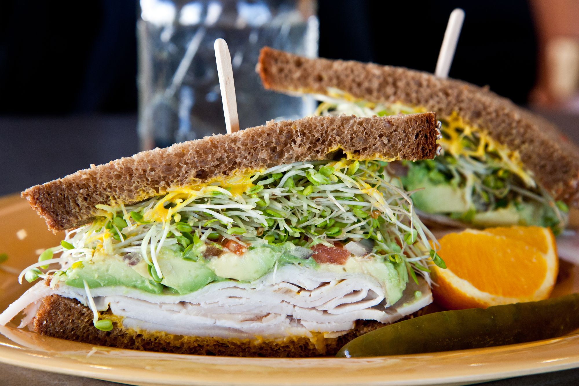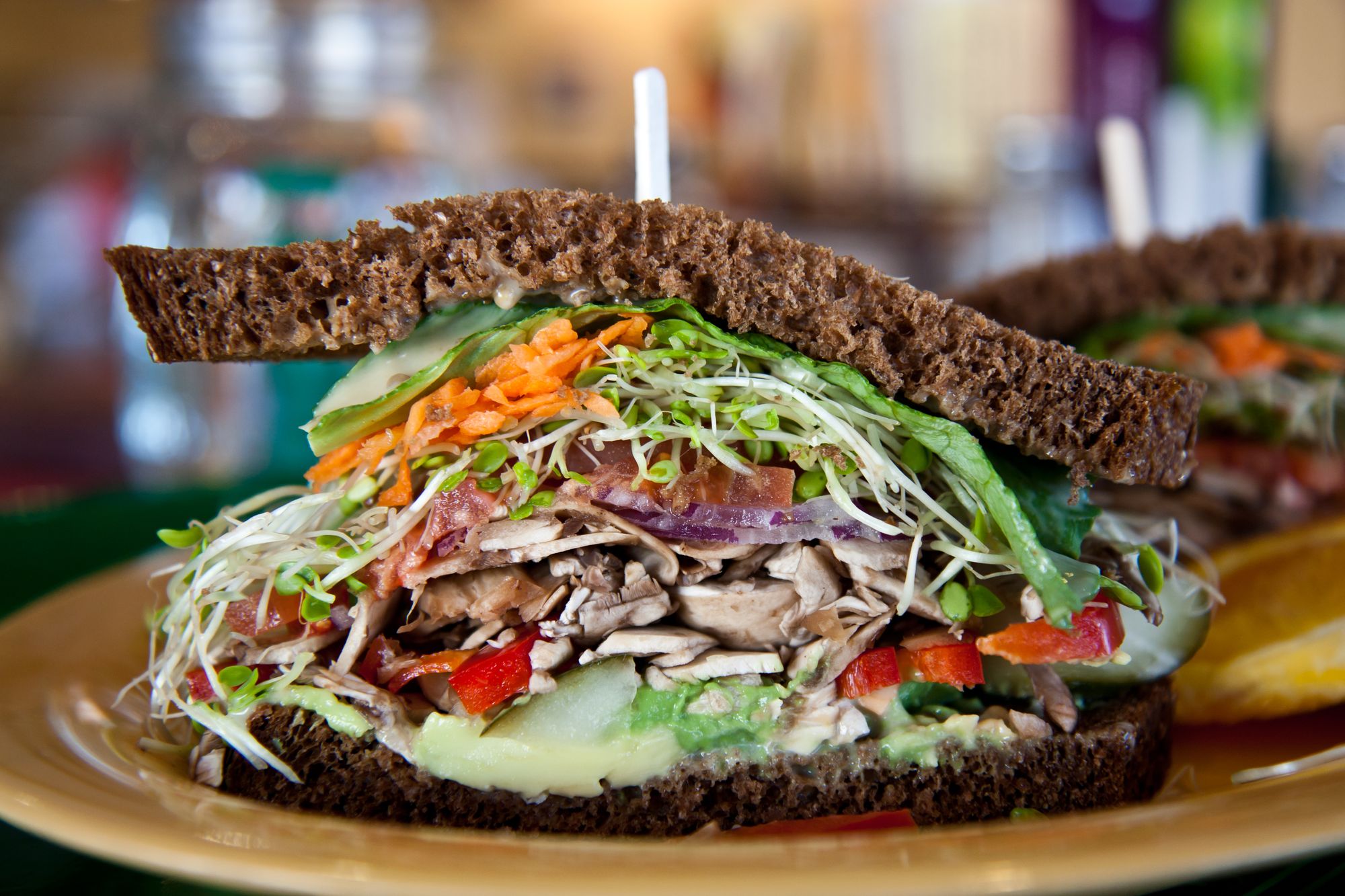 Sandwich Erik's DeliCafé, Milpitas, California Erik's DeliCafé, Milpitas, California (Feb 2012) 148 N Milpitas Blvd, Milpitas, CA 95035Feb 2012A La Carte Lunch MenuPilgrim's Progress, Farmer's Market (Fresh avocado, sunflower seeds, fresh mushrooms, grated carrots, sliced pickles, red bell peppers, red onions, tomatoes, sprouts and lettuce with sweet hot mustard and Molasses Wheat Bread)Tomato Basil Bisque, Water, Bread Share