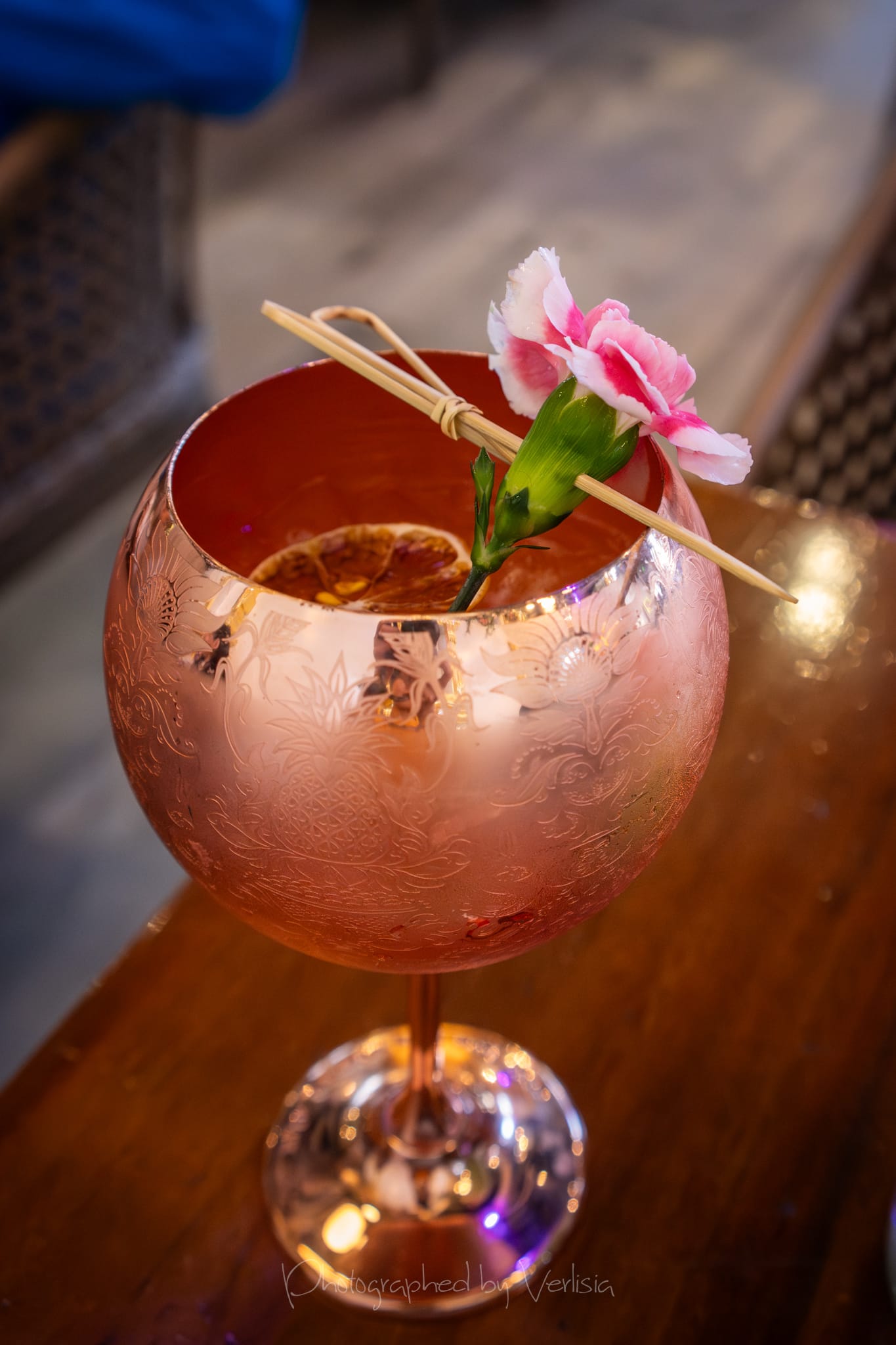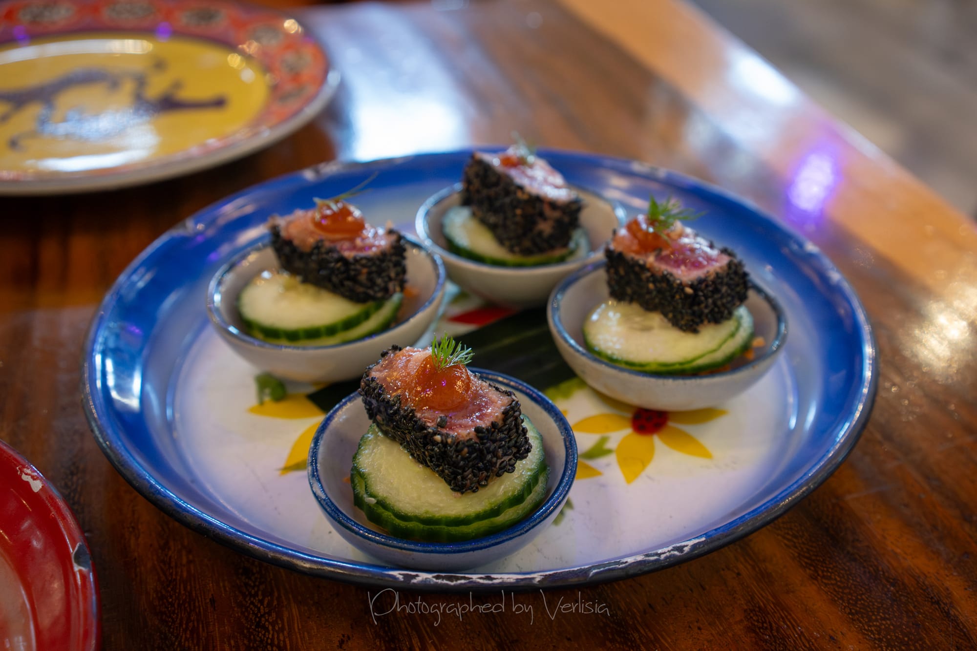 Cocktail - Whiskey Blossom (Jameson orange, lemon St.Germain elderflower); Ahi Scoops (Pan-seared sesame-crusted Ahi Tuna, cucumber, seaweed salad, dill, lemongrass, spicy chili lime)