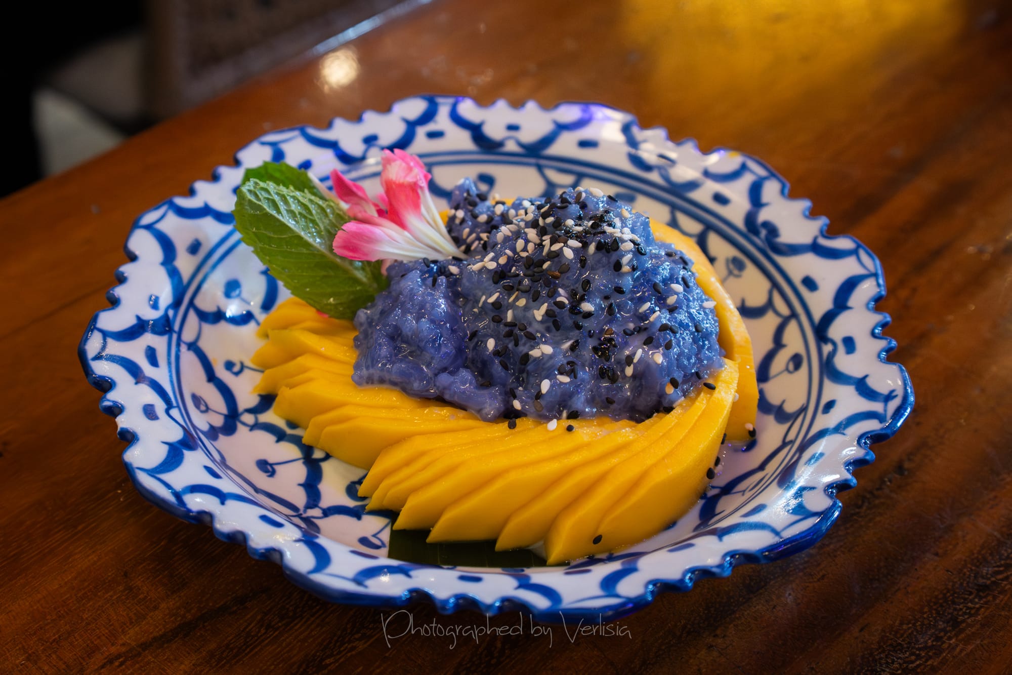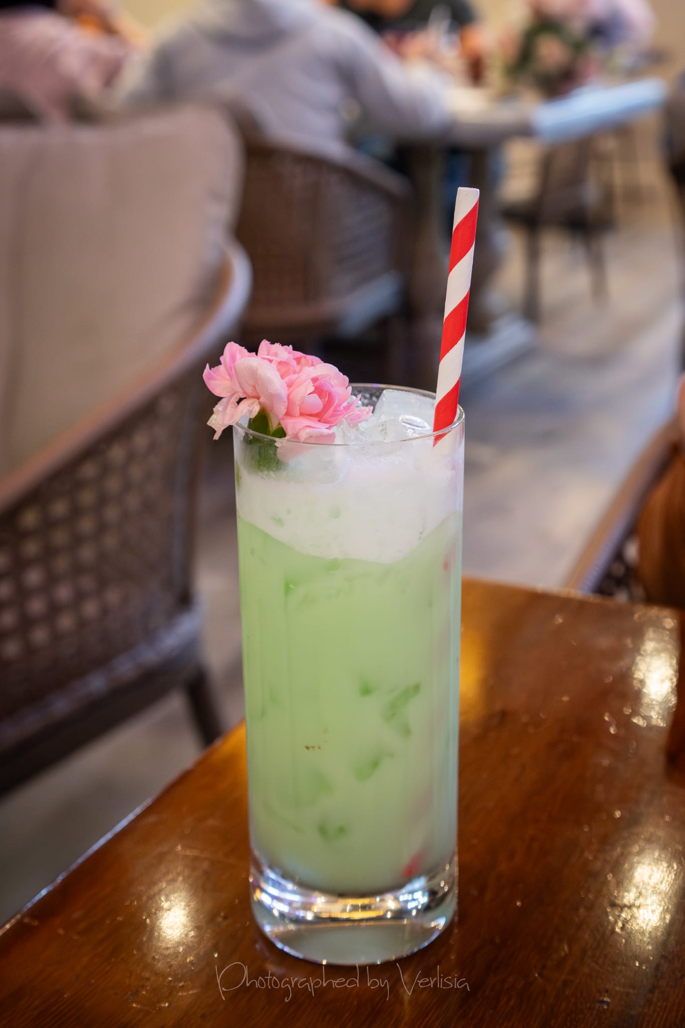 Thai Fish Cake (Fried white fish paste with red curry, kaffir lime, green bean. Served with cucumber, peanut, sweet chili sauce); Alcohol Free Cocktail - All Day I Dream (Aromatic Pandan Colada. Homemade Pandan Simple. Lime. Coconut Cream.)