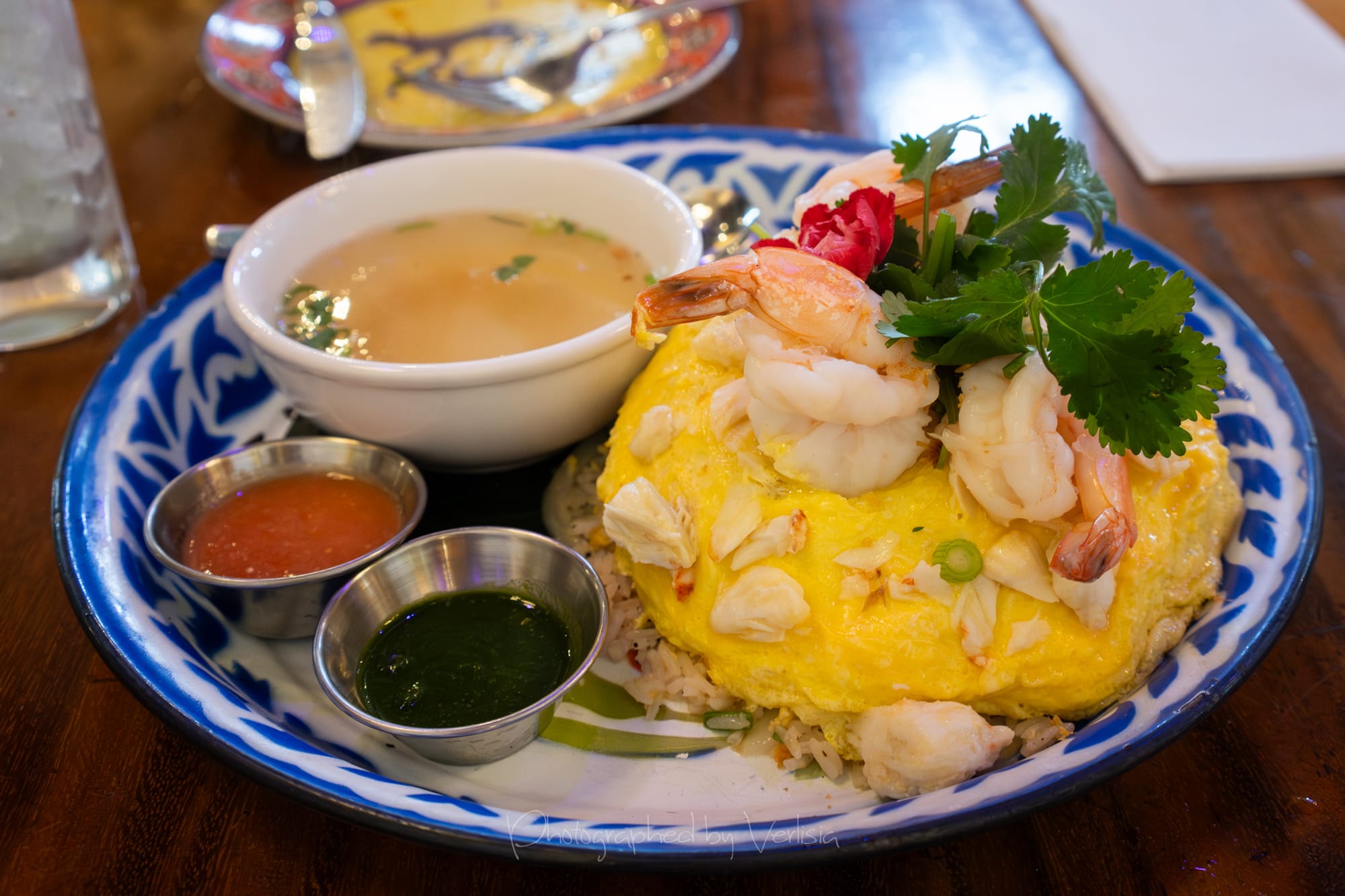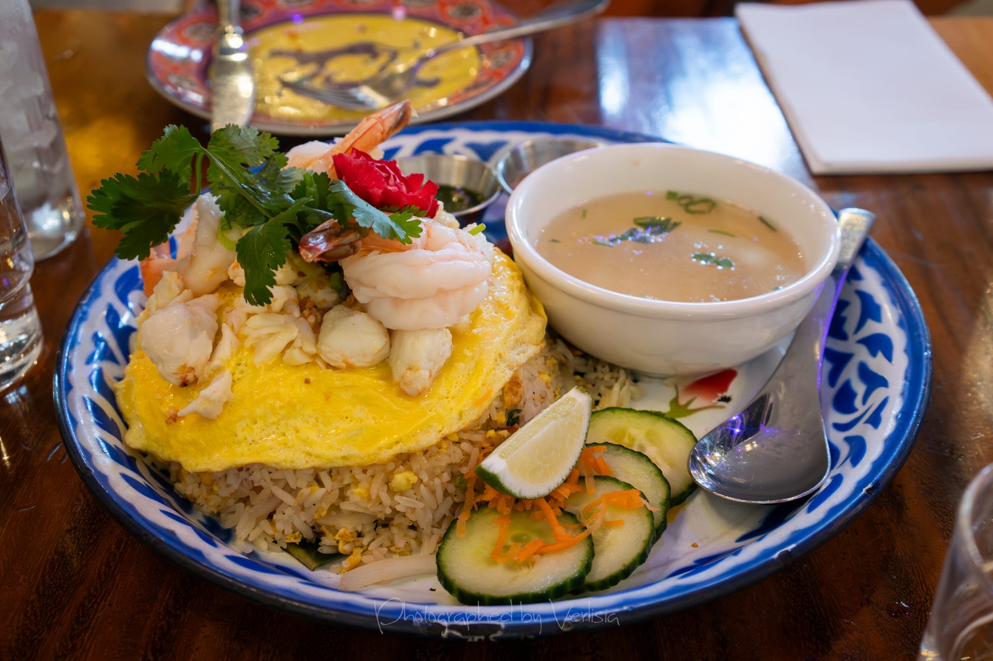 Crab Fried Rice (Jumbo lump crab meat, shrimps, double eggs, twice-cooked rice, shrimp paste, onion, tomato, cilantro, fried garlic and shallots. Served with bone broth)
