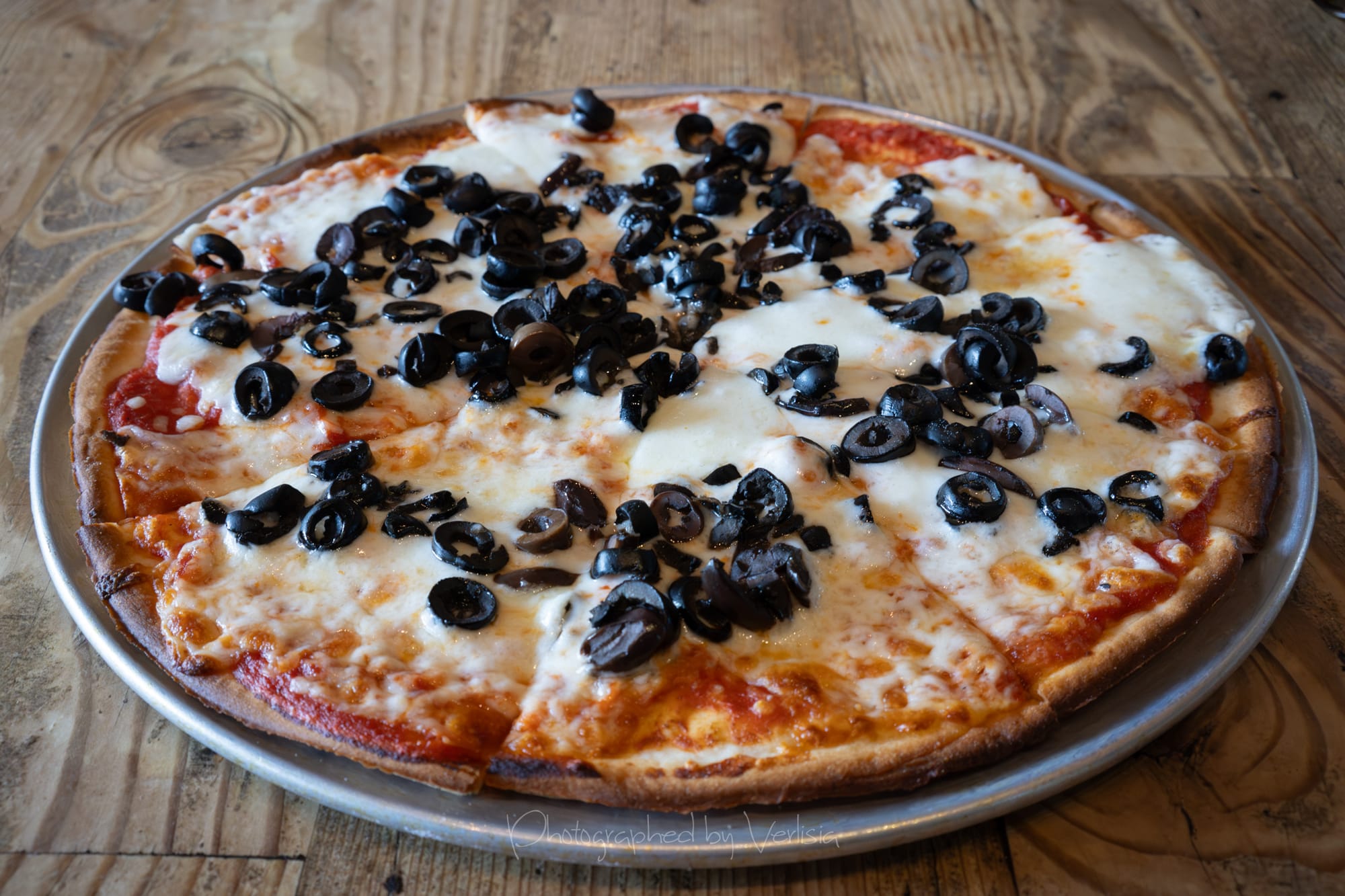 Wine by the Glass - Sean Minor Chardonnay; Olive Pizza on Gluten Free Dough (mission & kalamata olive, mozzarella, tomato sauce, roasted garlic)