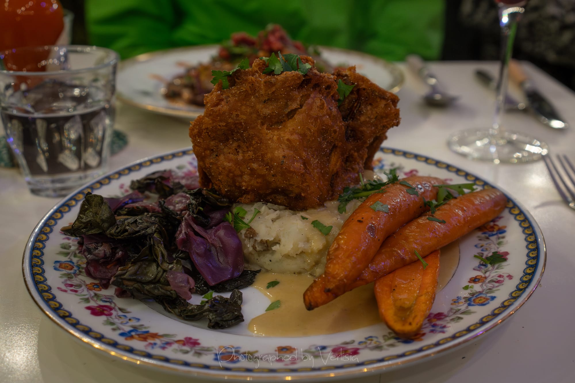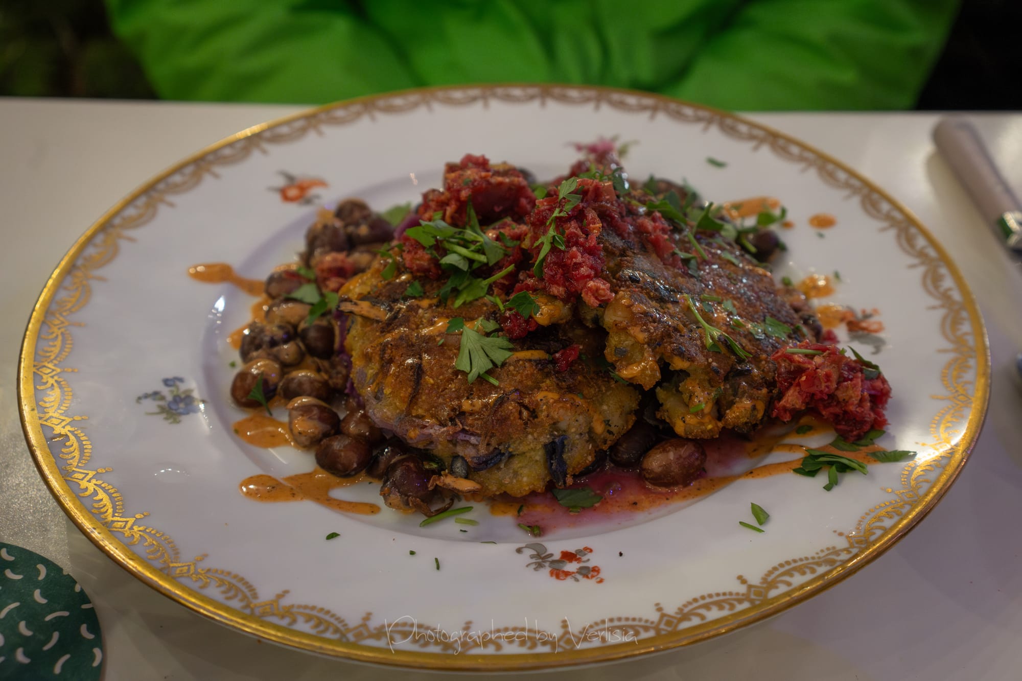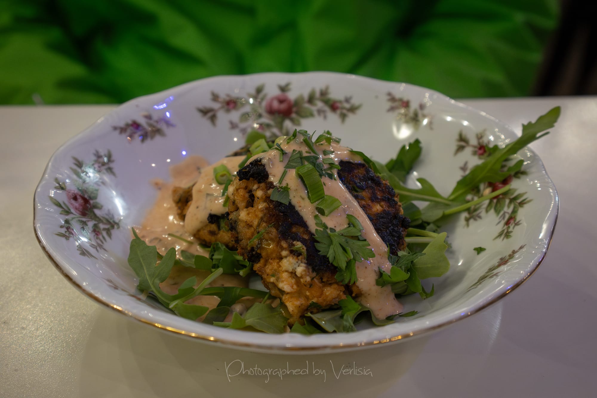Cabbie Patties (Tofu, Local Seaweed, Remoulade, Greens); Hominy Griddle Cakes (Purple Potato, Mother Stallard Beans, Pickled Green Tomato Relish)