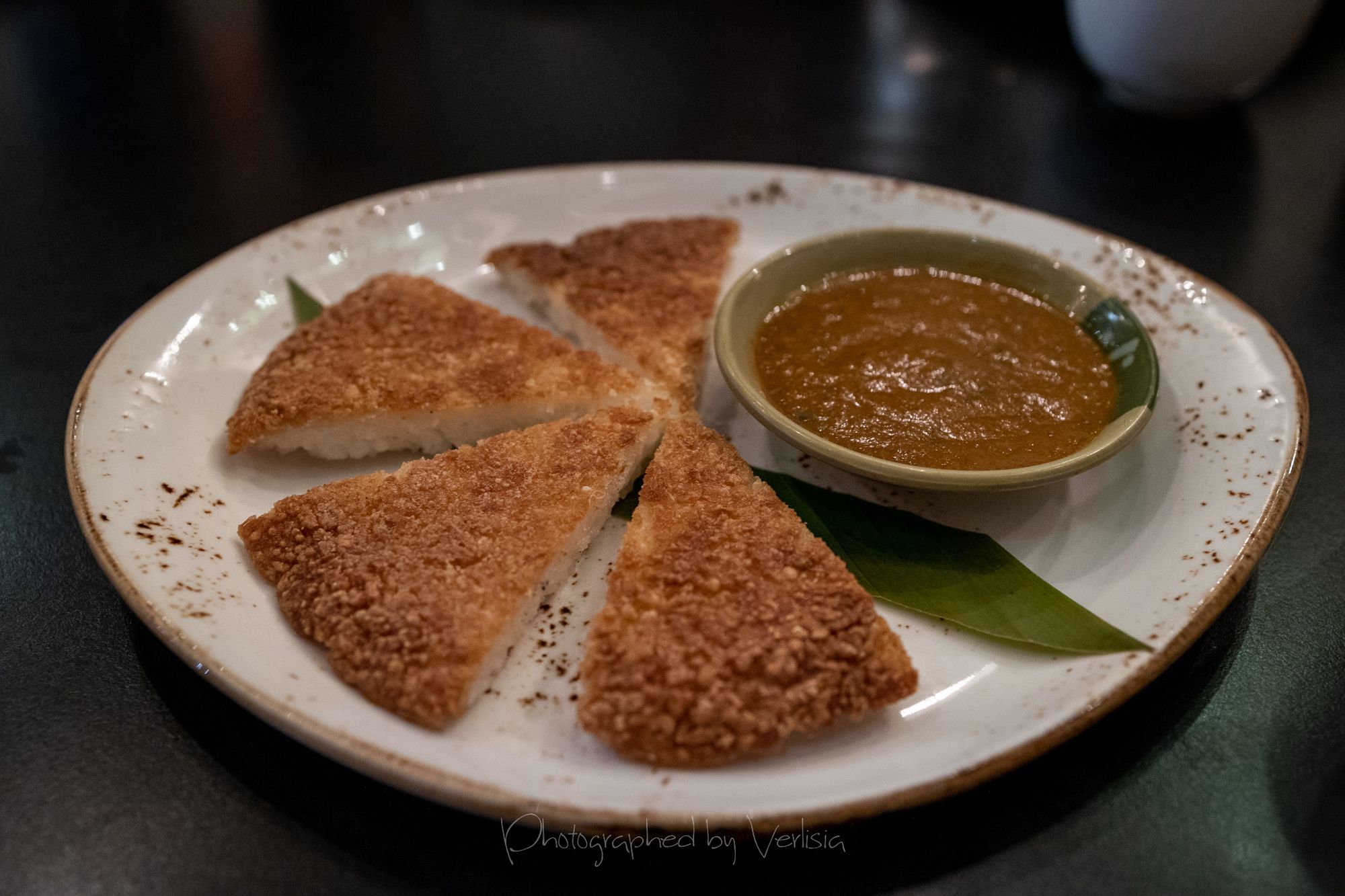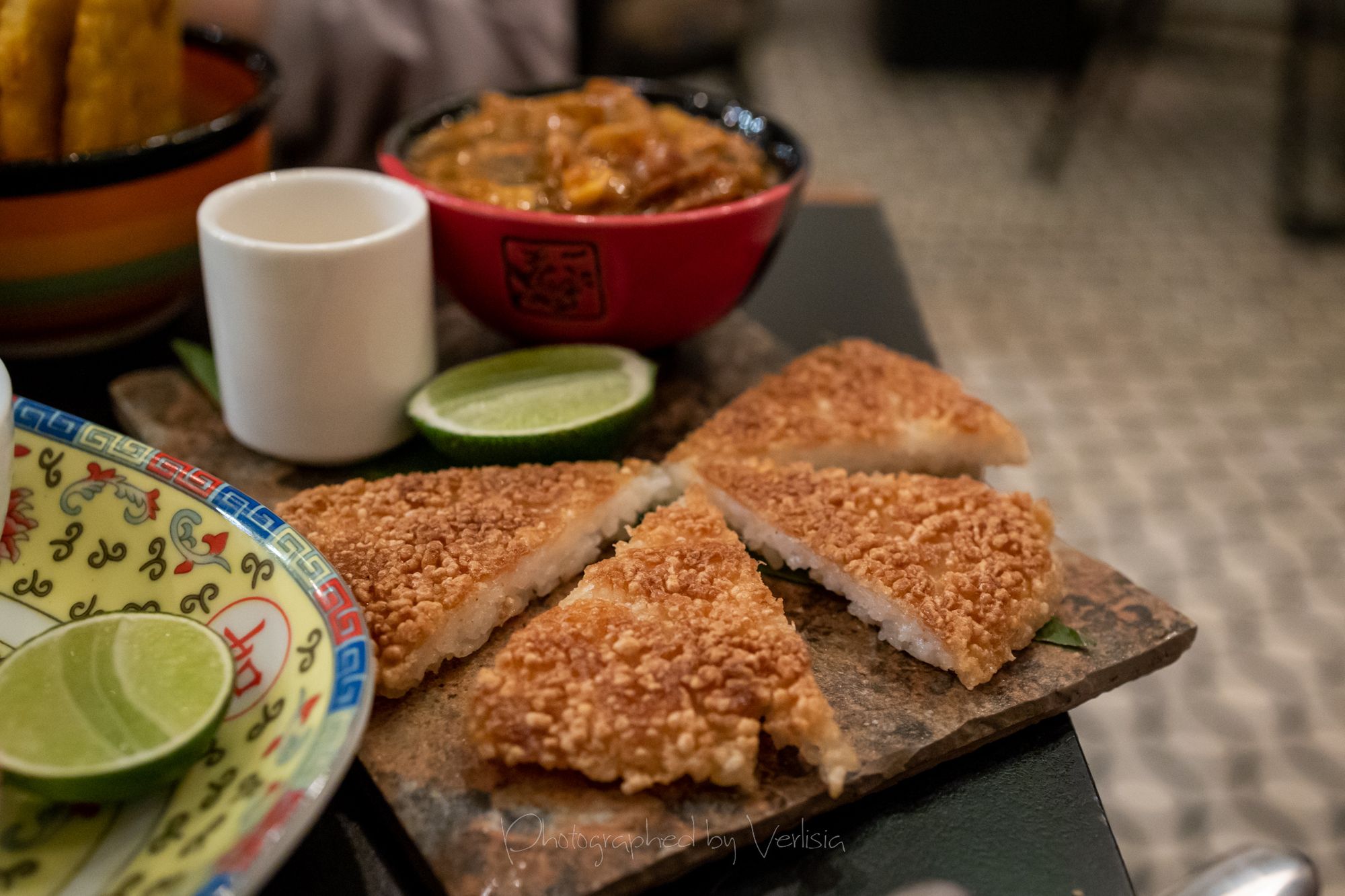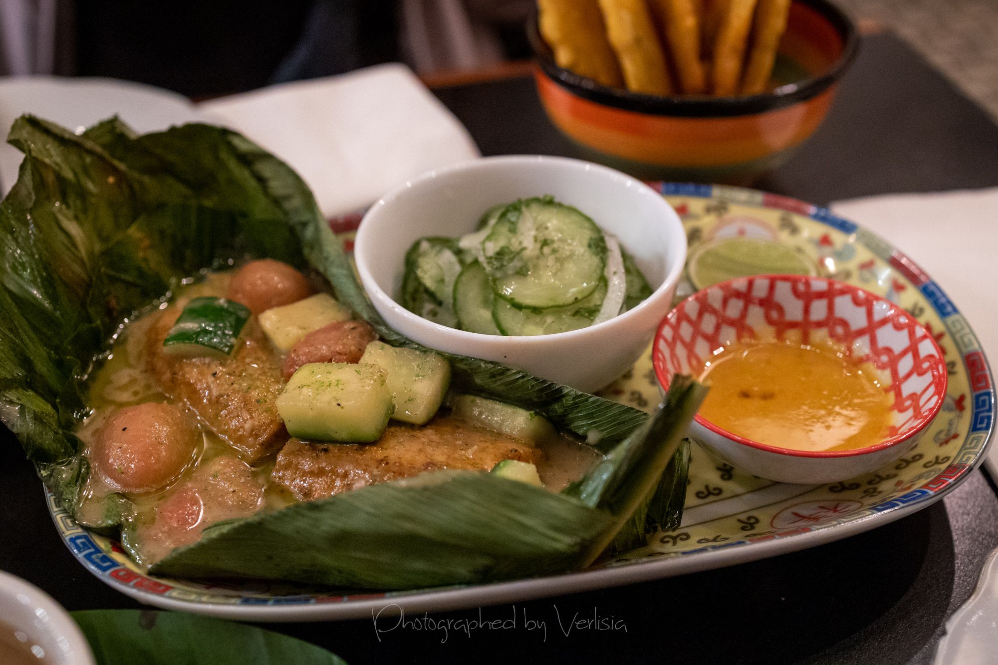 Roasted Cobia + Curry Sauce + Grilled VeggiesStew made of tripe and pork belly trotter and pork sausage served with Sexy Concolon (Crispy Rice Cake), Patacones