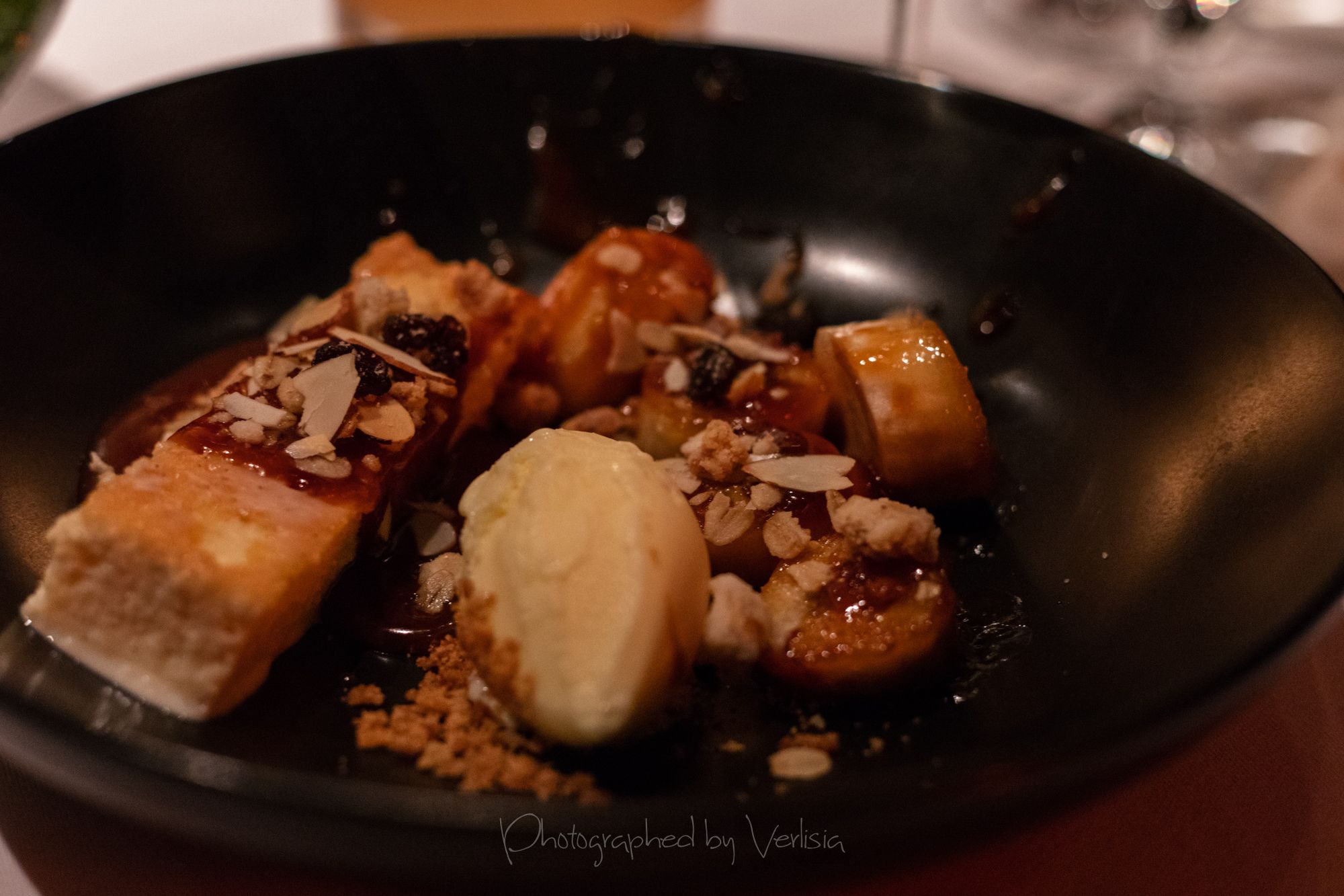 Flambéed Bananas with Vanilla Tres Leches Cake, Almond Streusel and Buttermilk Ice Cream