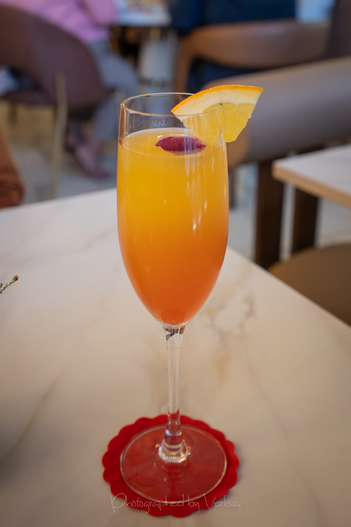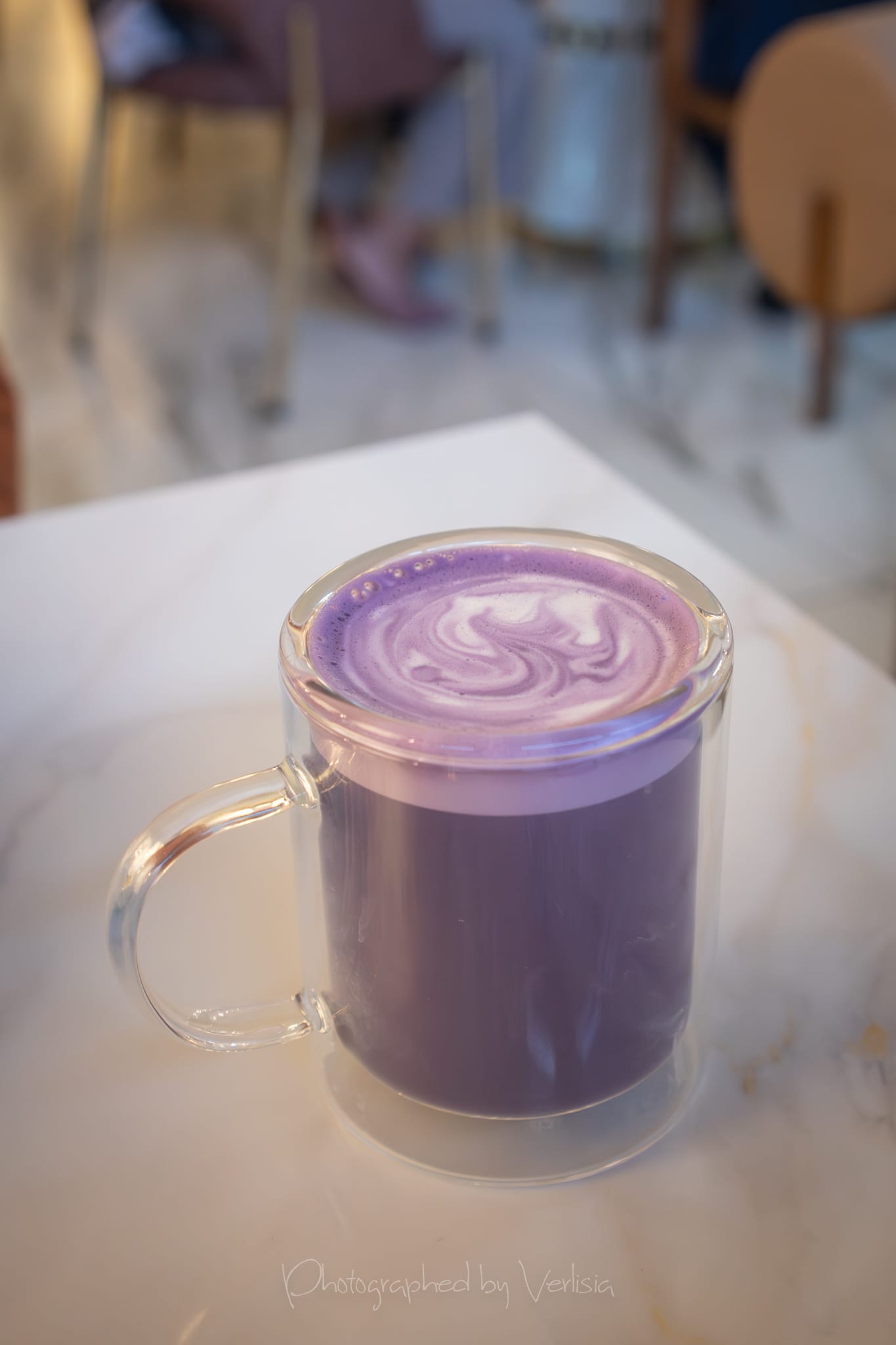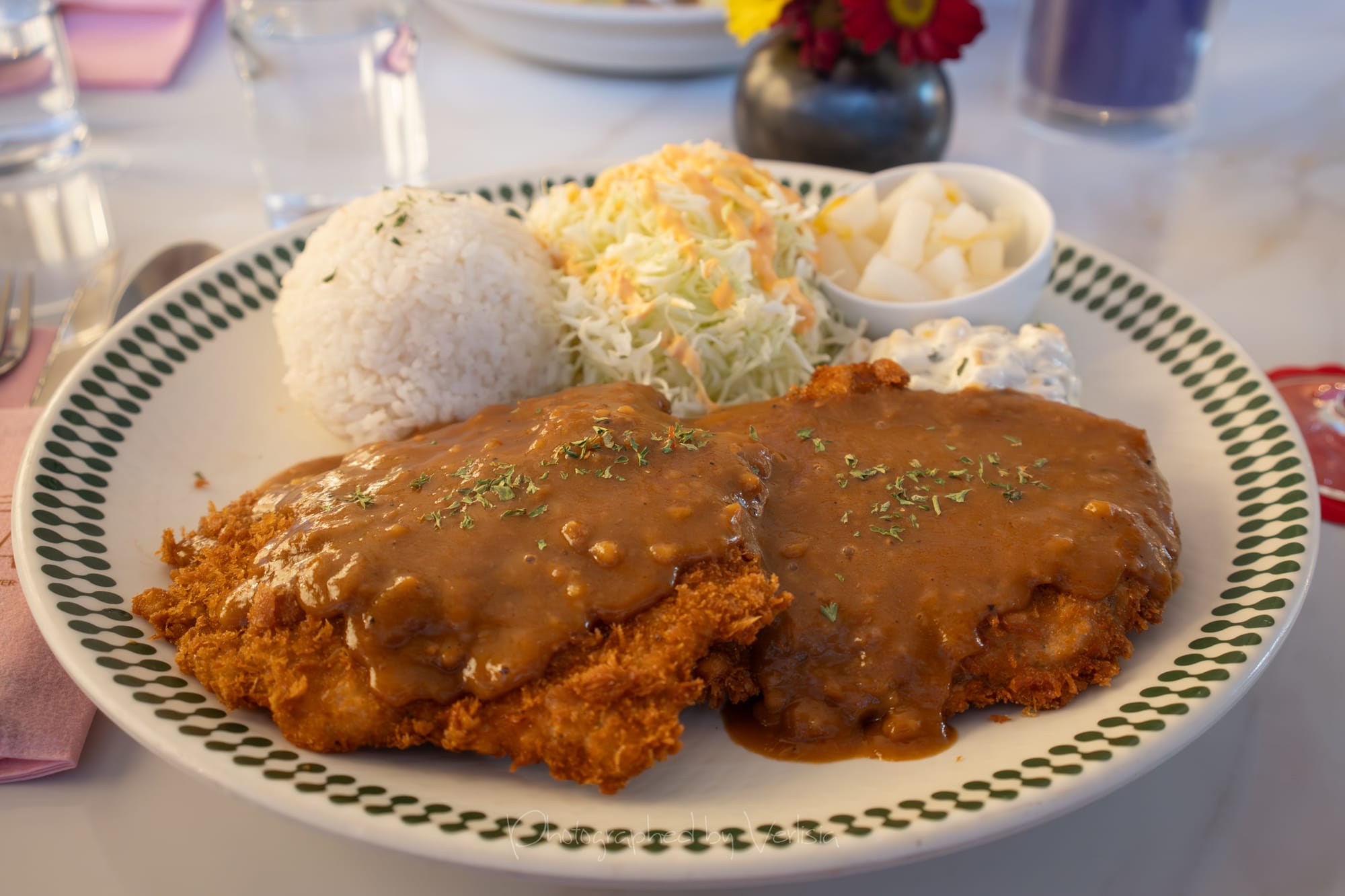 Sunrise Mimosa; Ube Latte (vanilla, coconut and nutty); Korean Pork Cutlet (golden crispy pork cutlet with cabbage salad, macaroni salad, rice, house made Tonkatsu sauce, cherry pepper)