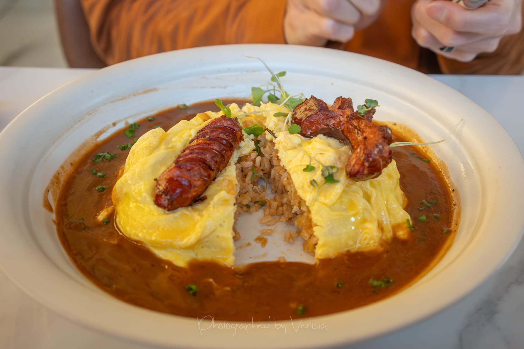 Omurice Fried Rice (soft & creamy scrambled egg over kimchi fried rice with onion with house made brown gravy sauce and green onion)