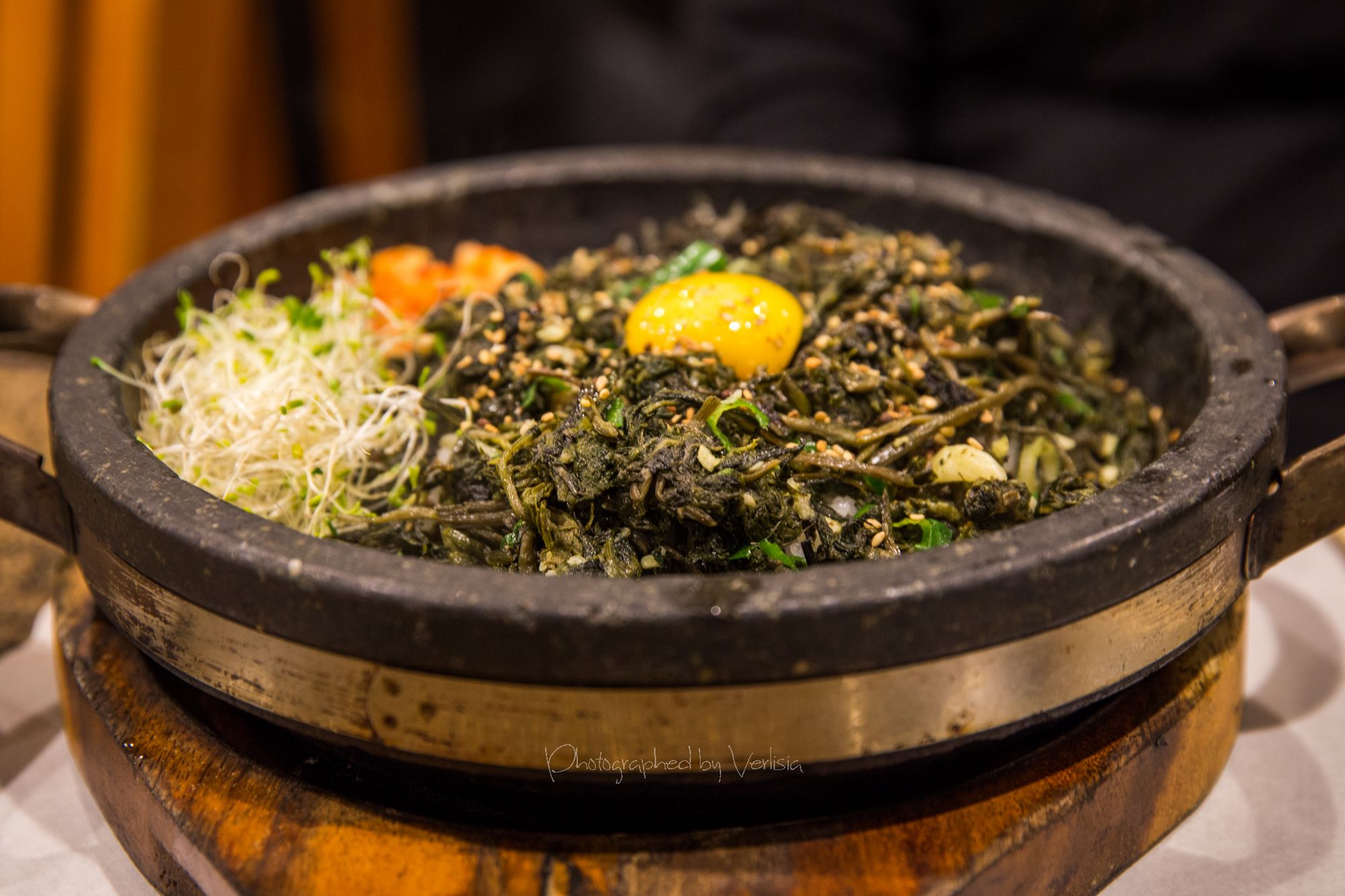 Seasoned Thistle with Rice (Hot rice plate, seasoned thistle with rice on top chopped kkak-du-gi & egg yolk)