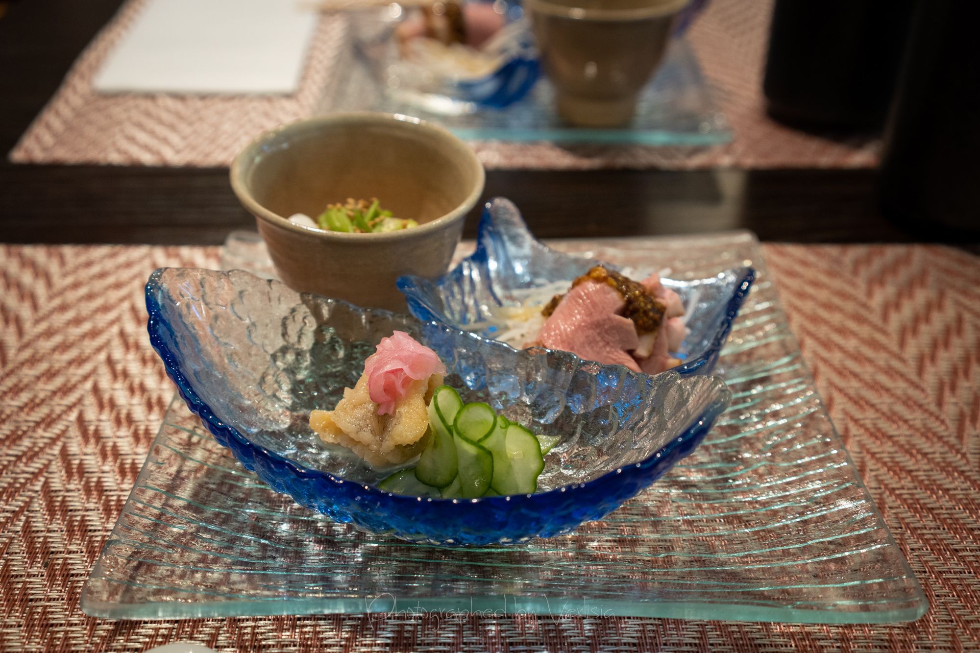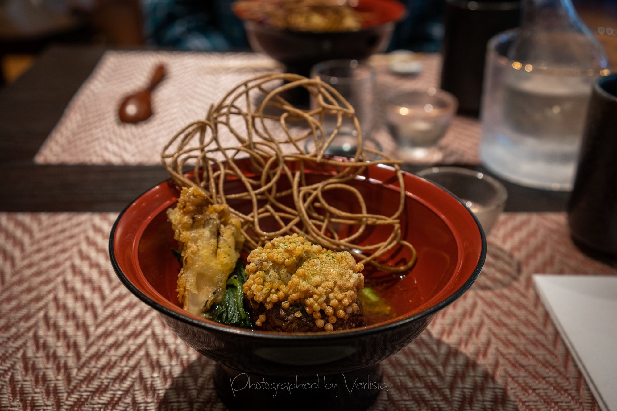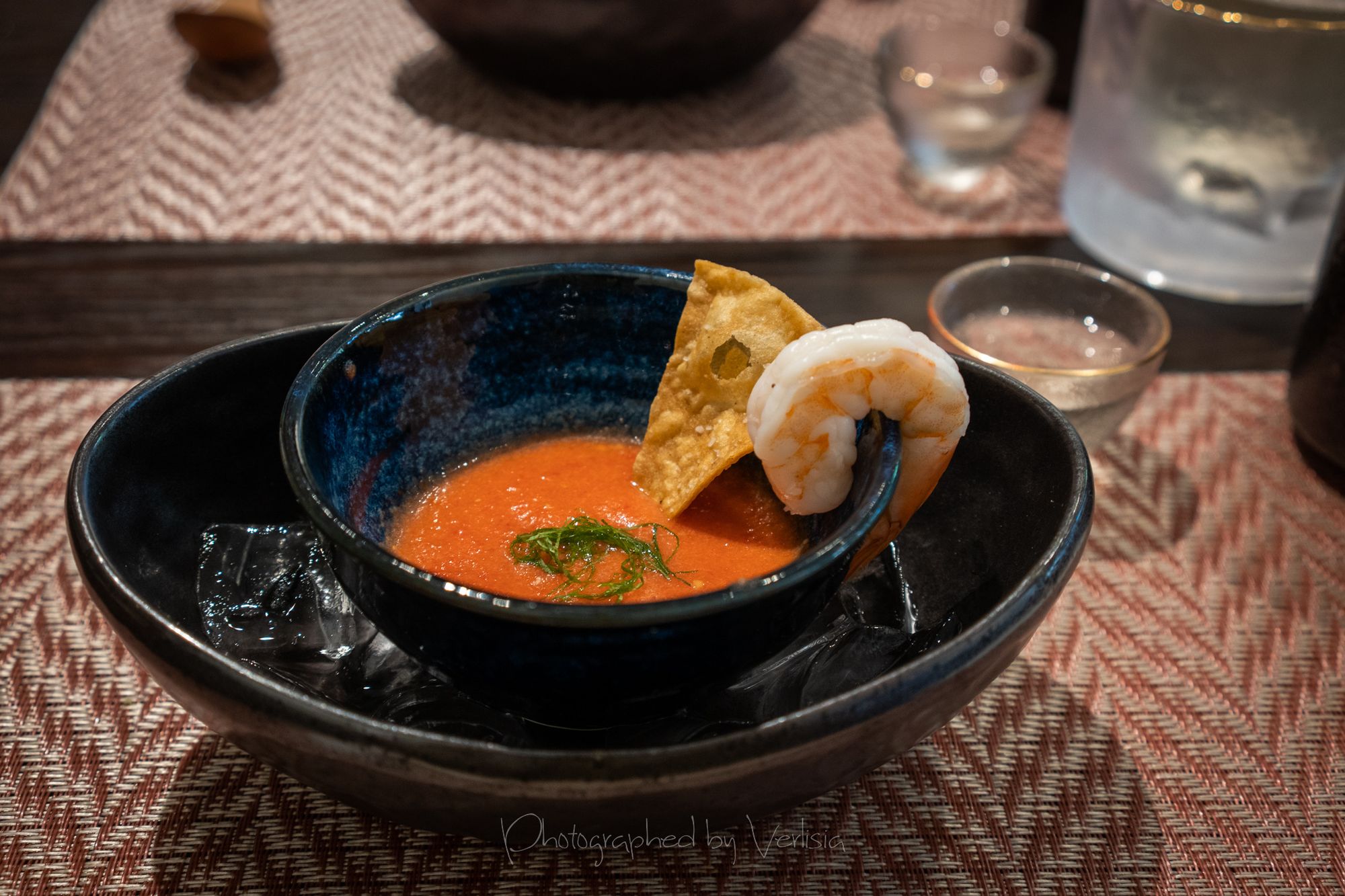Refresher - Summer Soup - Gazpacho style fresh tomato and vegetable soup. Fried Dish - Okaki Age - Fried soft shell crab and scallop ball wrapped with rice cracker, soba chips, and match powder