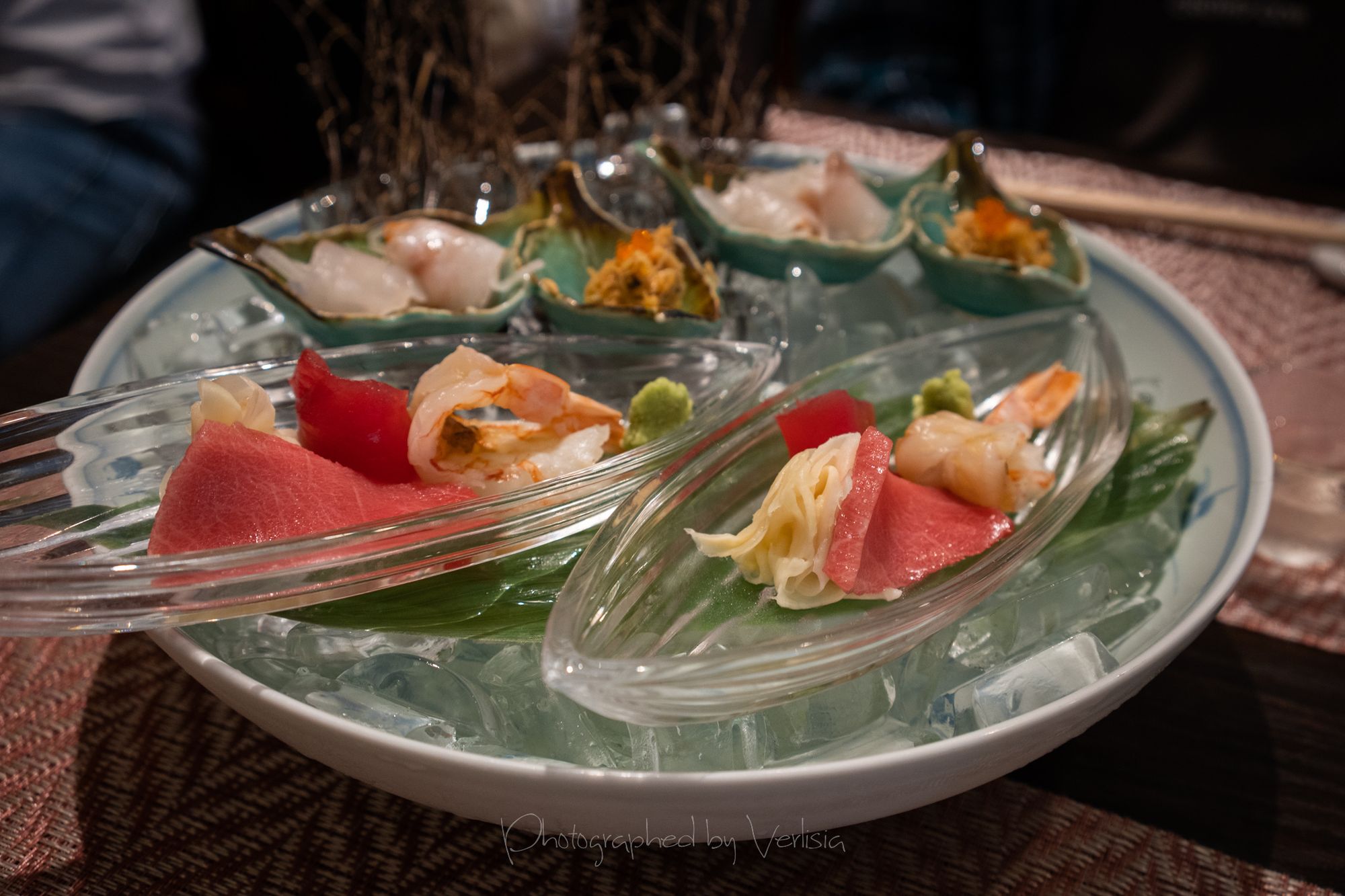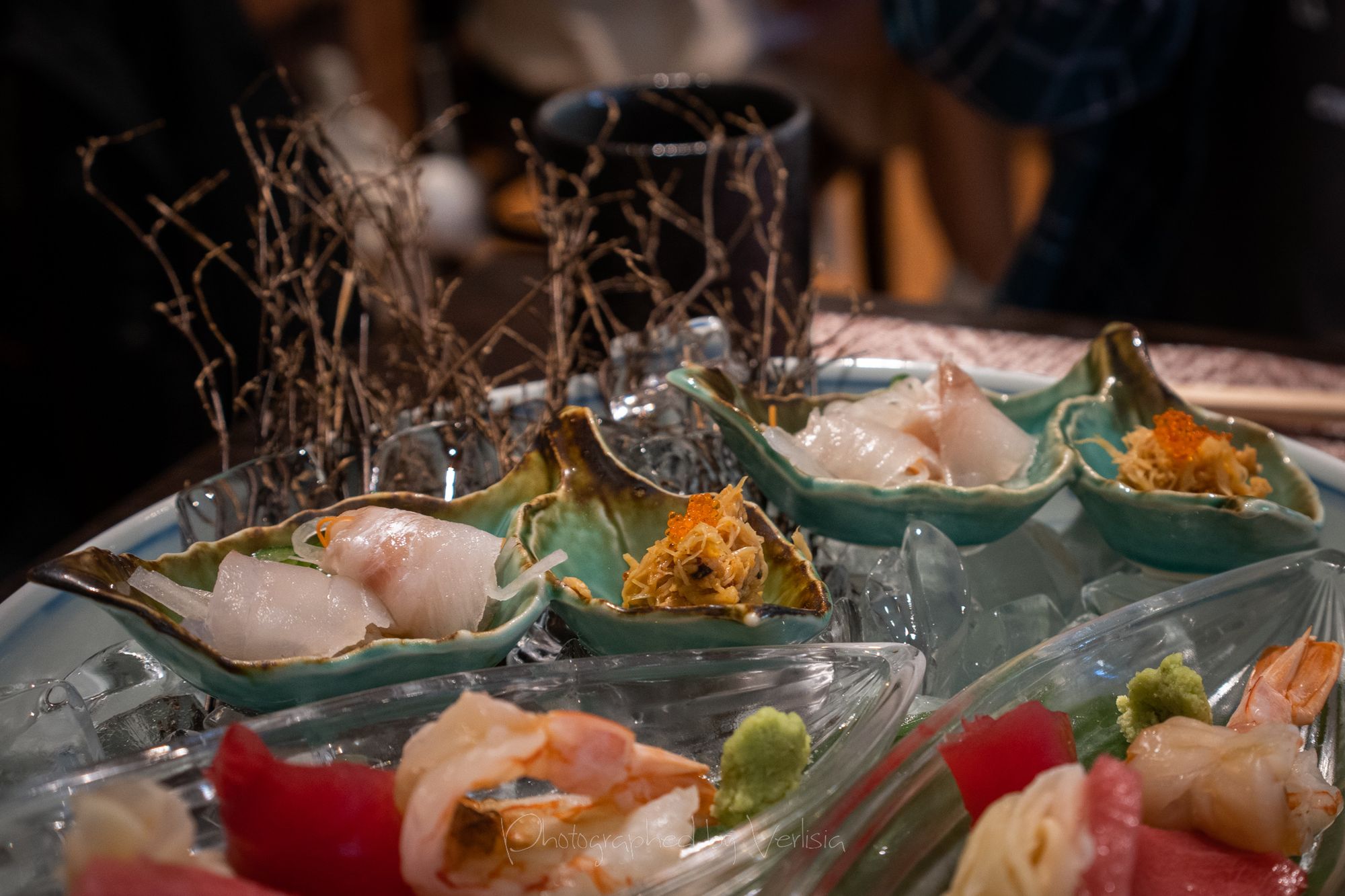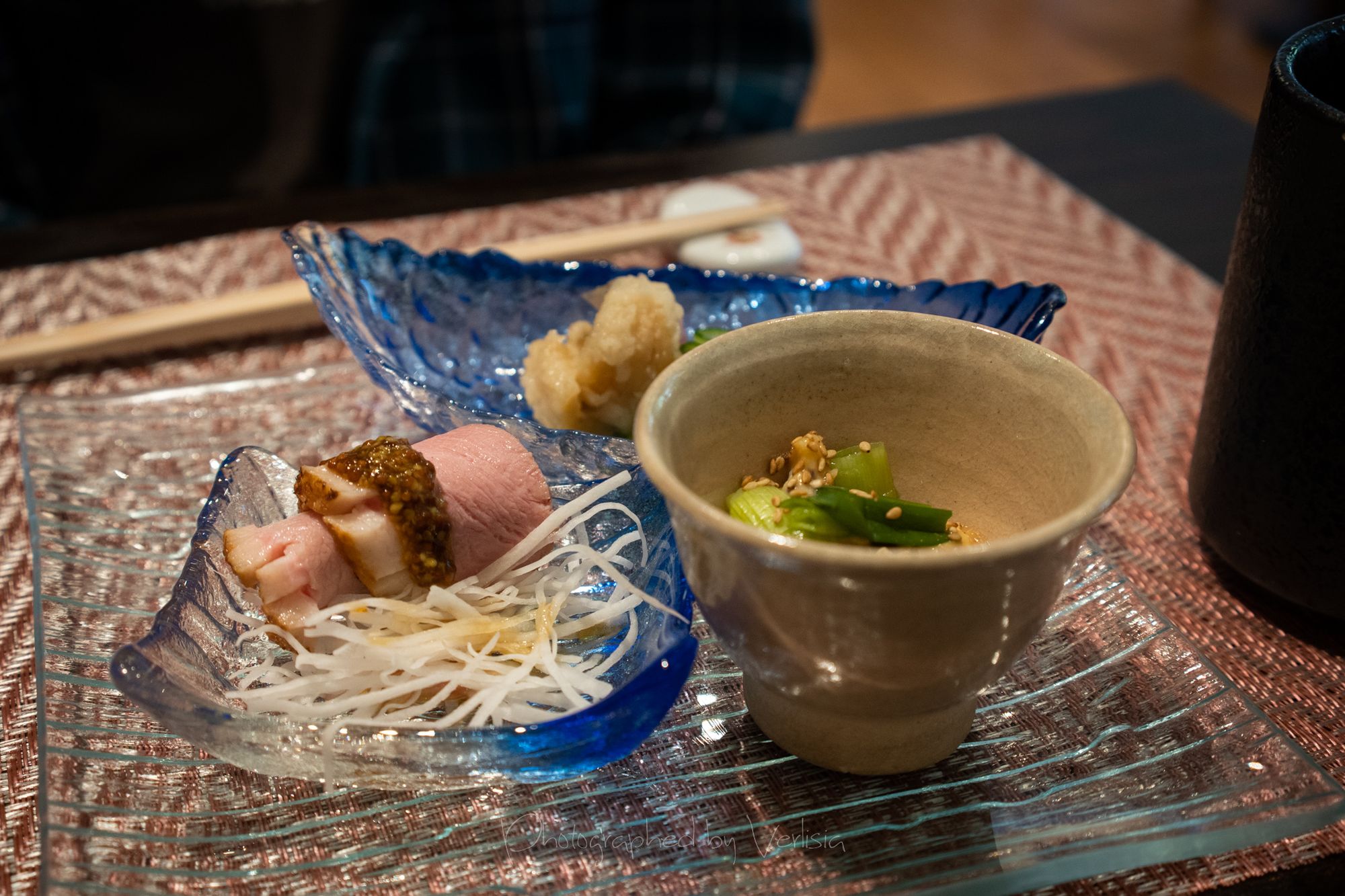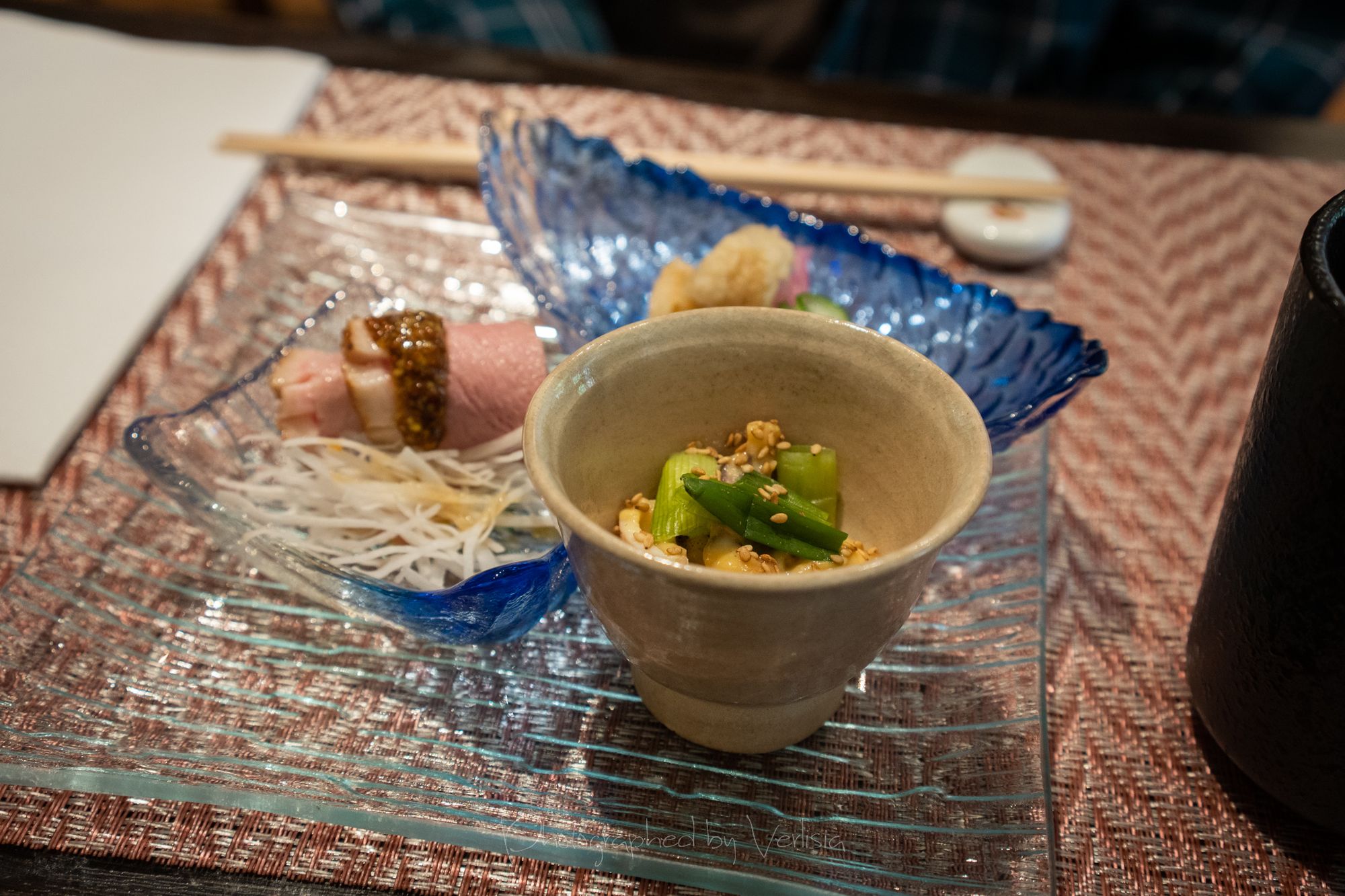 Refresher - Summer Soup - Gazpacho style fresh tomato and vegetable soup. Fried Dish - Okaki Age - Fried soft shell crab and scallop ball wrapped with rice cracker, soba chips, and match powder