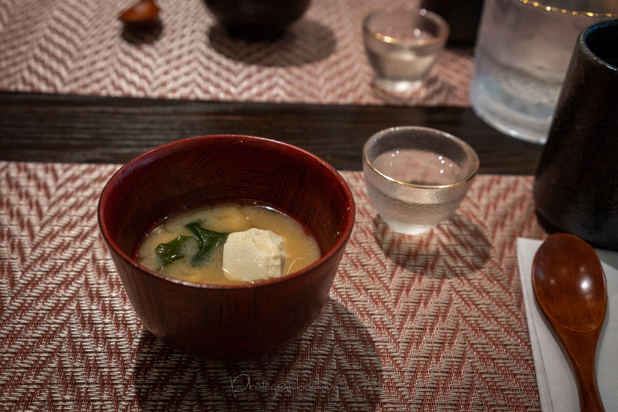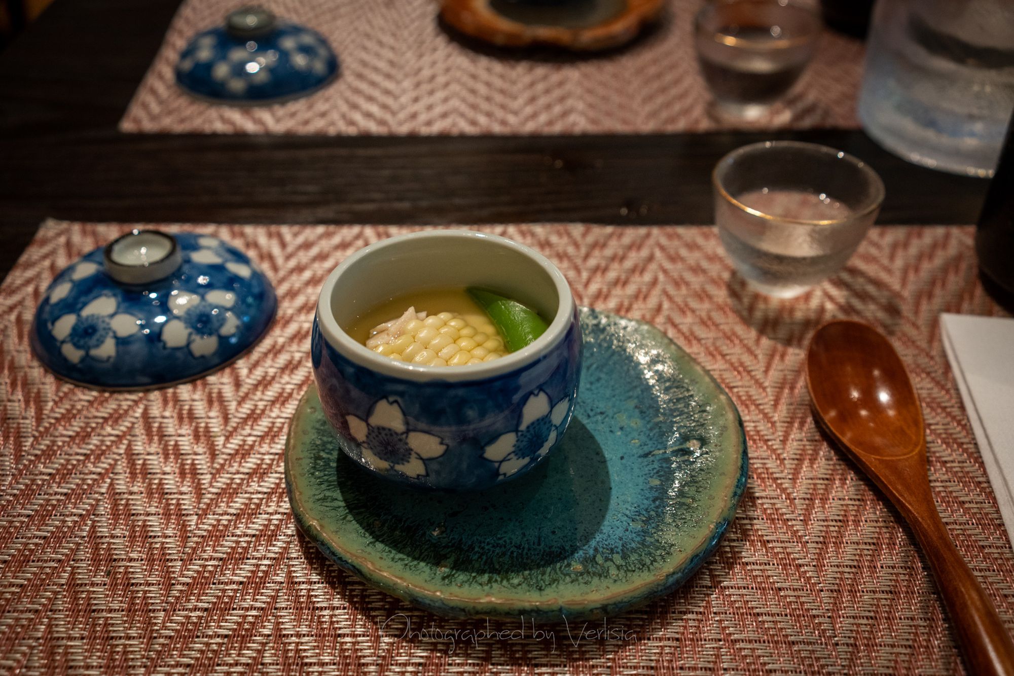 Steamed Dish - Chawanmushi - Steamed savory egg custard with fresh corn, pea, and chicken. Miso Soup