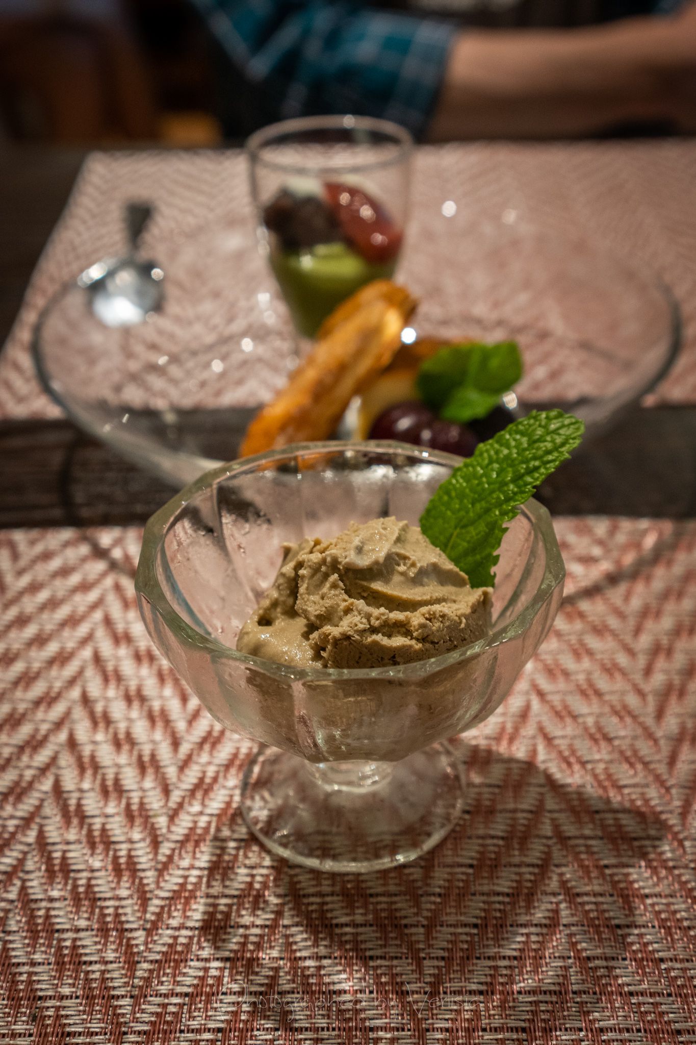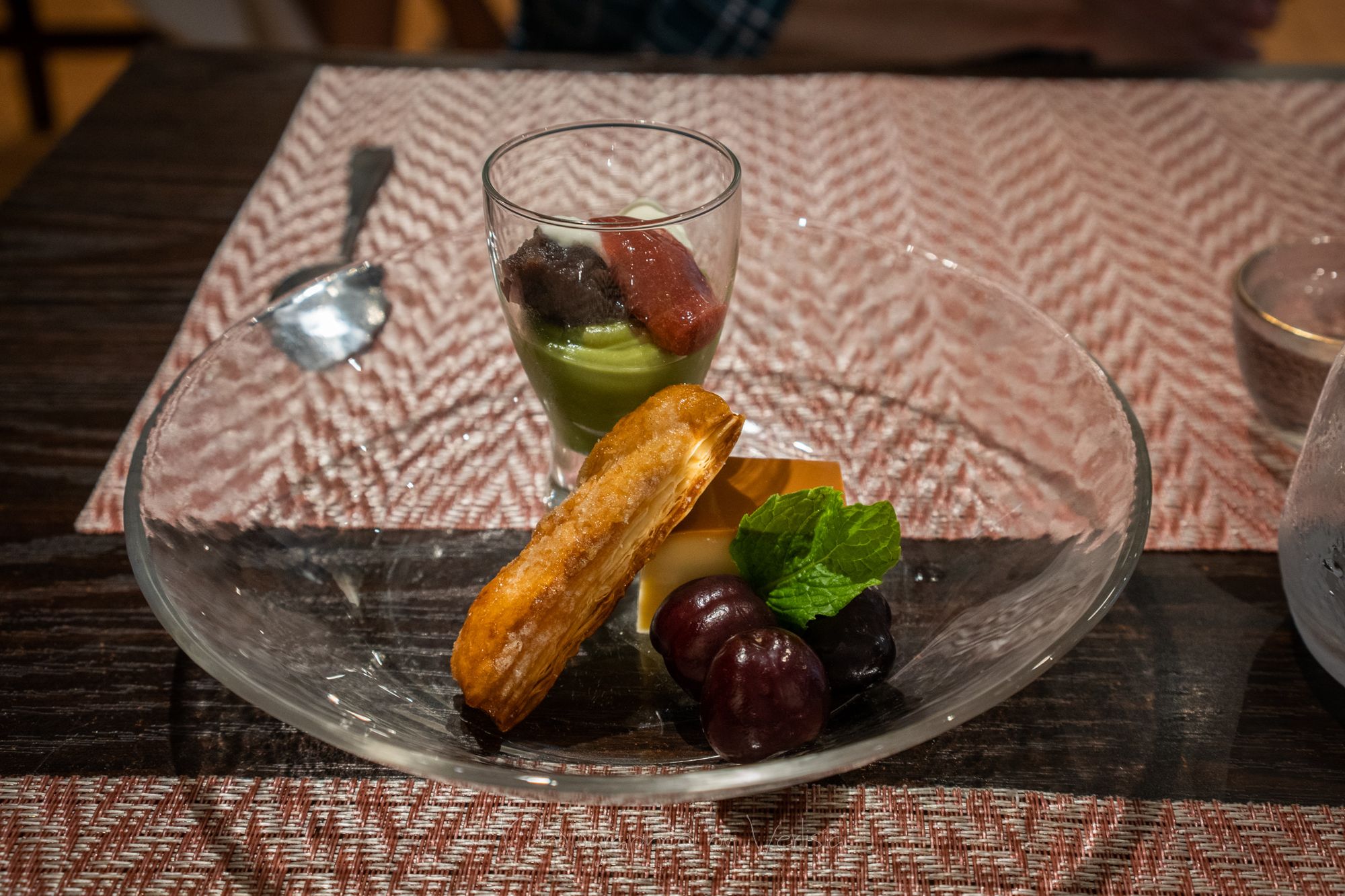 A Duo of Desserts - UjiKinoki Matcha Parfait (Matcha custard cream with red bean paste, fresh cream, and berry sauce on top) & Custard Pudding (Koji's pudding with fresh seasonal fruit). Hojicha Ice Cream