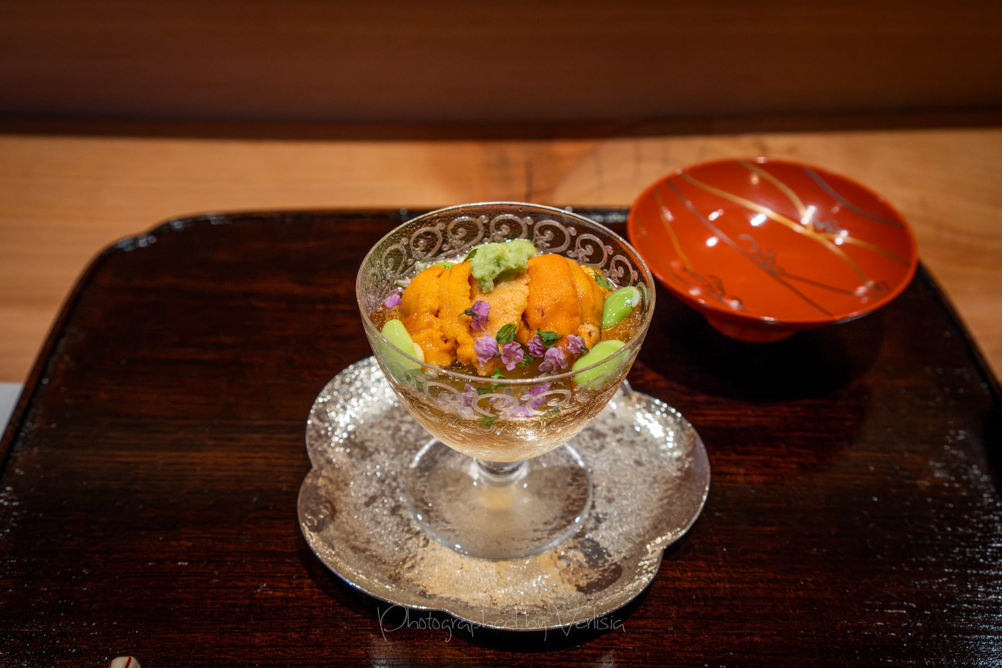 Celebration - Sake IWA 5; ODashi - Makurazaki ChiaiNuki HonkareBushi x Hokkaido Rishiri KaFuka First Grade Wild Rishiri Sea Kelp (OkuiKaiseiDo KuraGakoi 5 Years); SakiZuke - Yuba Jade Eggplant, Sea Urchin, Edamame, Wasabi, Dashi Gelee