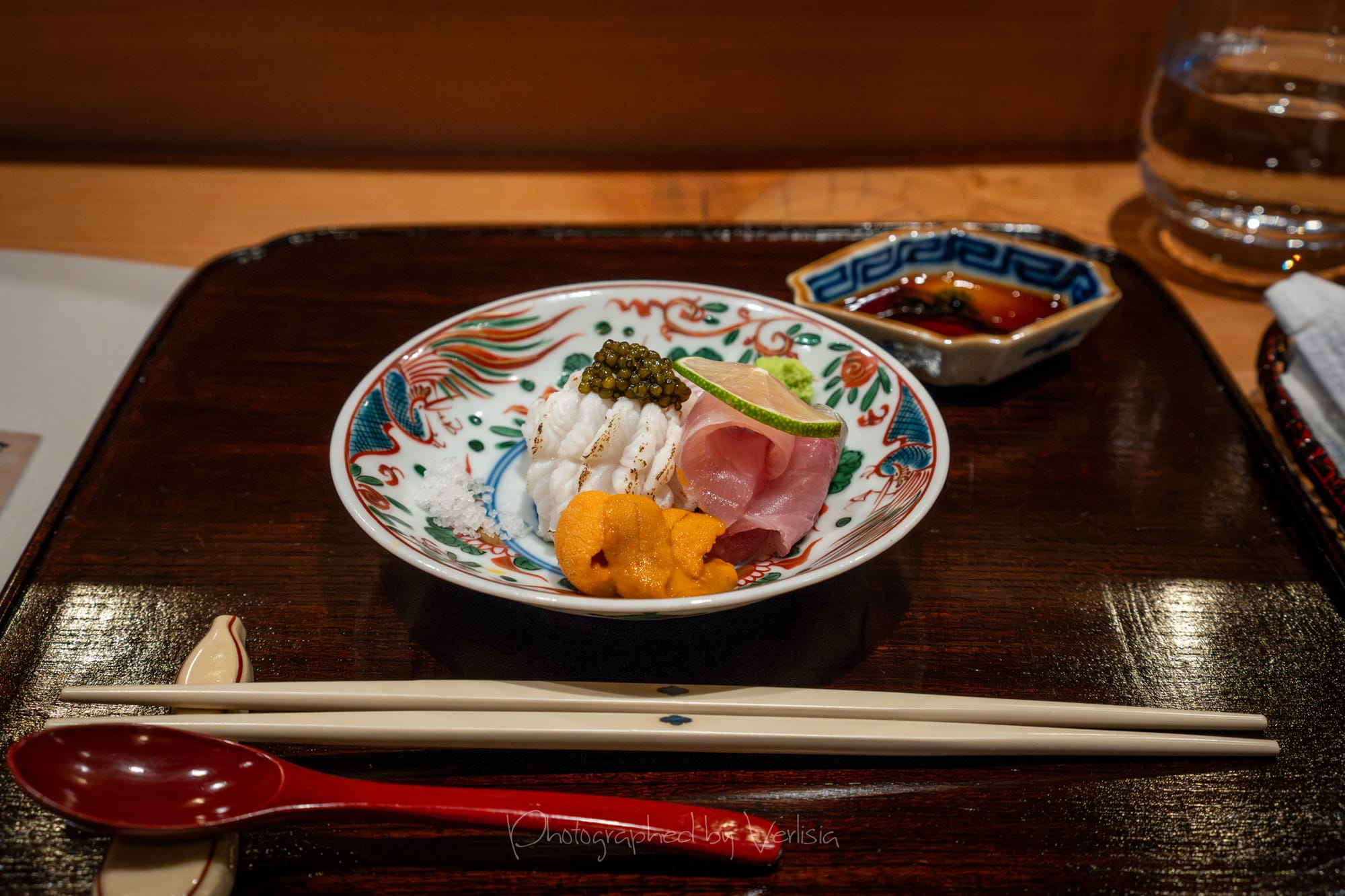 Otsukuri - Akashi Densuke Anago Eel, Striped Jack, Wasabi, Salt, Shoyu