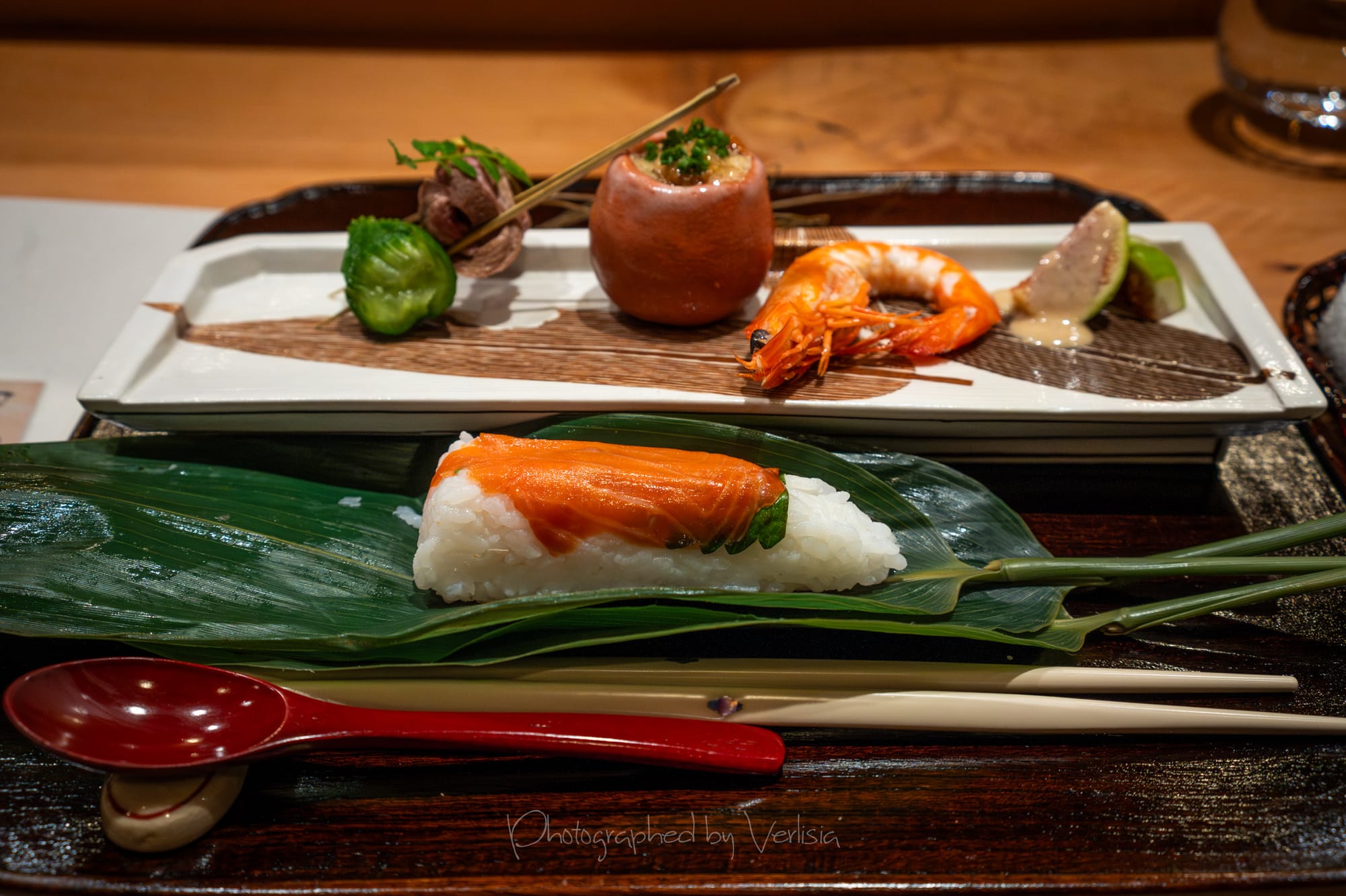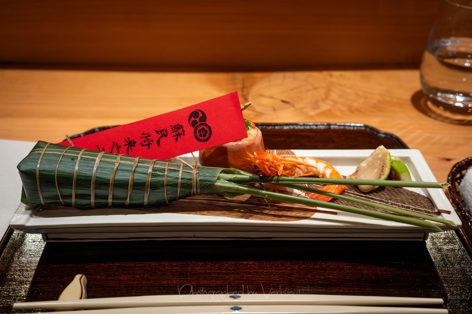 YakiMono - Kuruma Shrimp, Lotus Root, Fig, Sesame Sauce, Cucumber, Akashi Smoked Salmon Chimaki Sushi, Muscovy Duck
