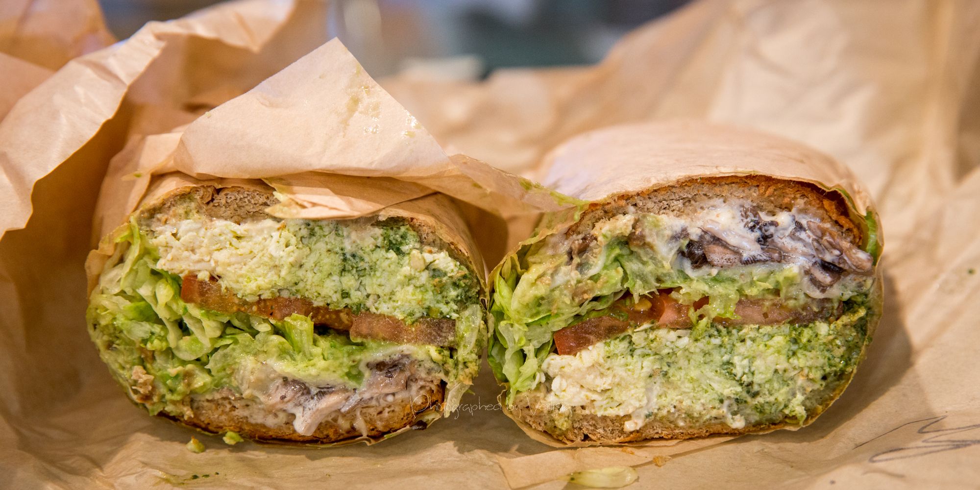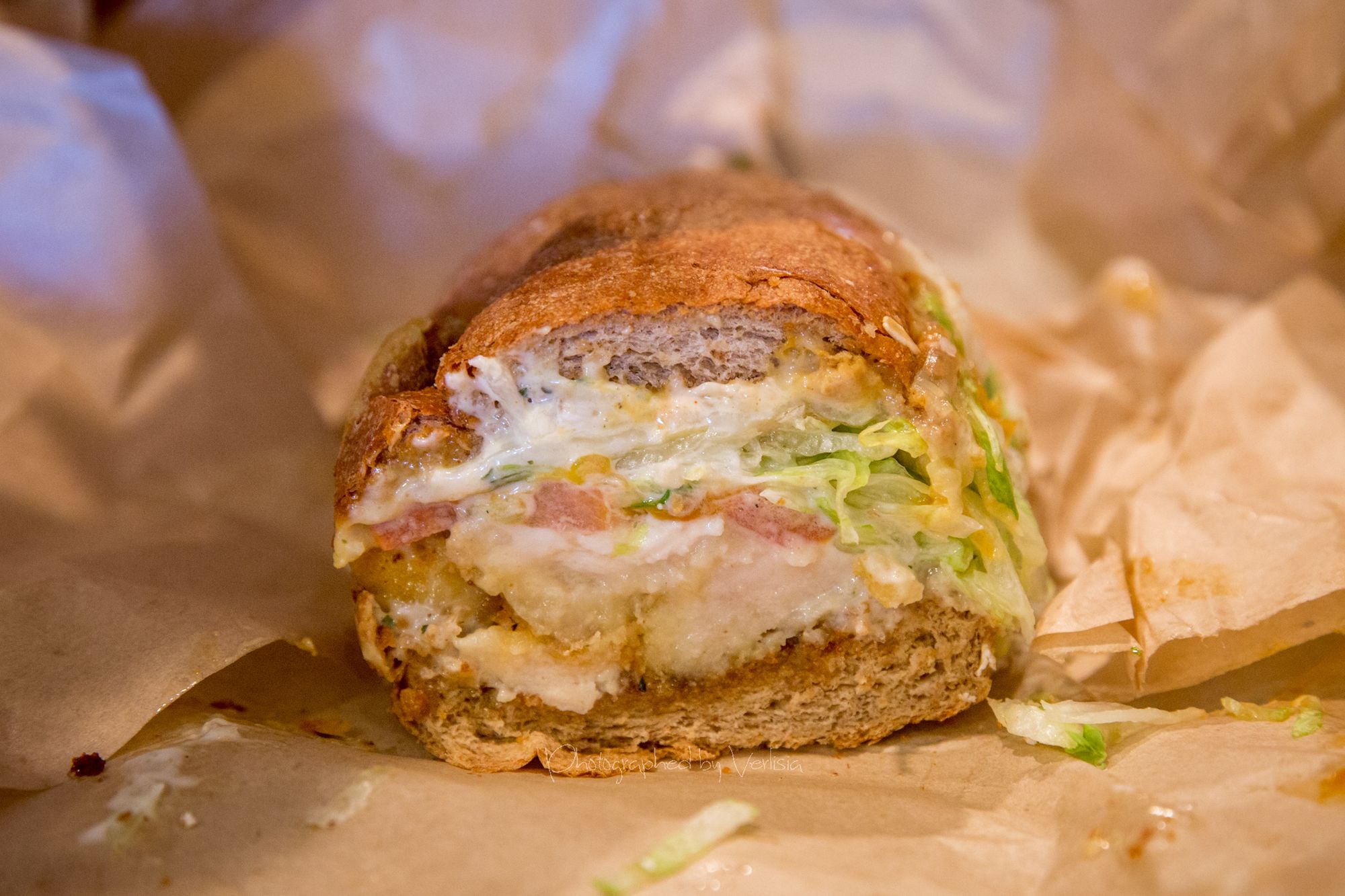 Spiffy Tiffy (avocado, Halal chicken, mushrooms, pepper jack, pesto, provolone), Jaymee Sirewich (Fried chicken, Ike's yellow bbq, pepper jack, ranch)