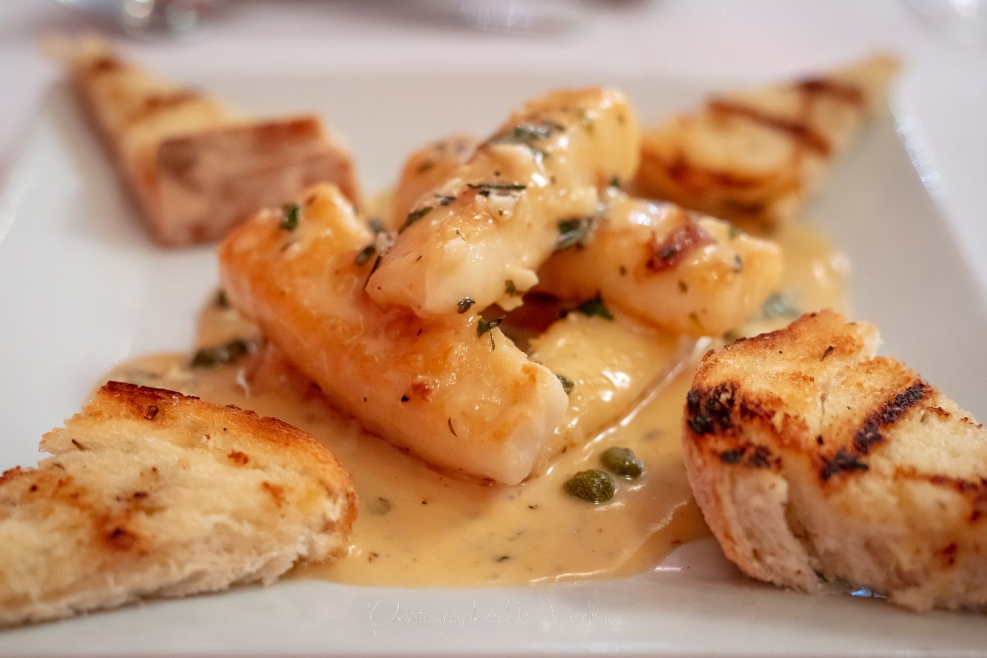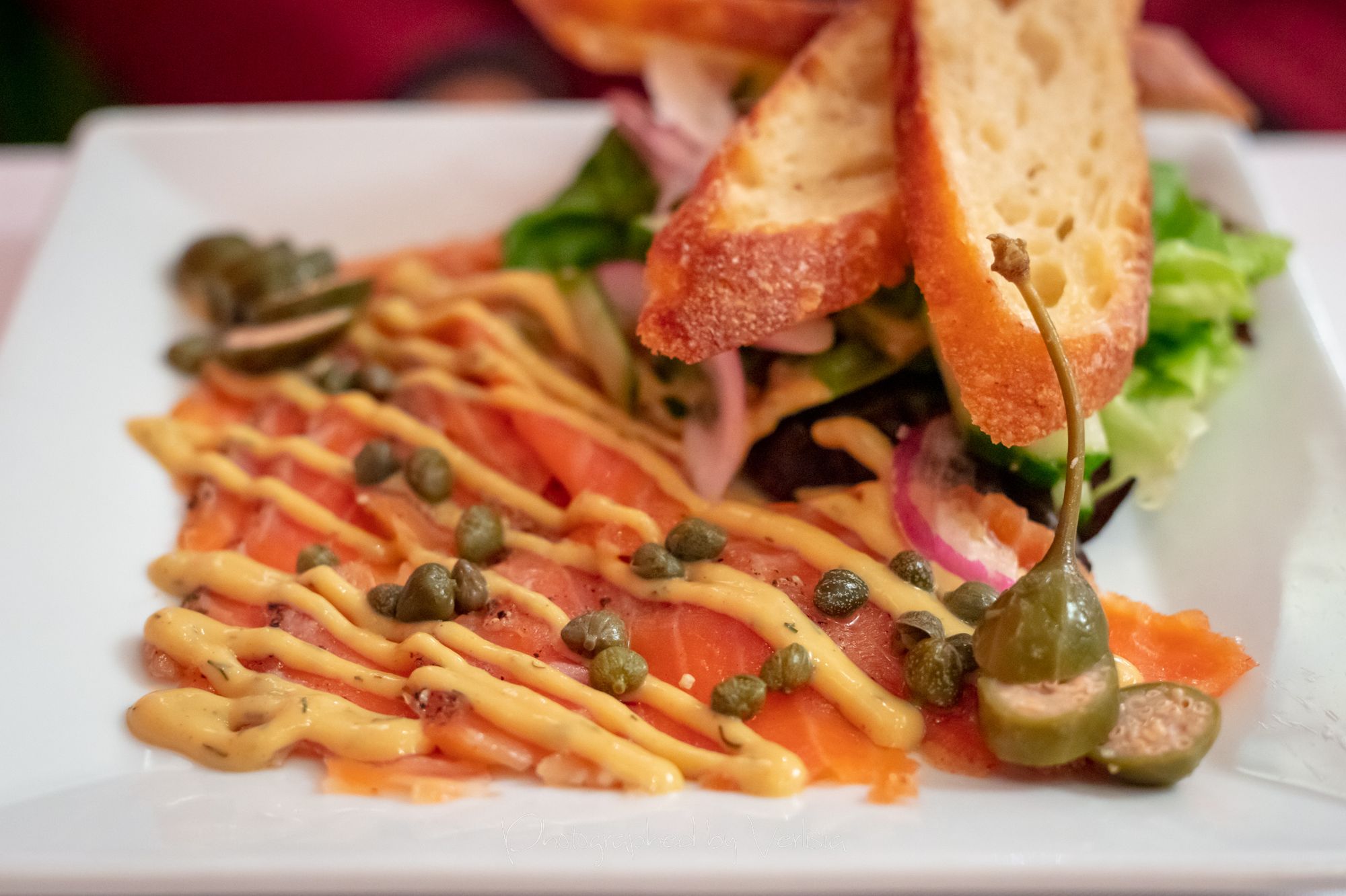 Calamari a la Picatta (Sauteed strips of calamari with a garlic, caper, herb and lemon sauce. Served with garlic bread), Gravad lox (Danish style dill marinated King Salmon served with honey mustard)
