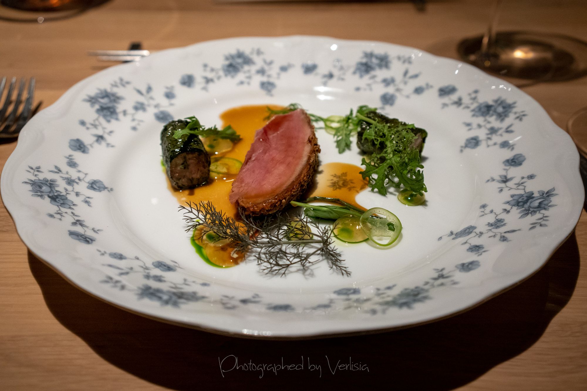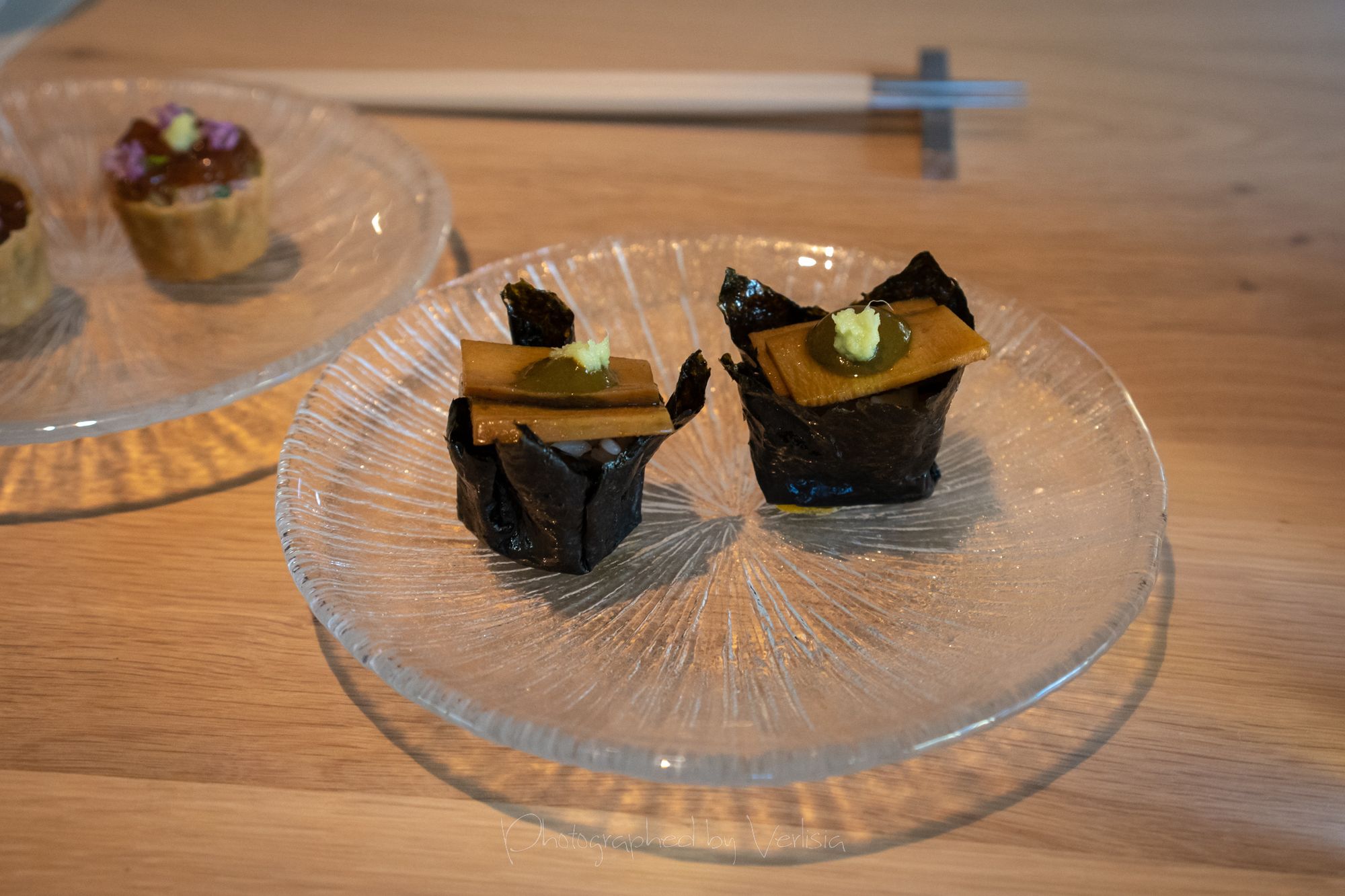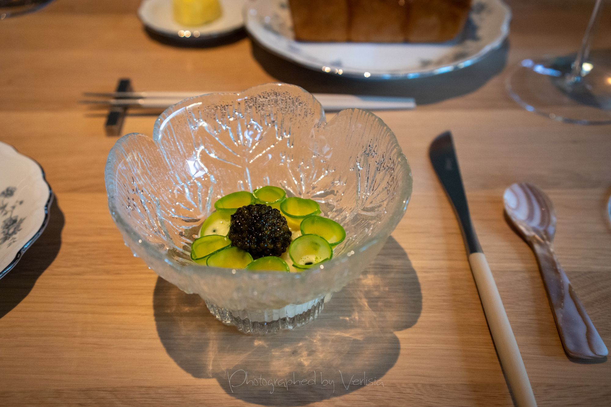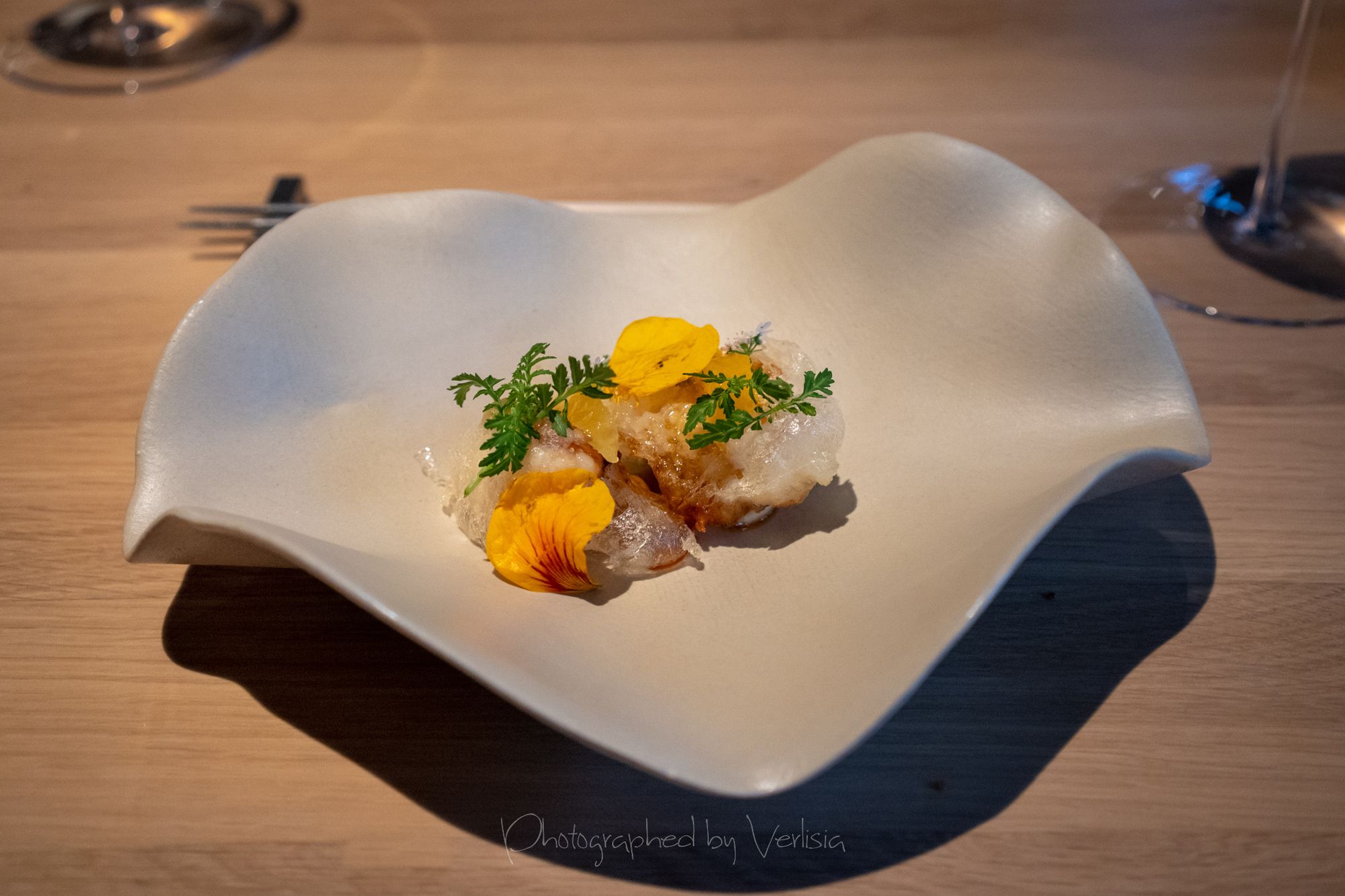 Scallop with Soy Preserves and Doubanjiang, Yellowtail with Cilantro and Black Vinegar, Abalone with Seaweed and ShaoxingSea Urchin with Iberico Ham and Brown Butter, Milk Bread, Caviar with Dungeness Crab, Spiny Lobster with Orangem and SudachiTilefish with Fish Fragrant Sauce and Szechuan Peppercorn, Duck with Menegi and Duck Sausage, Freshwater Eel with Rice, Cucumber with Sesame SaucePassionfruit with Buttermilk and Guava, Hazelnut with Caramelized White Chocolate, Slatee Egg Creme Puff