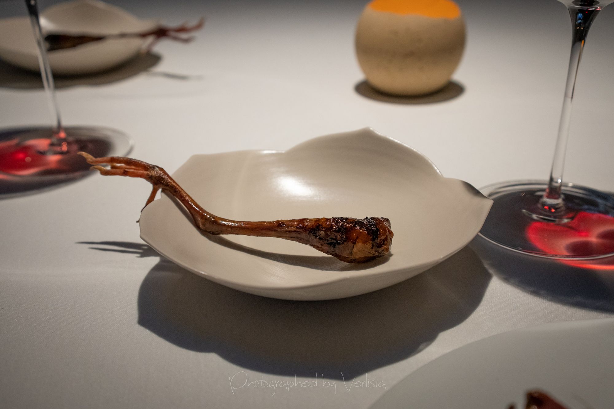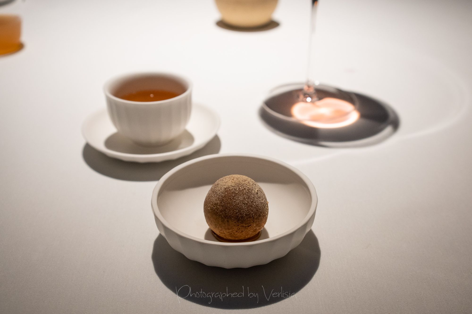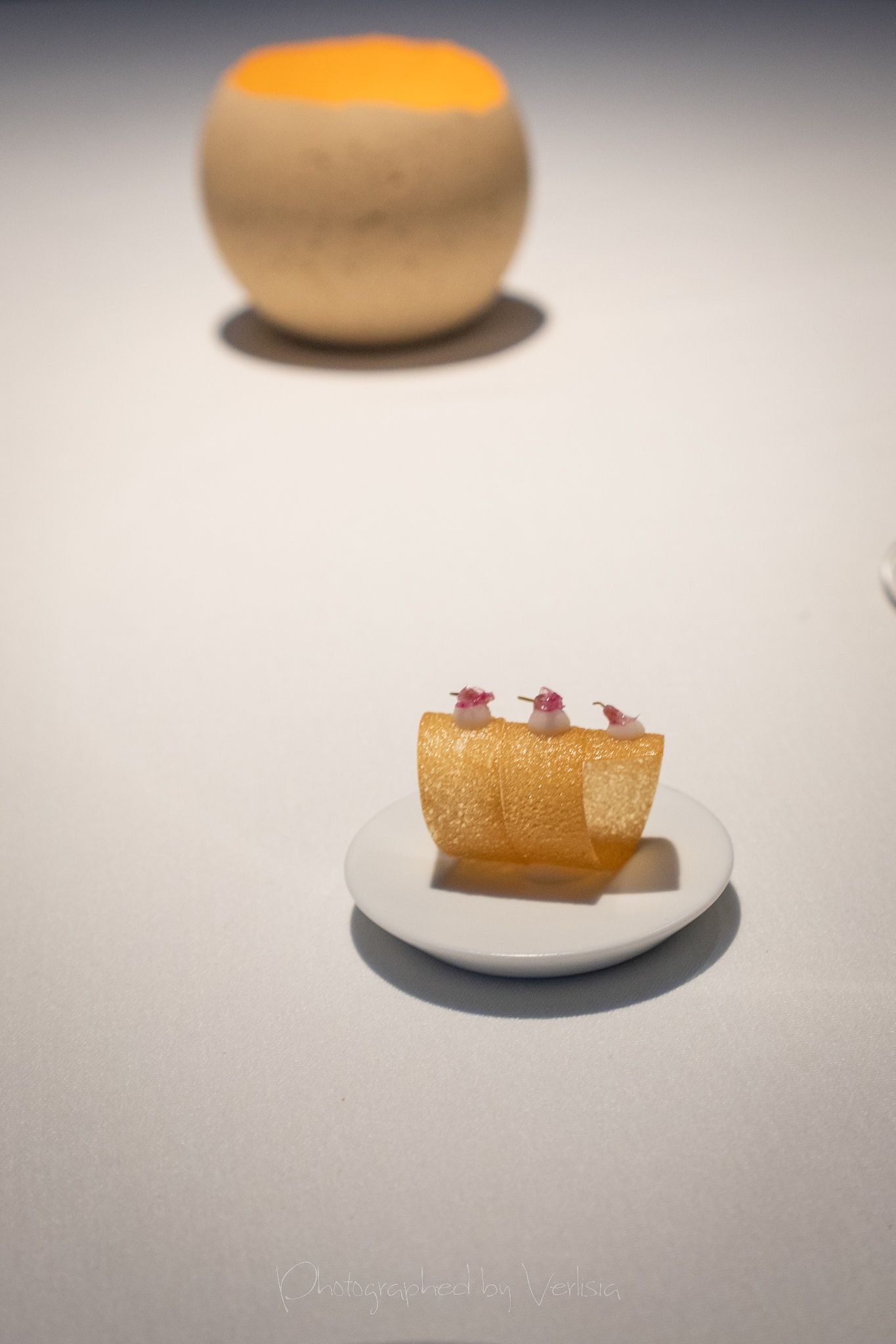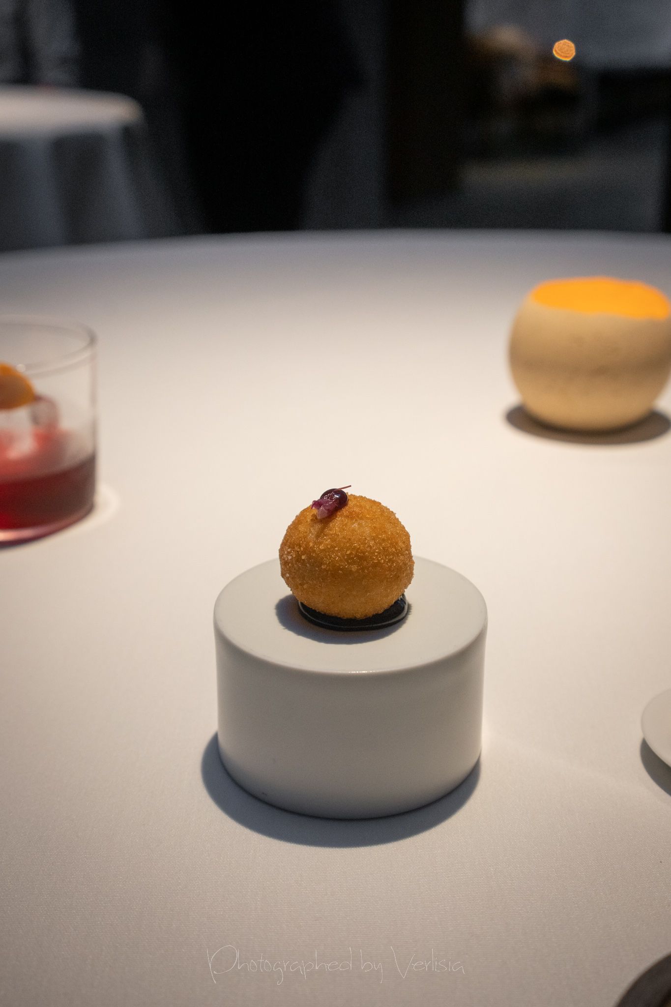 Hay Custard (Lamb Shank, CHanterelle Mushroom, Chive), Celeriac Cracker (Lamb Fat, Preserved Chive Blossom), Croquette of Lamb Rib