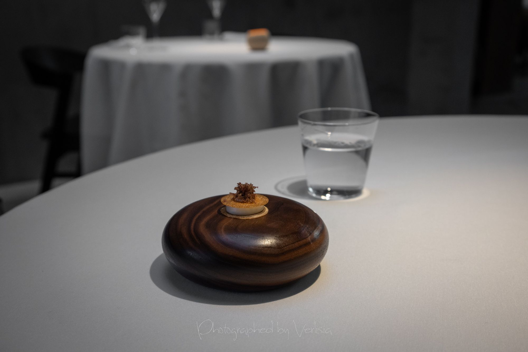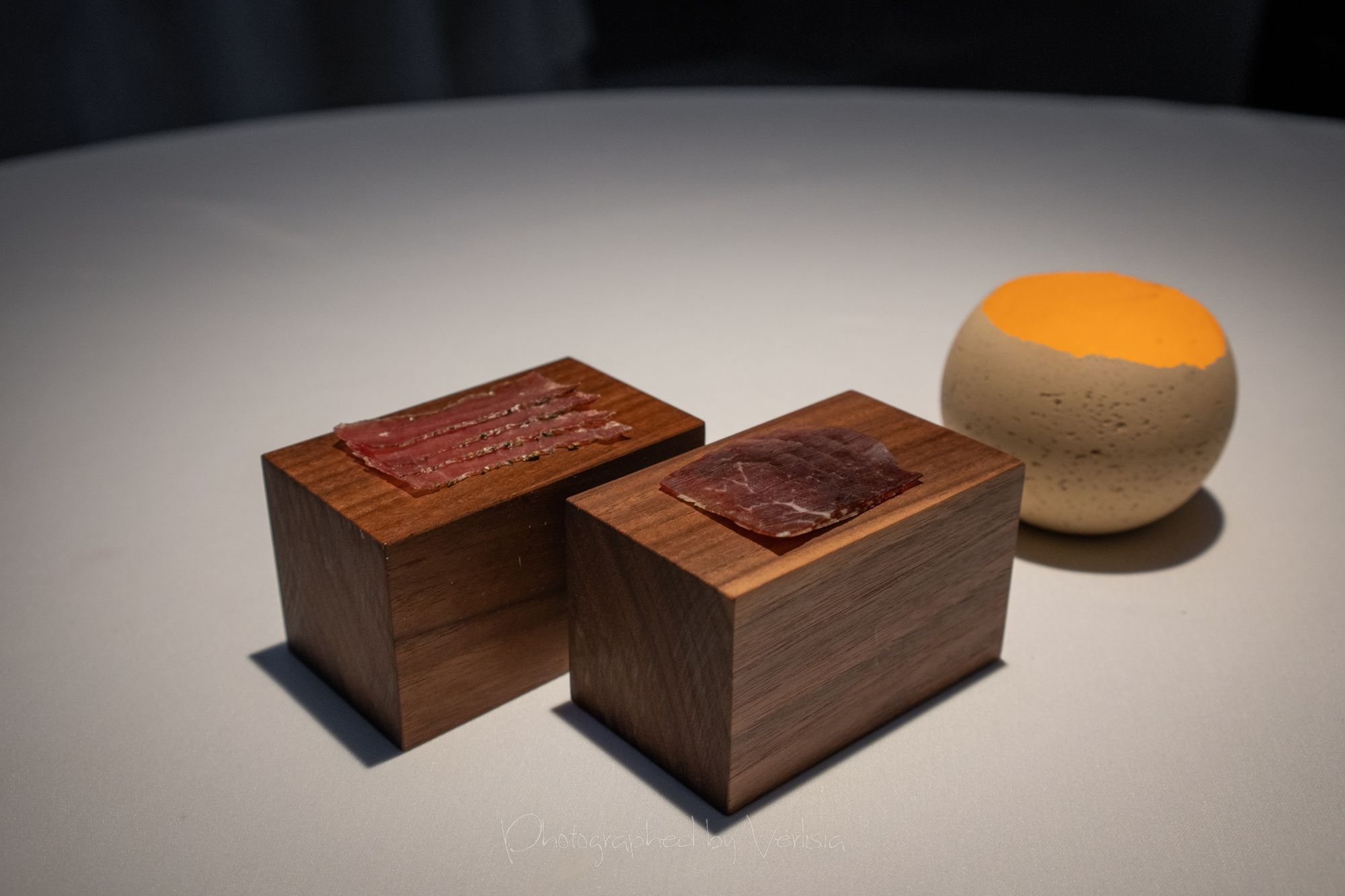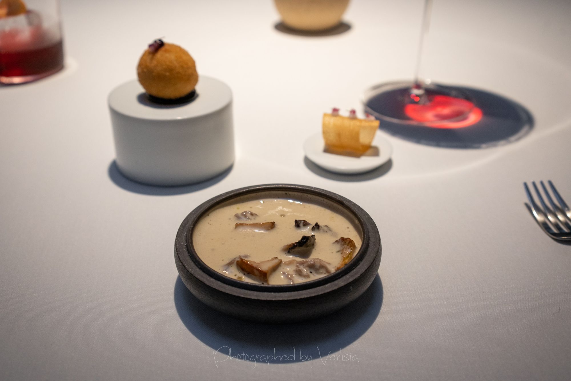 Hay Custard (Lamb Shank, CHanterelle Mushroom, Chive), Celeriac Cracker (Lamb Fat, Preserved Chive Blossom), Croquette of Lamb Rib