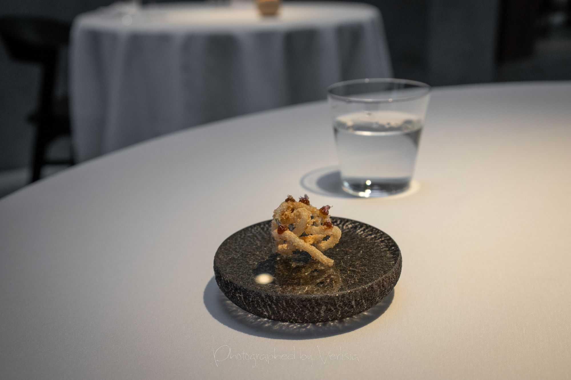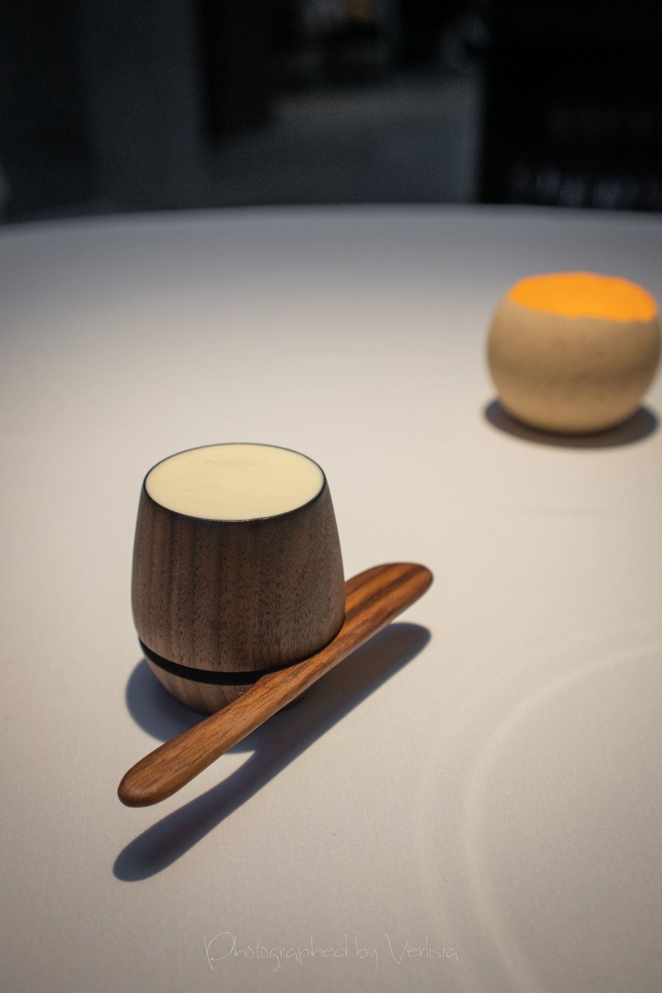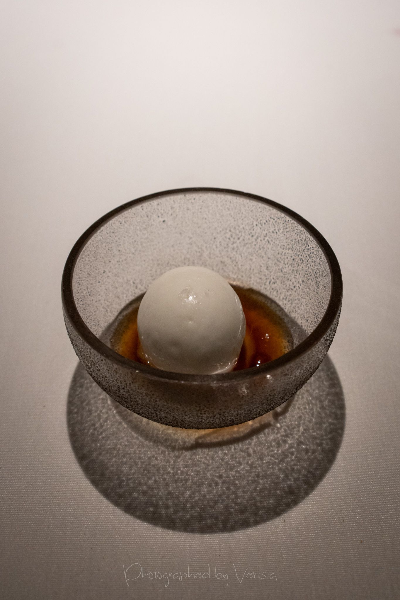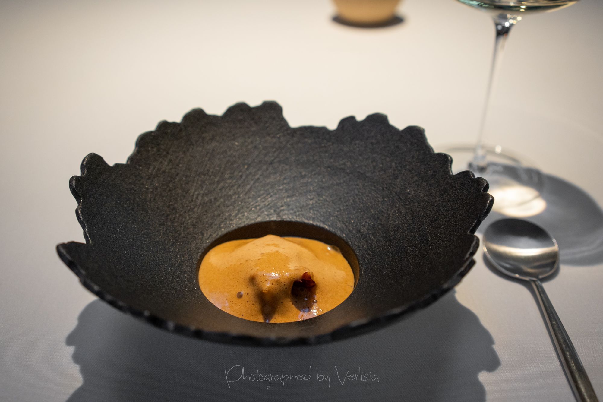 Hay Custard (Lamb Shank, CHanterelle Mushroom, Chive), Celeriac Cracker (Lamb Fat, Preserved Chive Blossom), Croquette of Lamb Rib