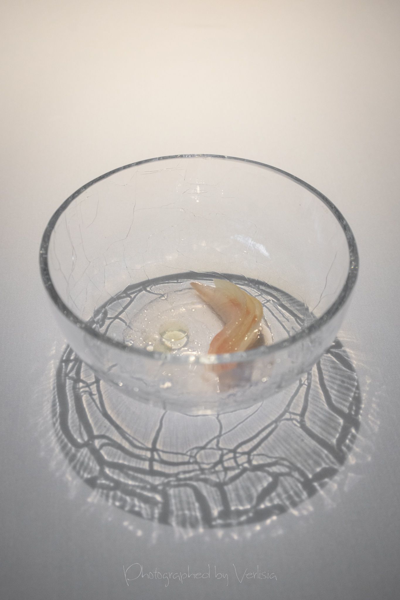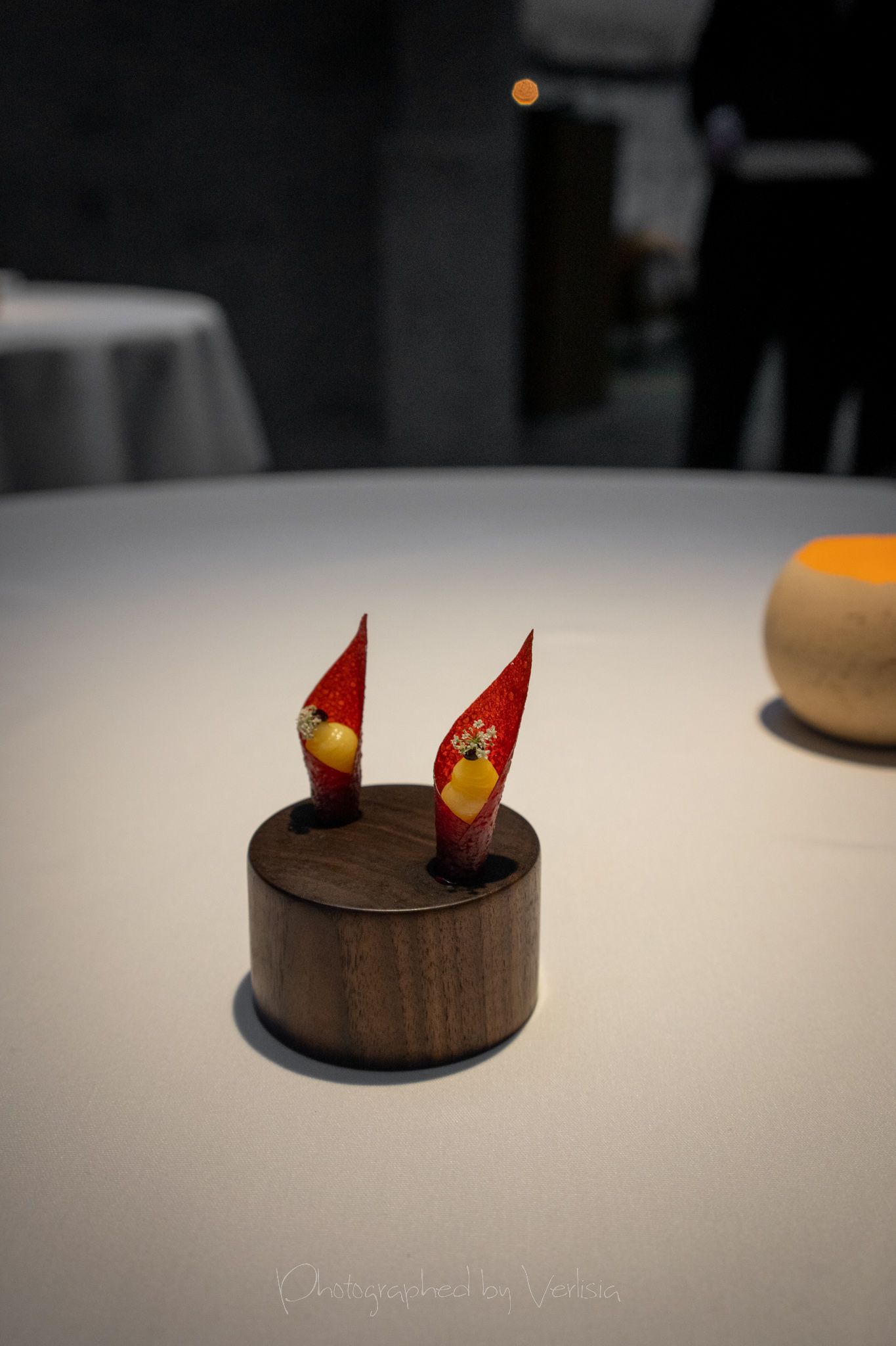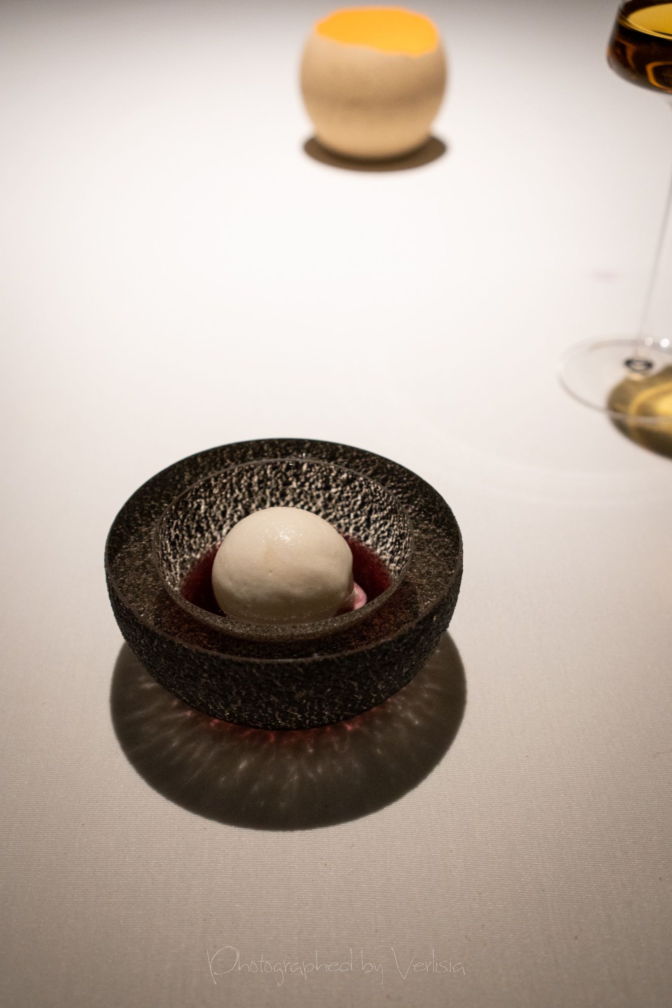Half Moon Bay Spot Prawn (Kohlrabi, Chamomile, Grilled Cream), Cornette of Grilled Beet (Bone Marrow, Huckleberry)