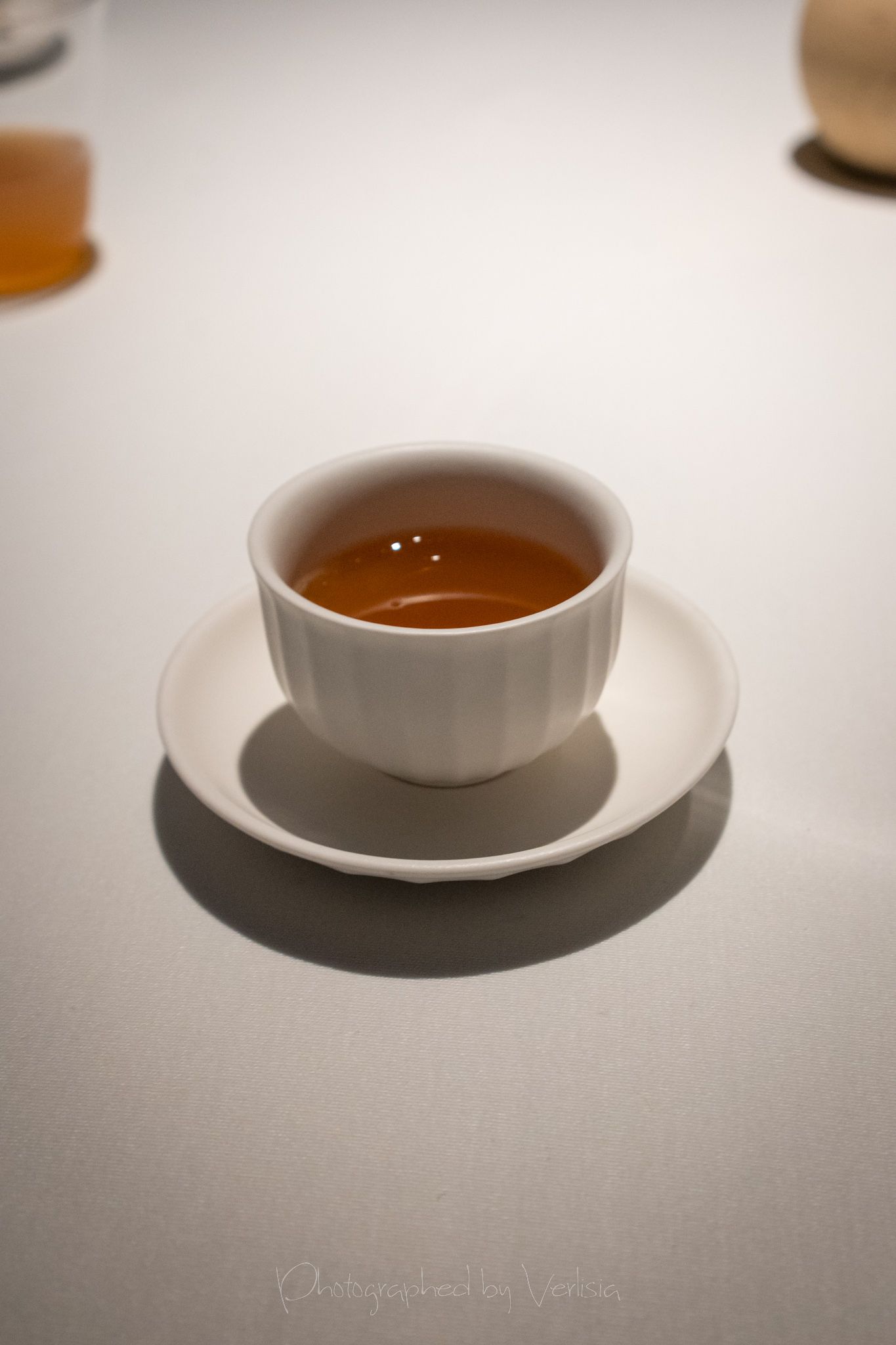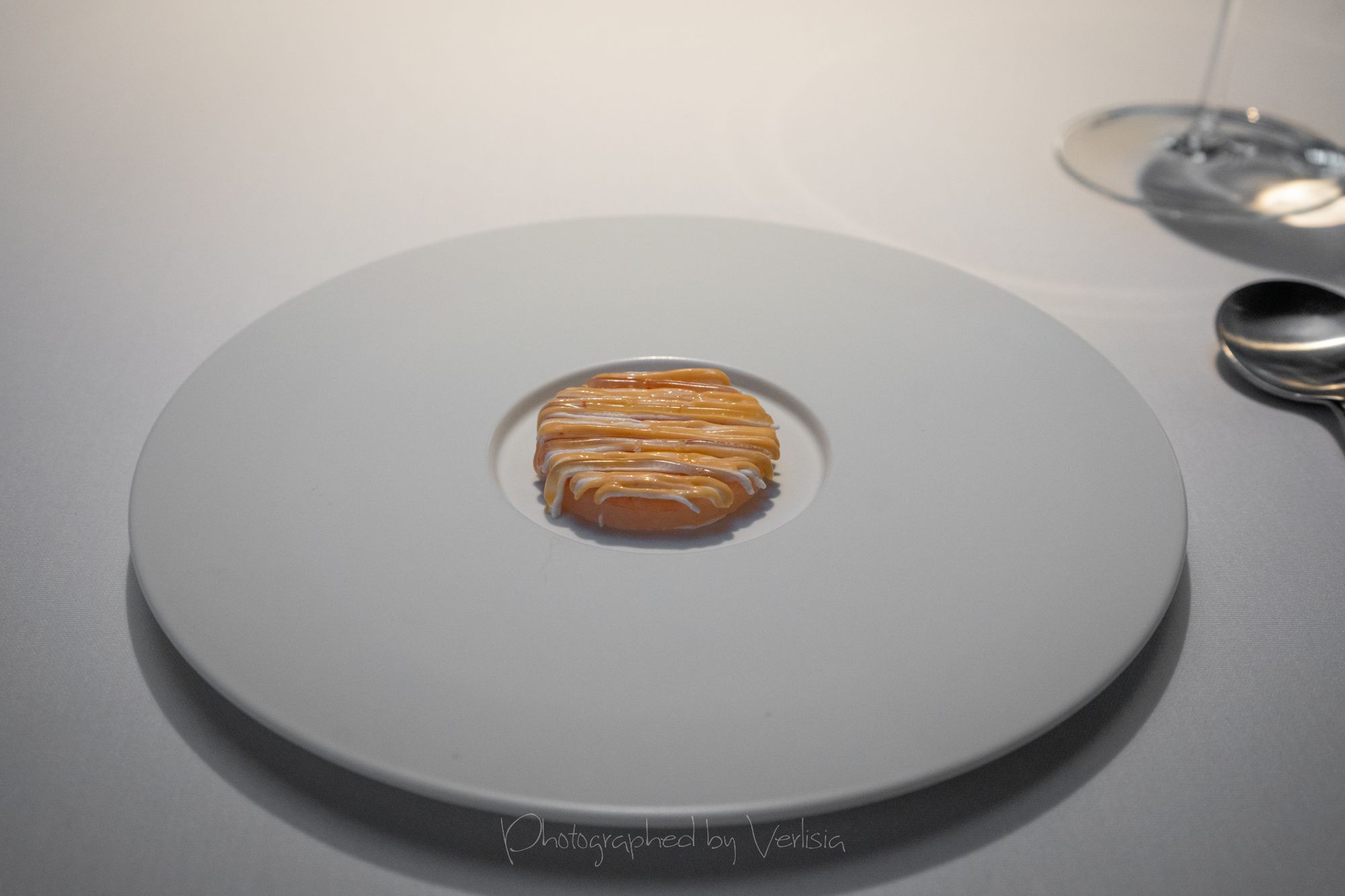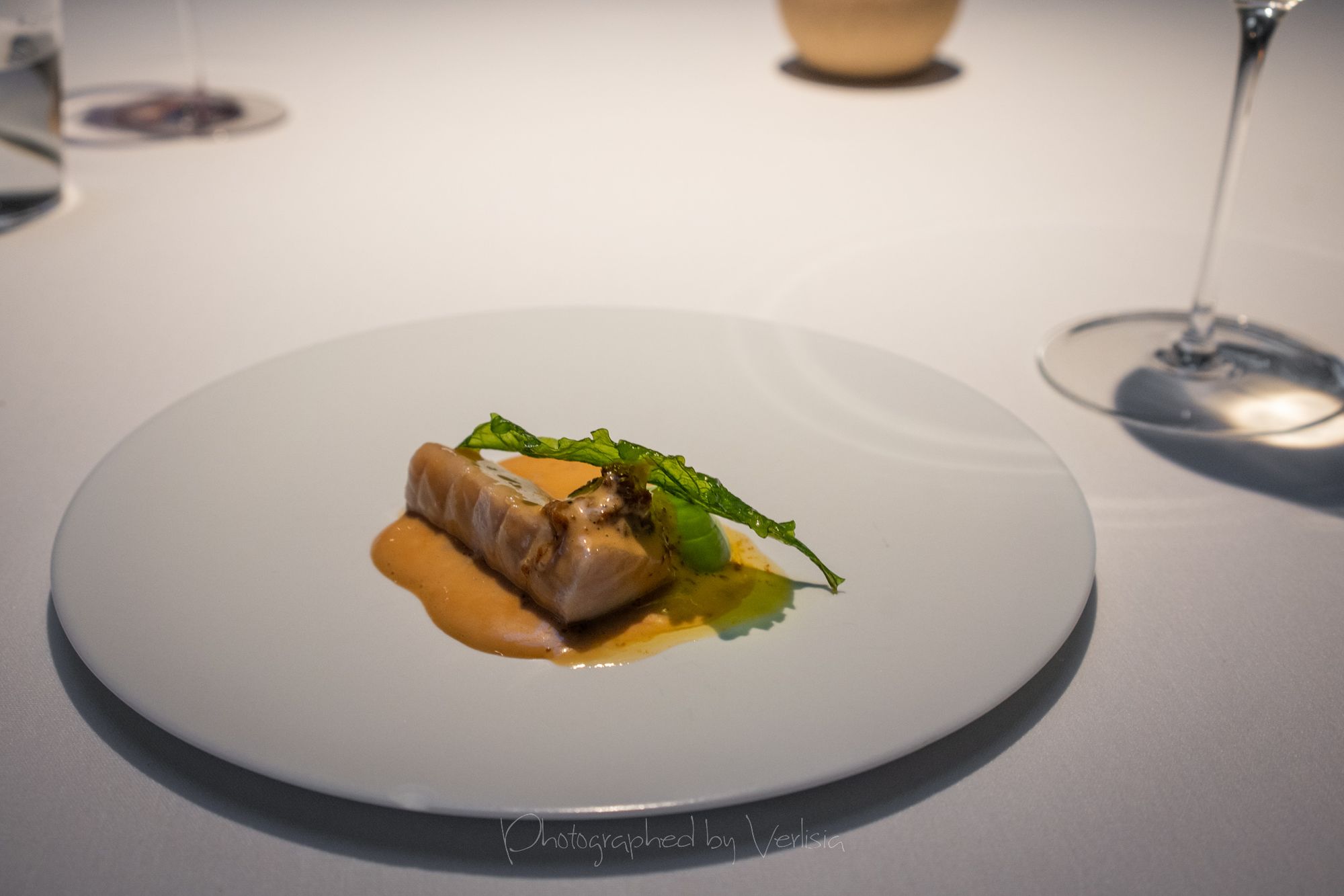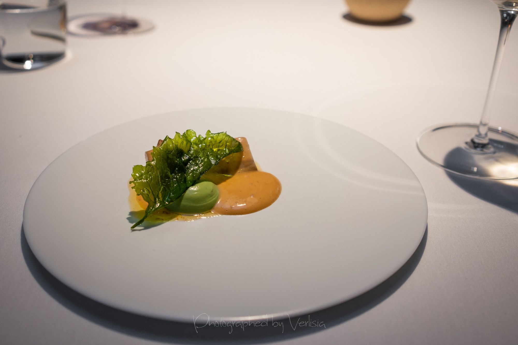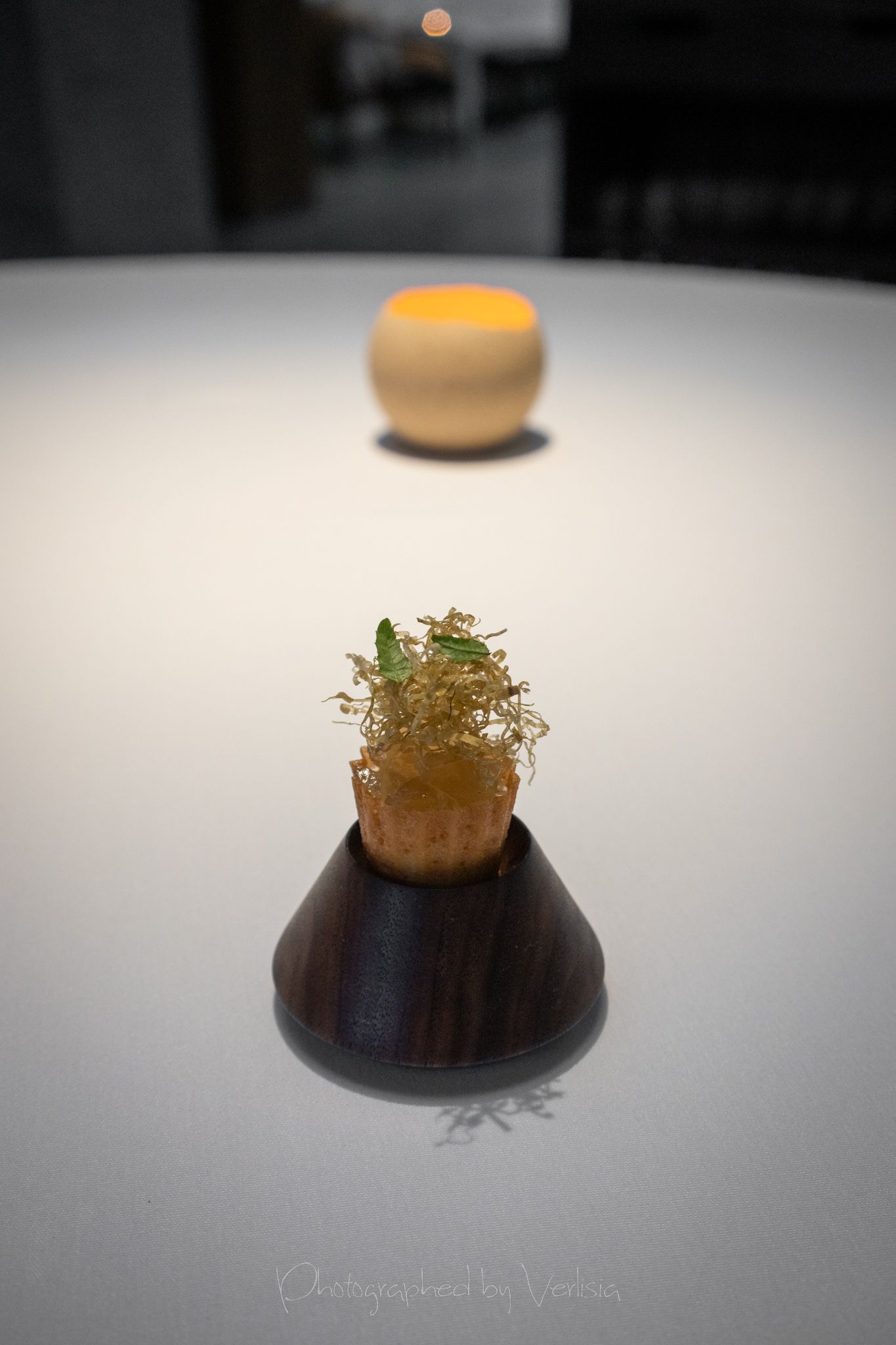 Shima Aji (Green Plum, Geranium, Pine, White Peach), Crustade of Sacramento Smoked Sturgeon (White Verjus, Kombu)