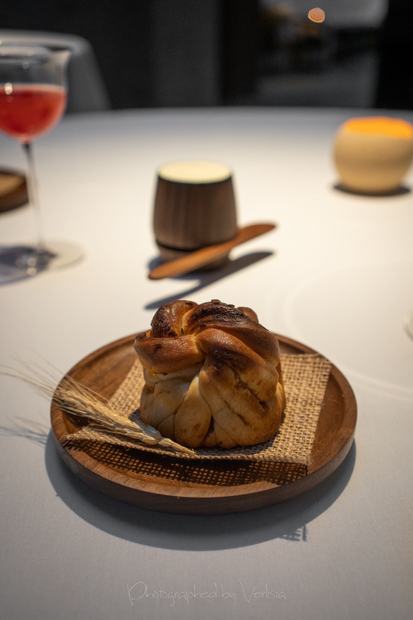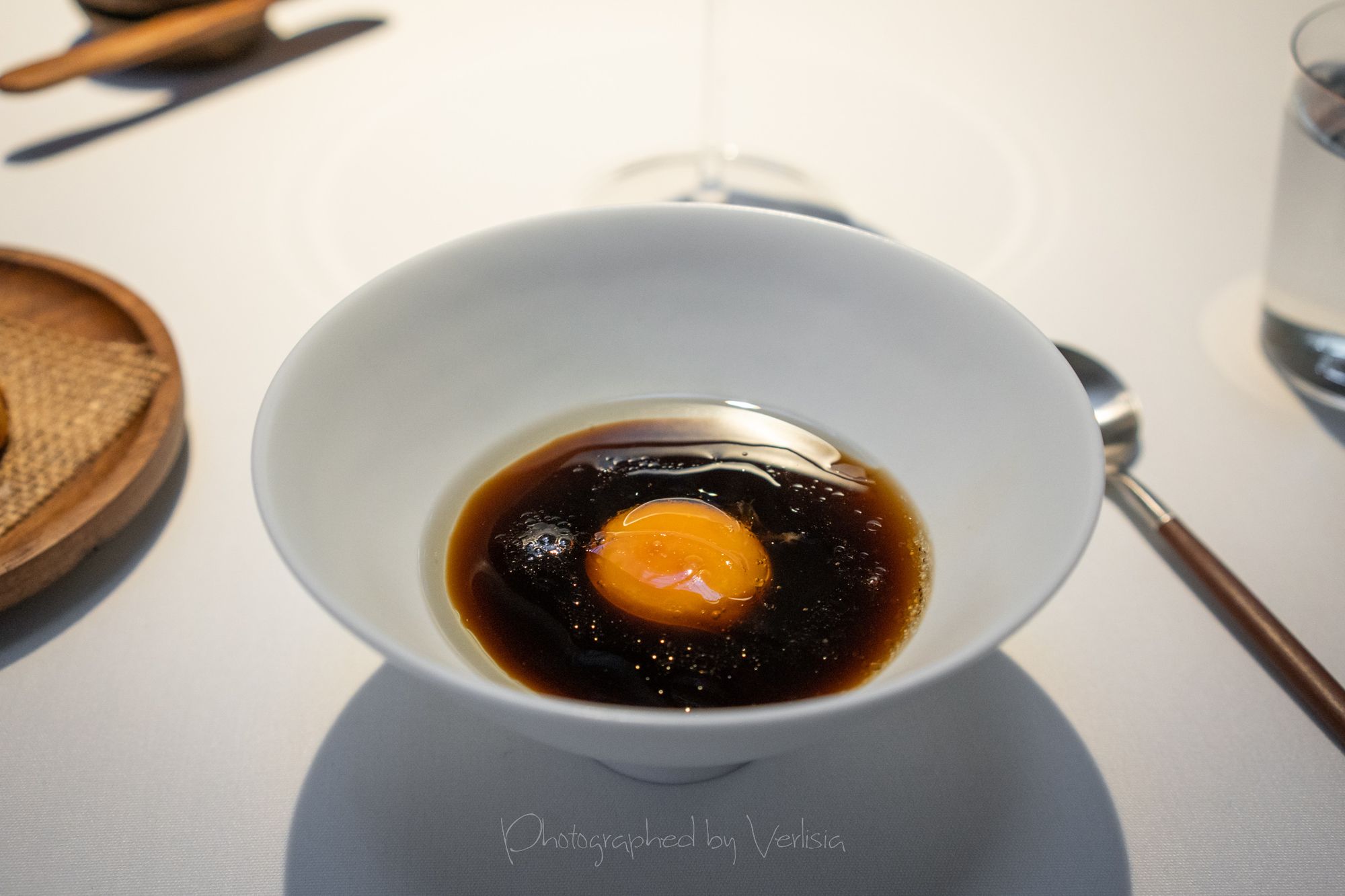 Slow-poached Jidori Egg Yolk (Pickled Allium, Broth of Smoked Mushroom), Fermented Potato Bread (Beef Drippings, Caraway), Butter