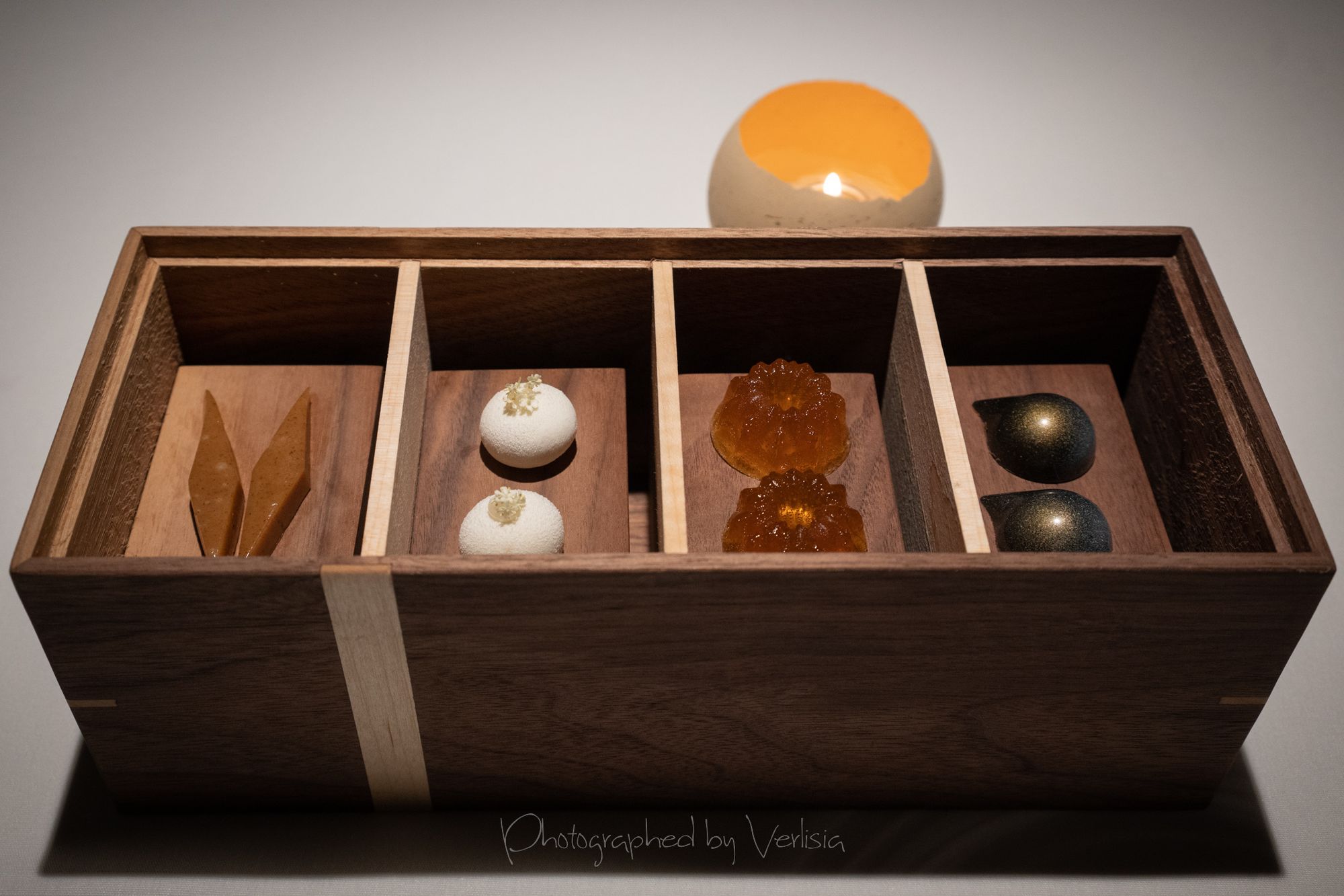 Hazelnut + White Chocolate + Elderflower, Salted Butter Toffee, Meadowsweet Pate de Fruit, 70% Chocolate + Pine