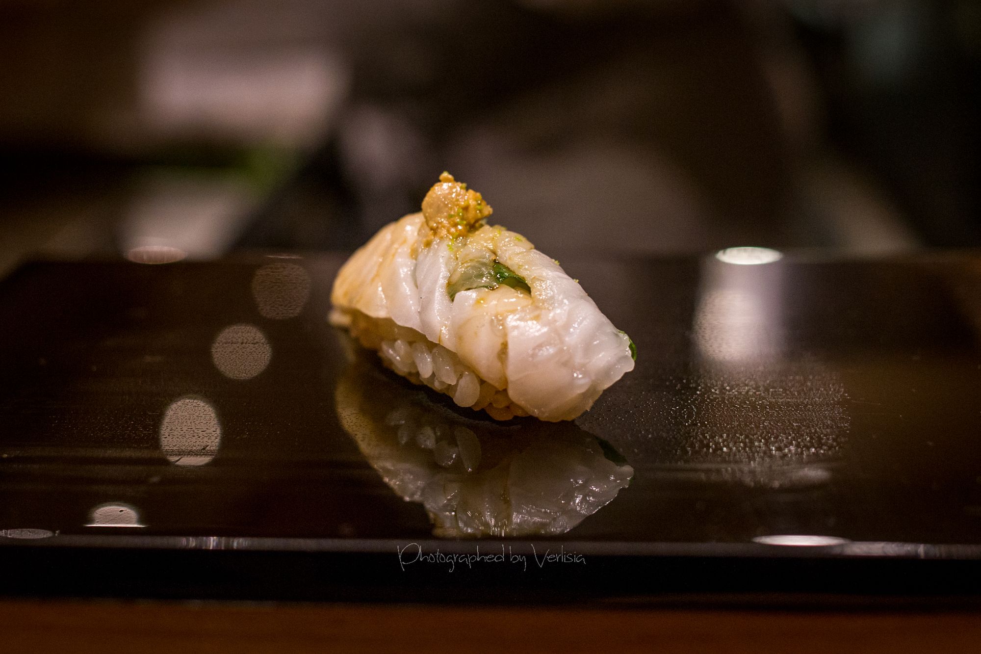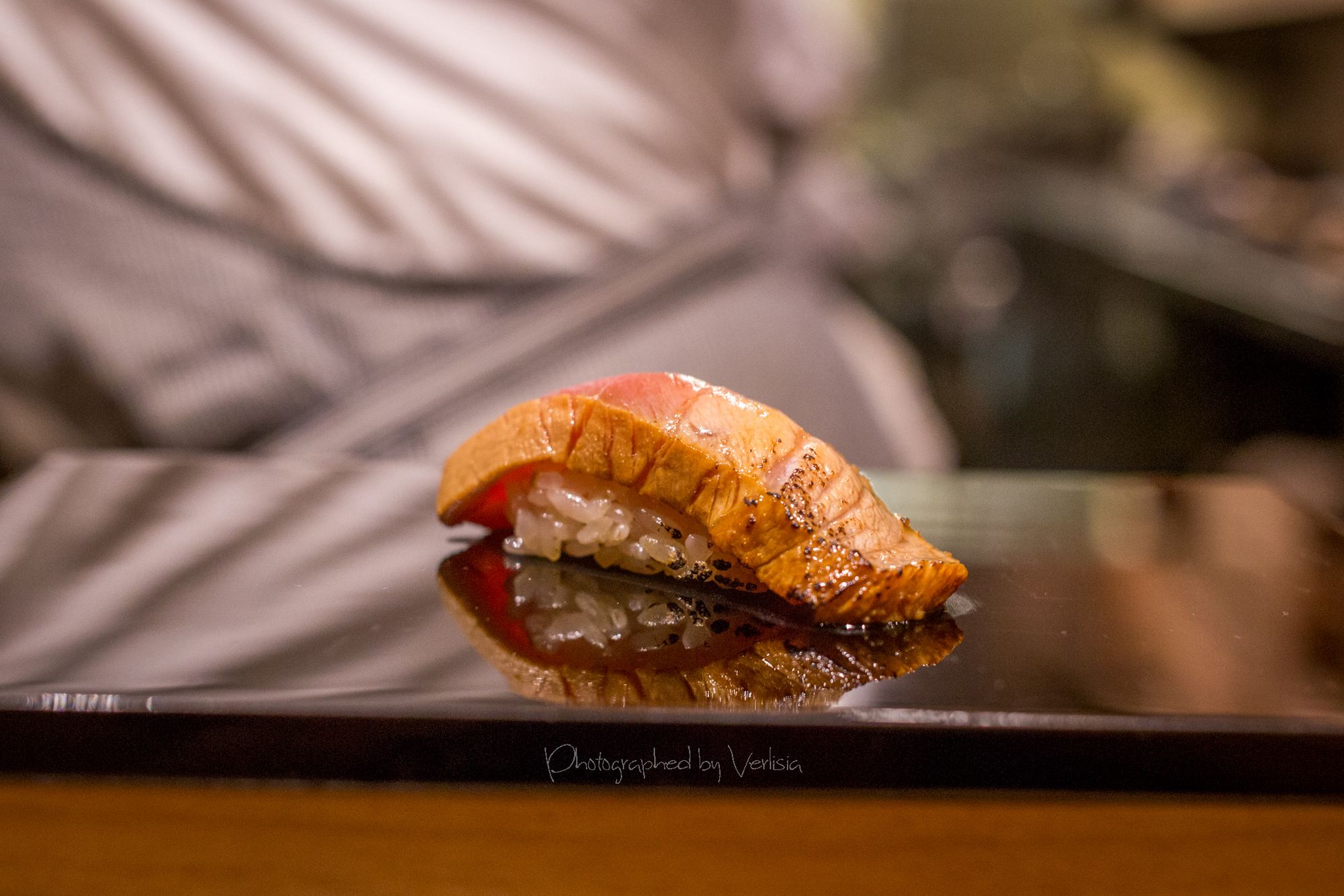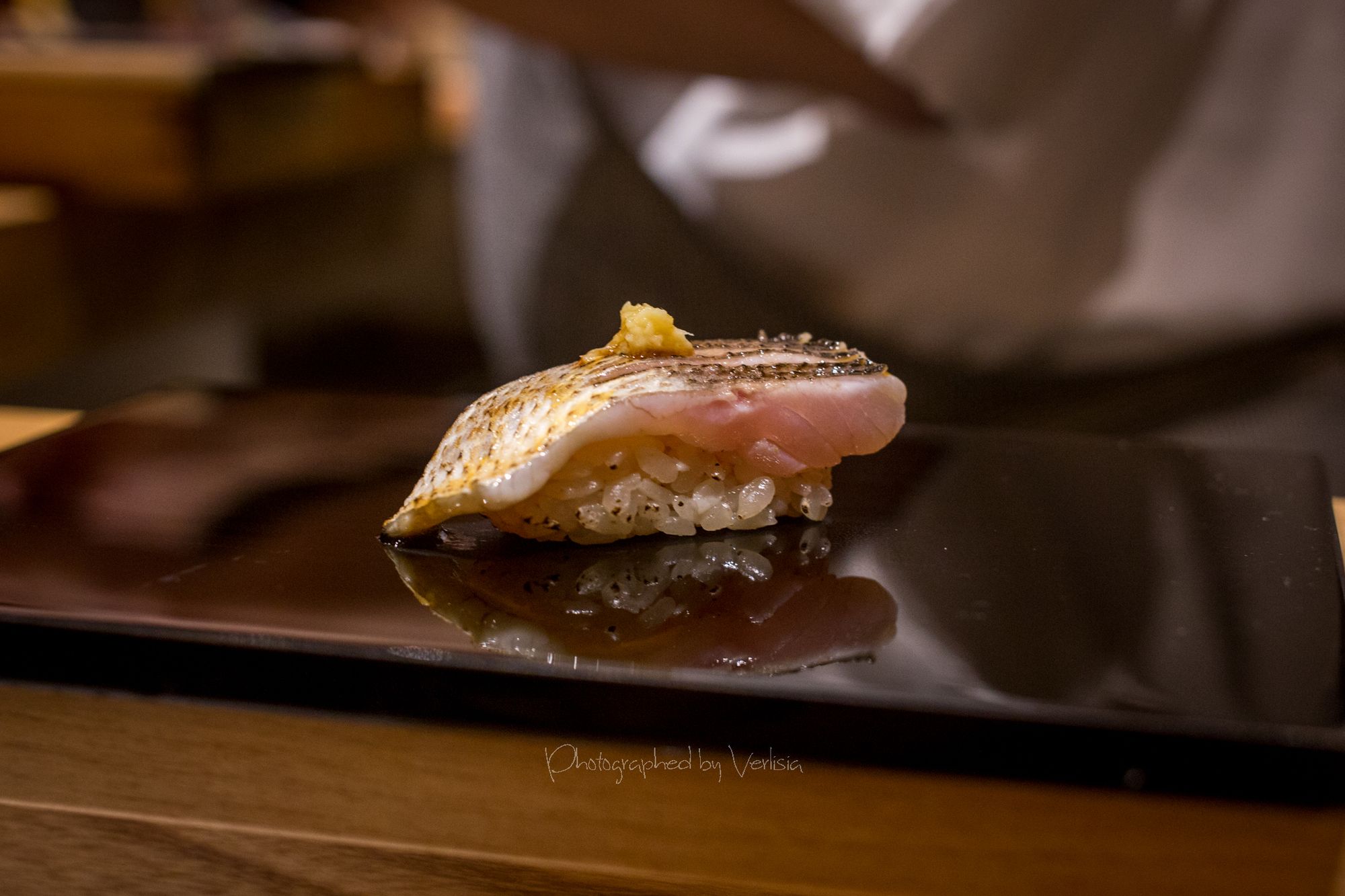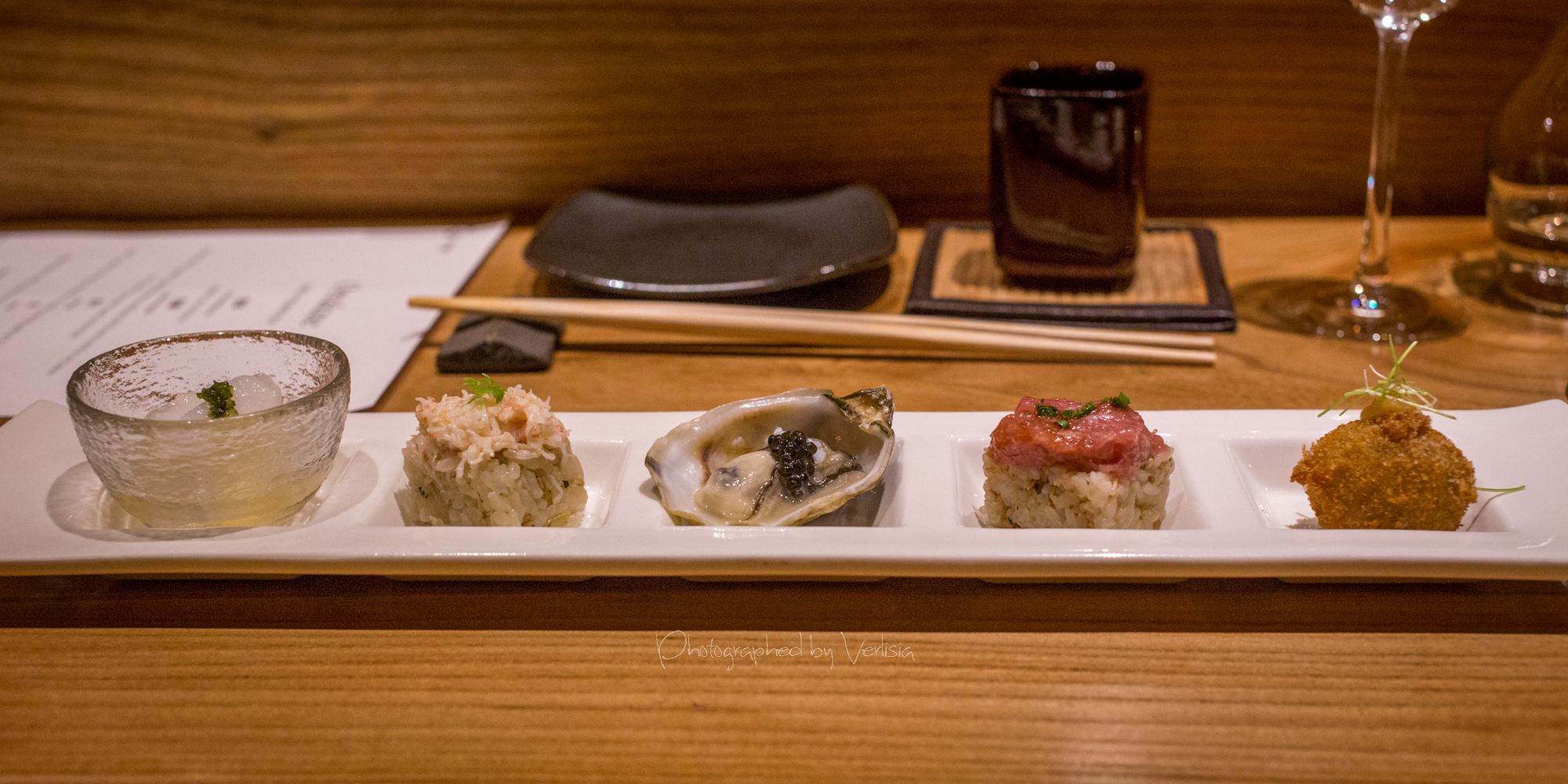 Welcoming Tea Konbu Cha (Kelp Tea), Dewazakura Dewasansan "Green Ridge" Junmai Ginjo, Sushi Predule - Zuke Chutoto, Sushi Predule - Engawa, Sushi Predule - BonitoSashimi - Ocean Trout and Hotate, Italian black truffle miso soup with Eringi and Shimeji mushrooms, Kamo-Dango (duck miso soup with Mitsuba leaf)Hassun - Shigoku oyster with French Daurenki Caviar and four kinds of Le petite platesWarm Dish ("Kinki" big hand snapper, "Mizoreni" with Matsutake mushroom), Sushi Chic - Kan Buri (Wild winter yellowtail), Kamasu - Japanese BarracudaKing Salmon - Copper river king salmon, Sushi Finale - Grade A5 Miyazaki Wagyu beefSushi Finale - Toro, Kaisui Uni - Deep ocean packed Hokkaido sea urchinYuzu and shiso-leaf sorbet, "KURI" chestnut creme-brulee, "Maccha" green tea affogato with vanilla ice cream