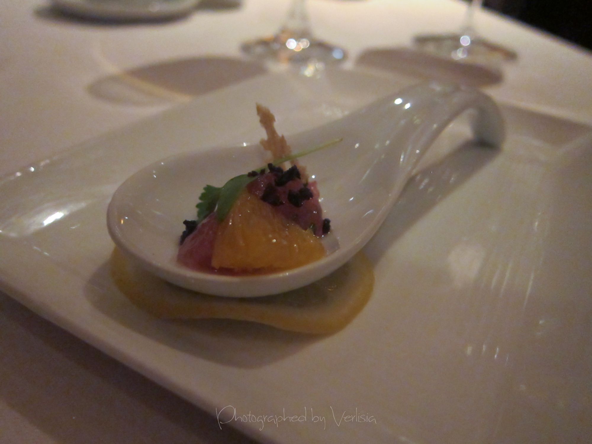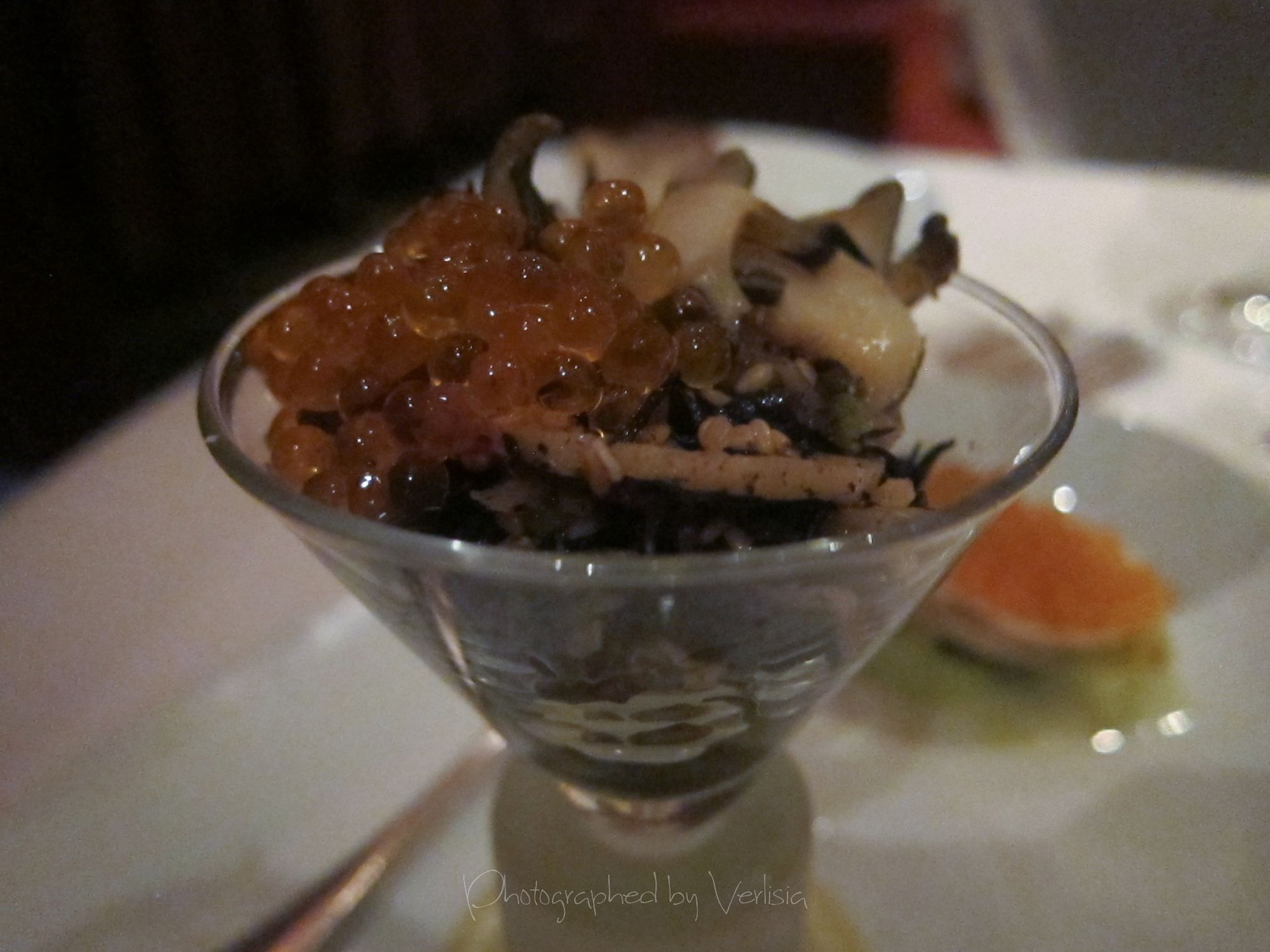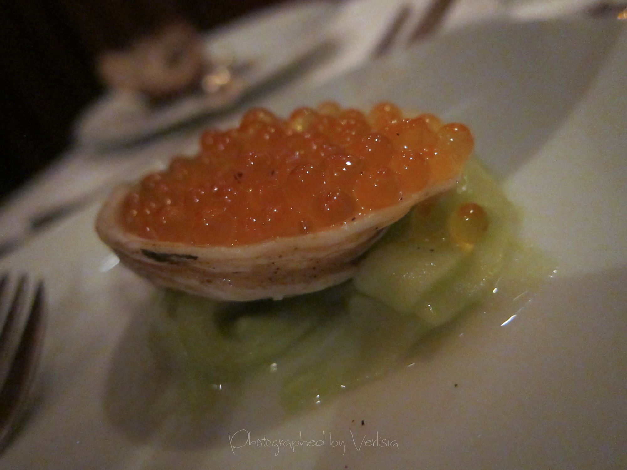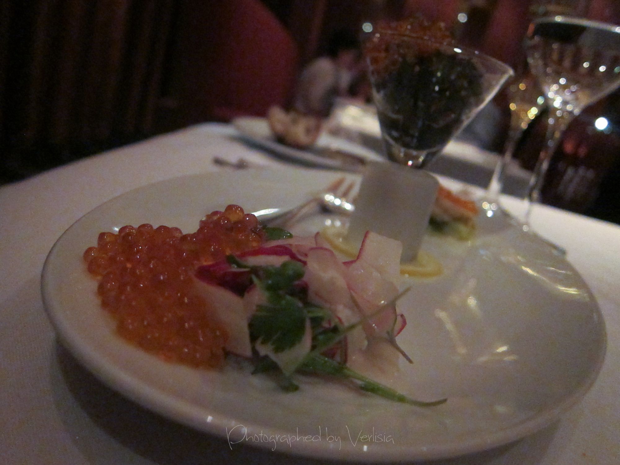 "Tasting of Passot Roe" - Dashi Poached Monterey Abalone with Passot Roe, Tuna Carpaccio with Passot Roe, and Kusshi Oyster with Passot Roe