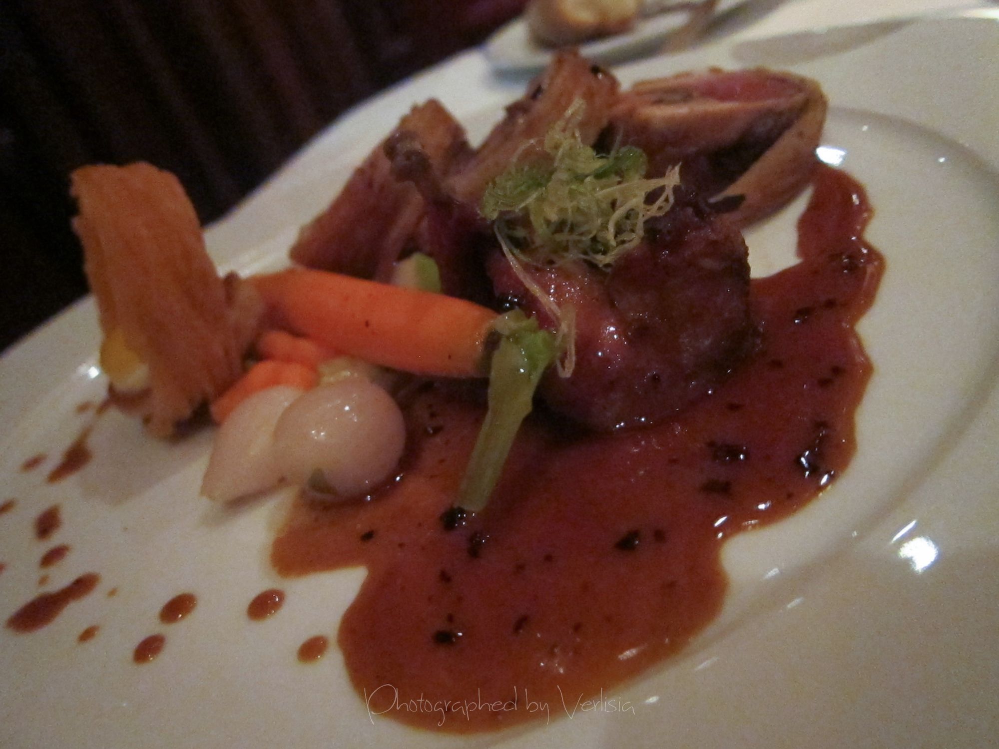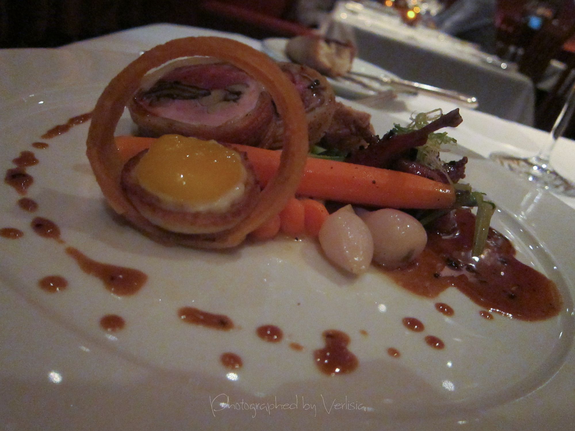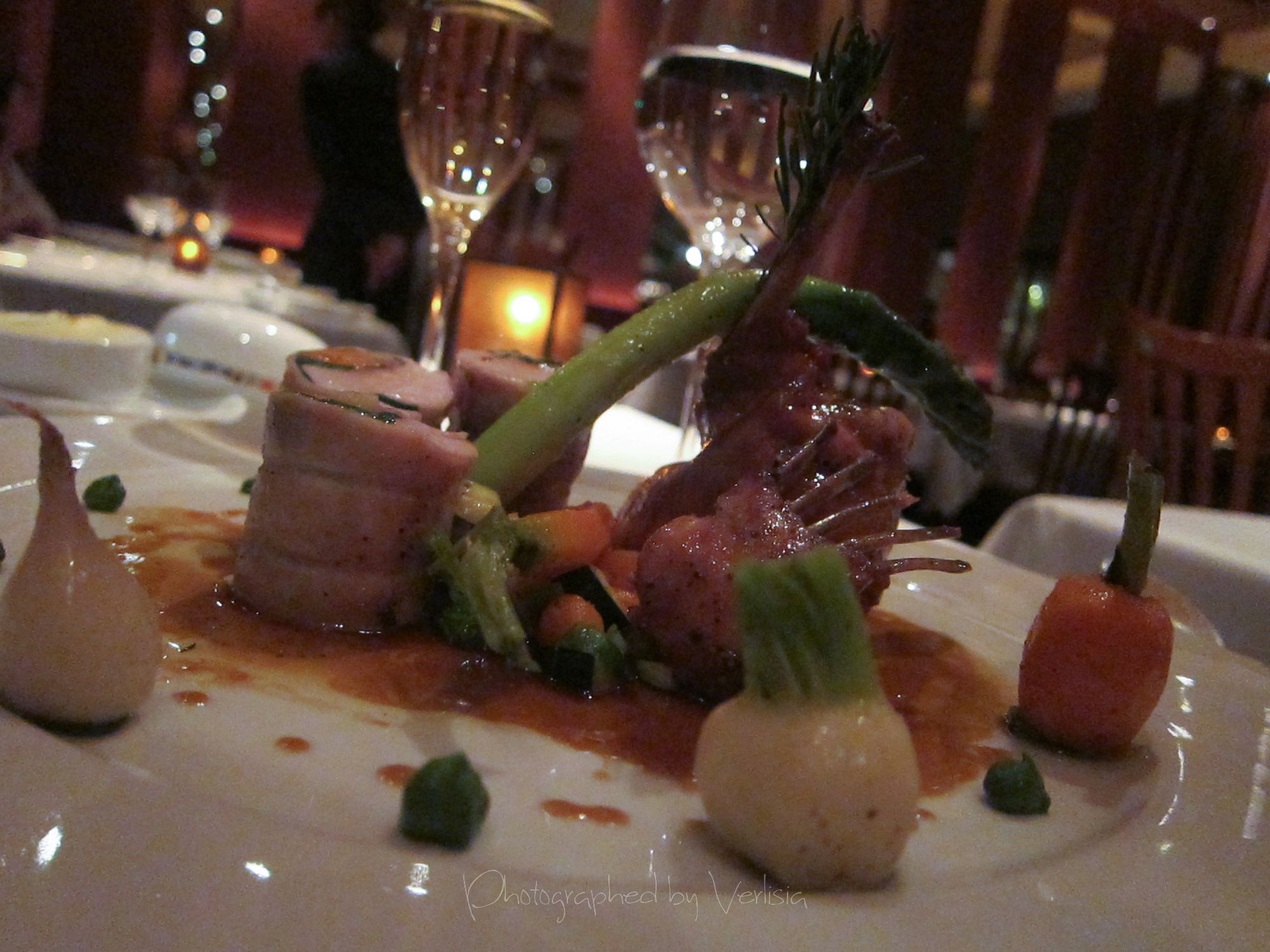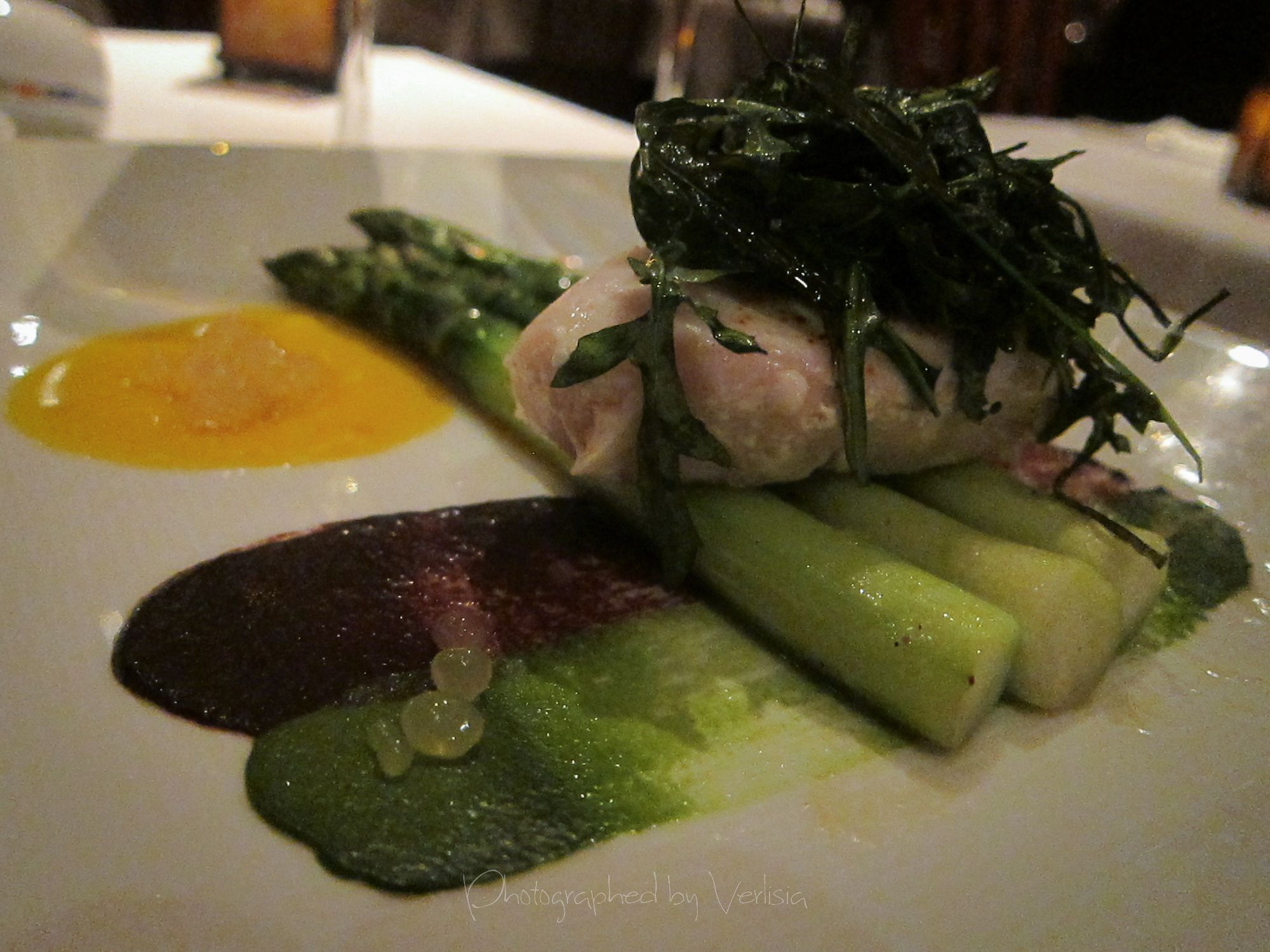 Slow Cooked Butterfish on Delta Asparagus (Black Olive Puree, Crispy Arugula, Carrot-Orange Vinaigrette), Trio of Devil's Gulch Ranch Rabbit (Loin, Rack and Braised Leg) with Baby Vegetables, Roasted Garlic and Natural Jus