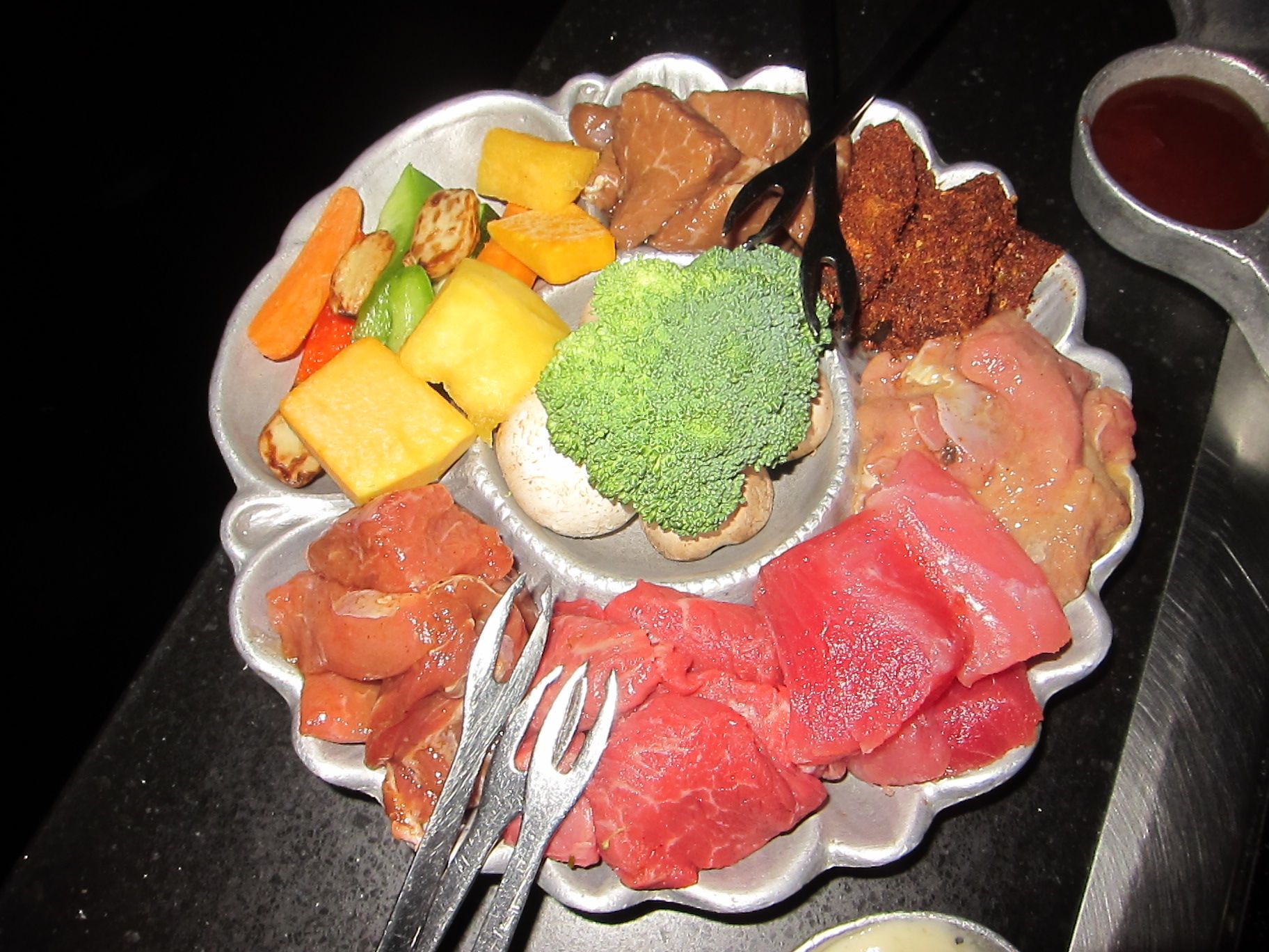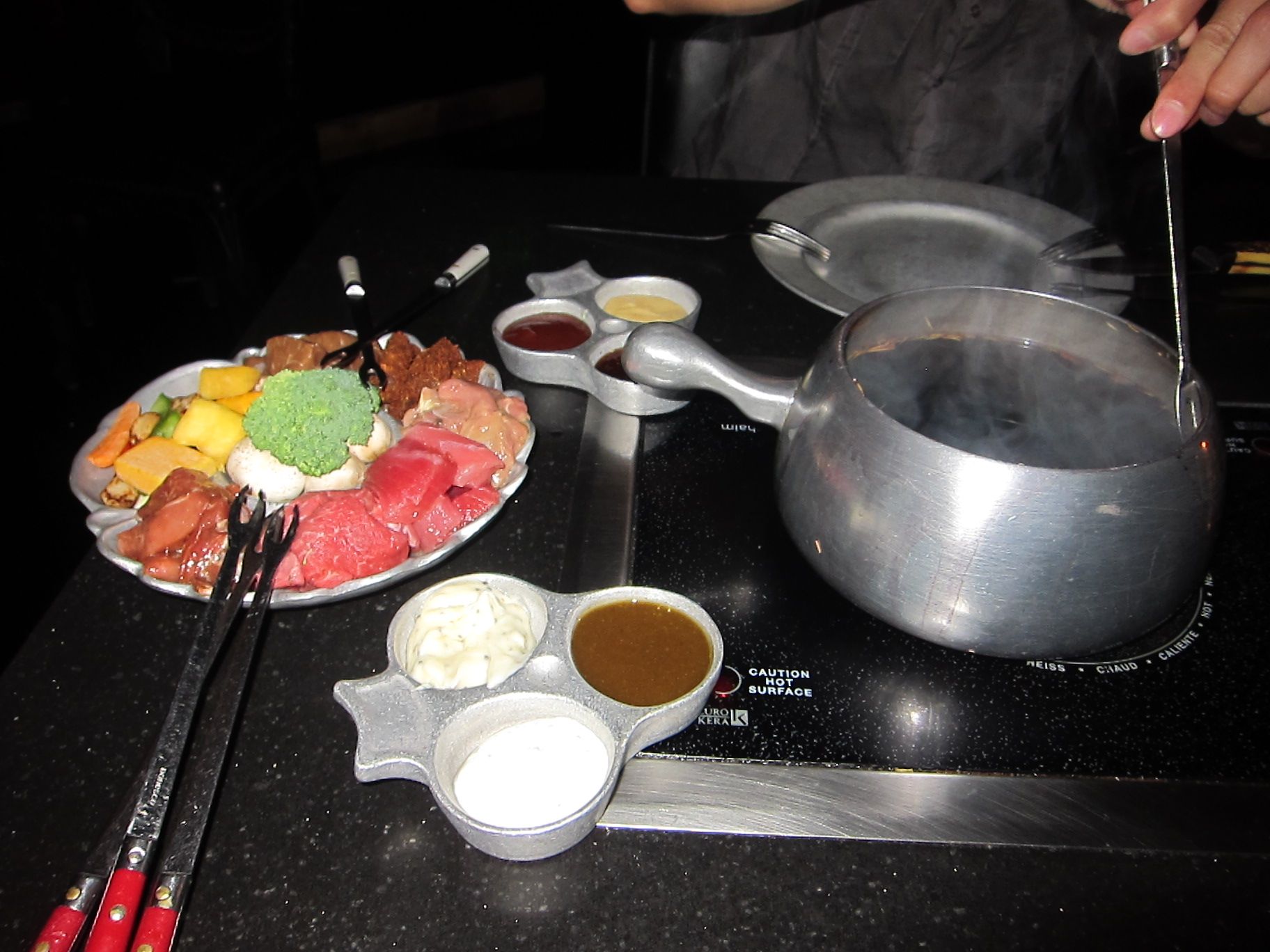 Chef's Salad with Honey Mustard Sauce, Spinach Salad (Olive Oil & Balsamic Dressing on the Side), Wild Mushroom Cheese FondueFondue Feast (Black Angus Filet Mignon, Teriyaki Sirloin, Spiced Fish, Wild Duck, Llama and Tuna)Chocolate Fondue - The Decadent One