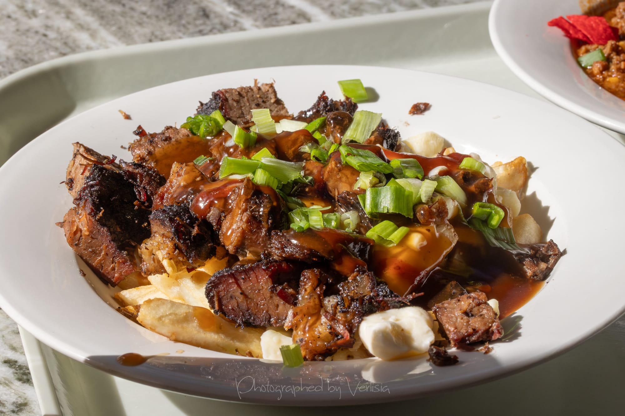 Beef Chili (Shredded Cheese, Sour Cream, Green Onion, Tortilla Strips); Brisket Burnt Ends Poutine (Fries, Cheese Curds, Chopped Smoked Brisket, Gravy, BBQ Sauce, Green Onion)