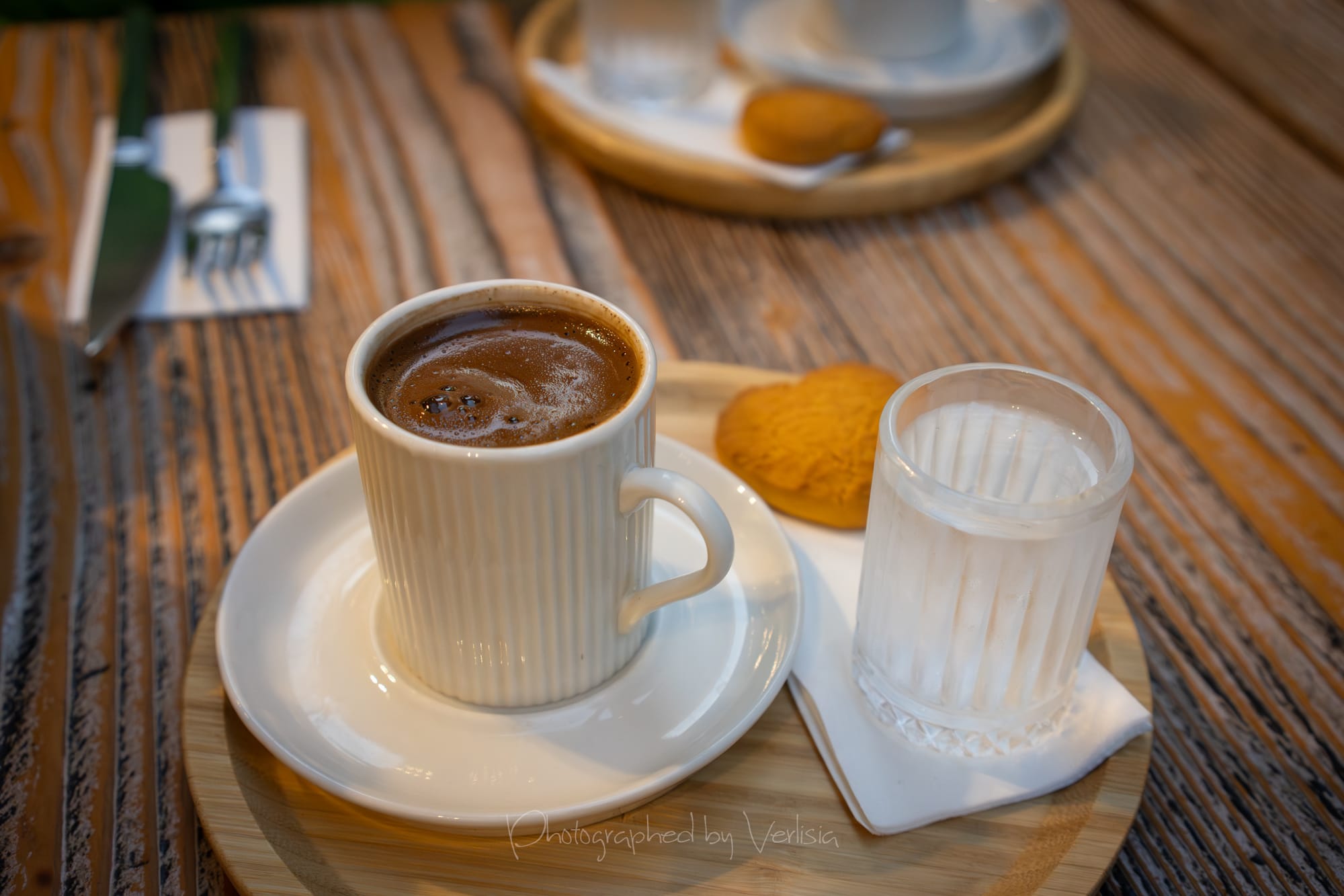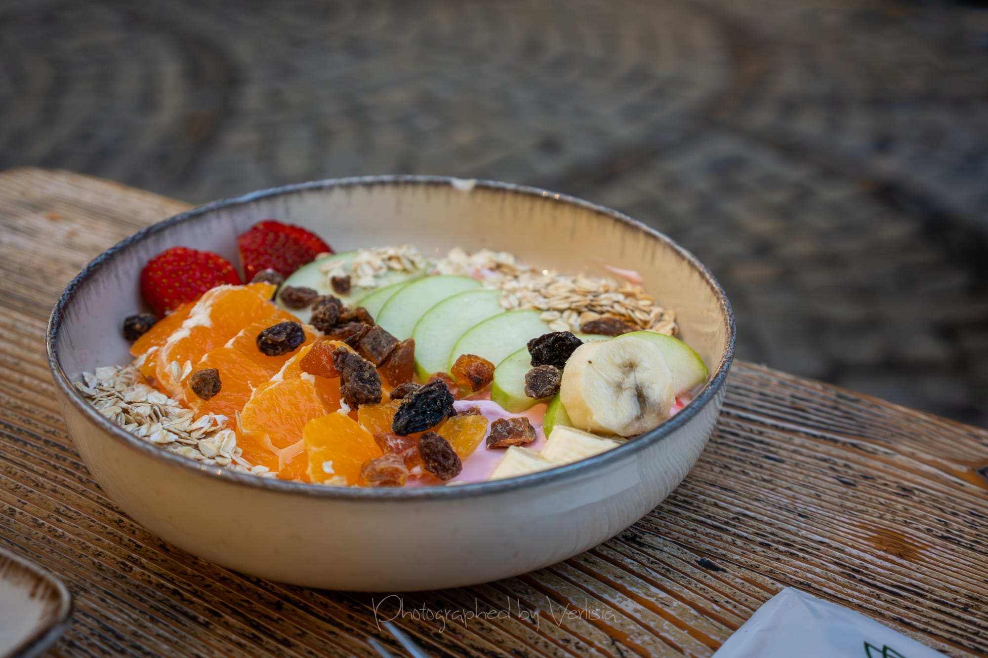 Turkish Coffee; Exotic Bowl (creamy pineapple, banana, green apple, yogurt, honey and lemon, topped with oats and seasonal fruits)