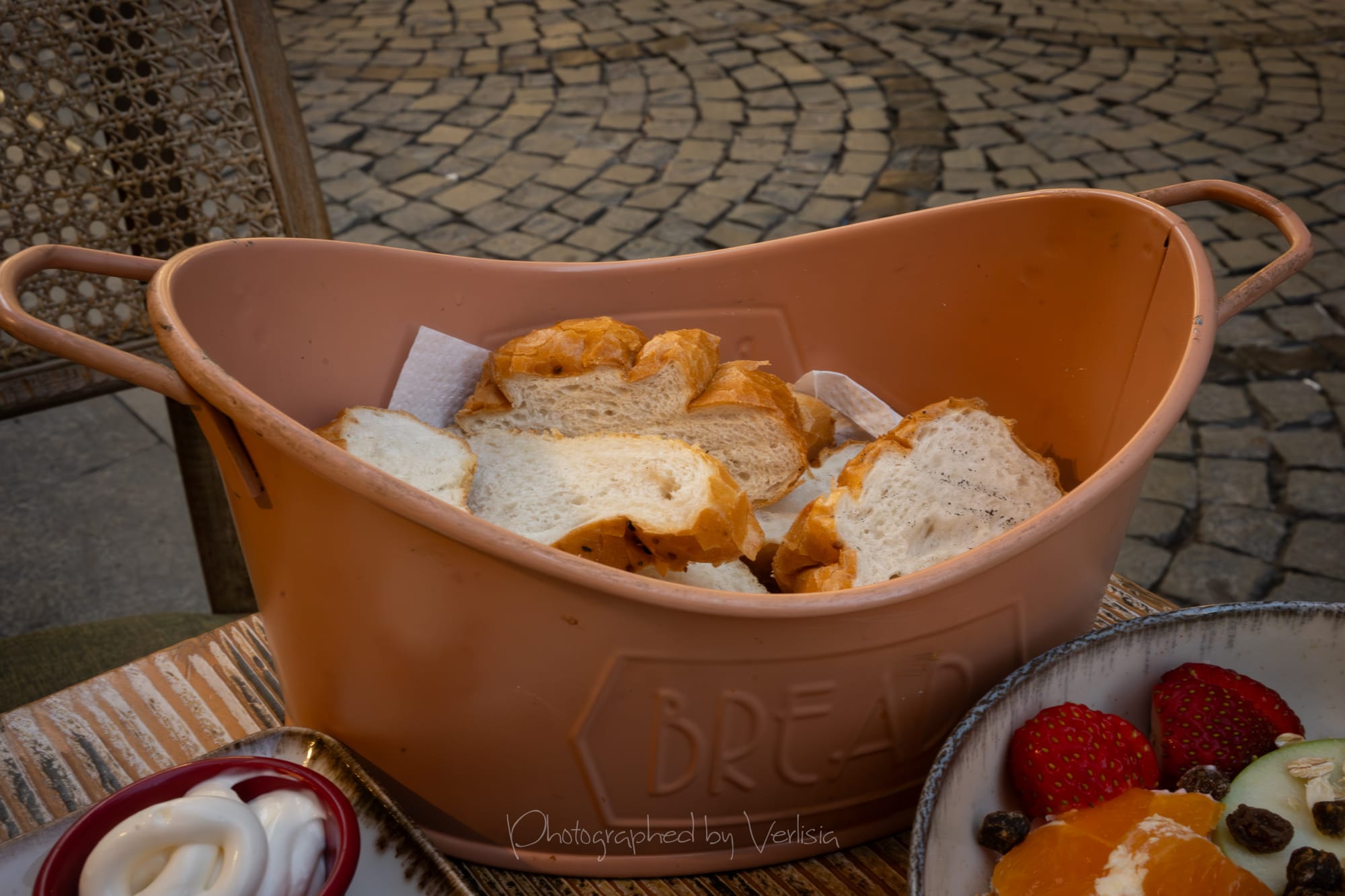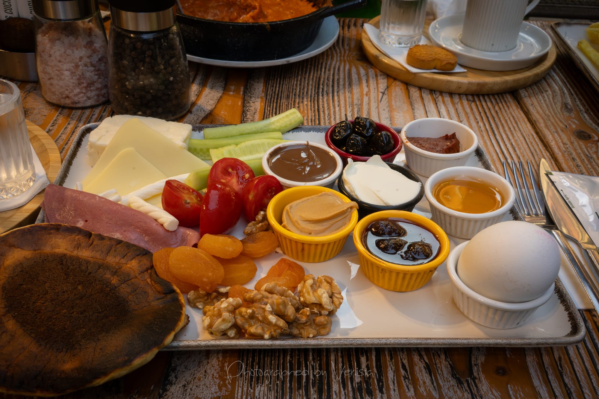Breakfast Plate (cheese varieties, beef ham, pancakes, jam, clotted cream, honey, tomatoes, cucumber, black olives, boiled eggs, dried apricots, walnuts, acuka, peanut butter and chocolate); Bread