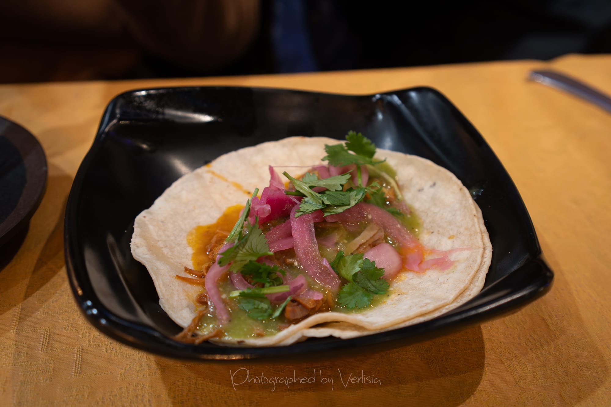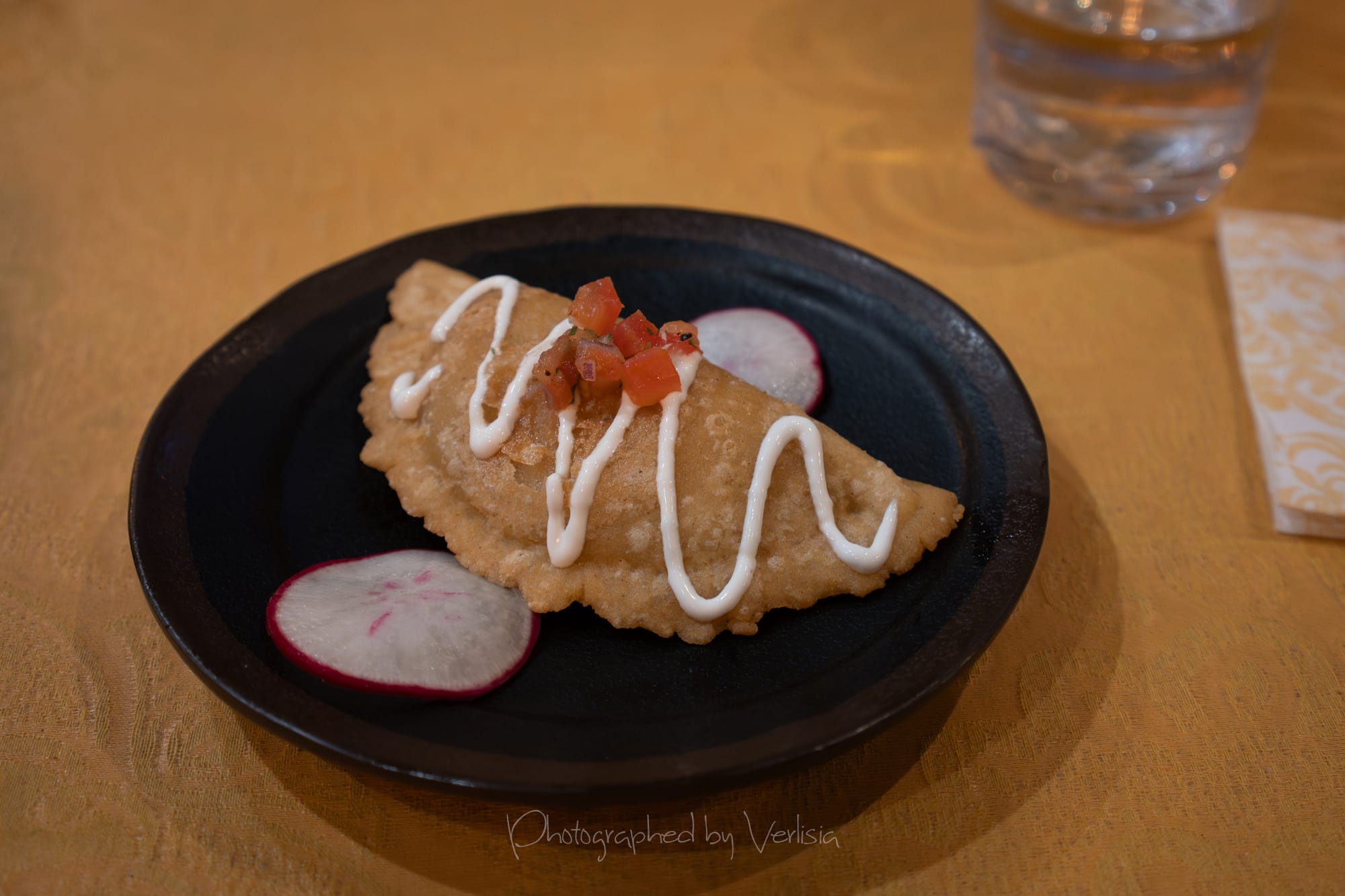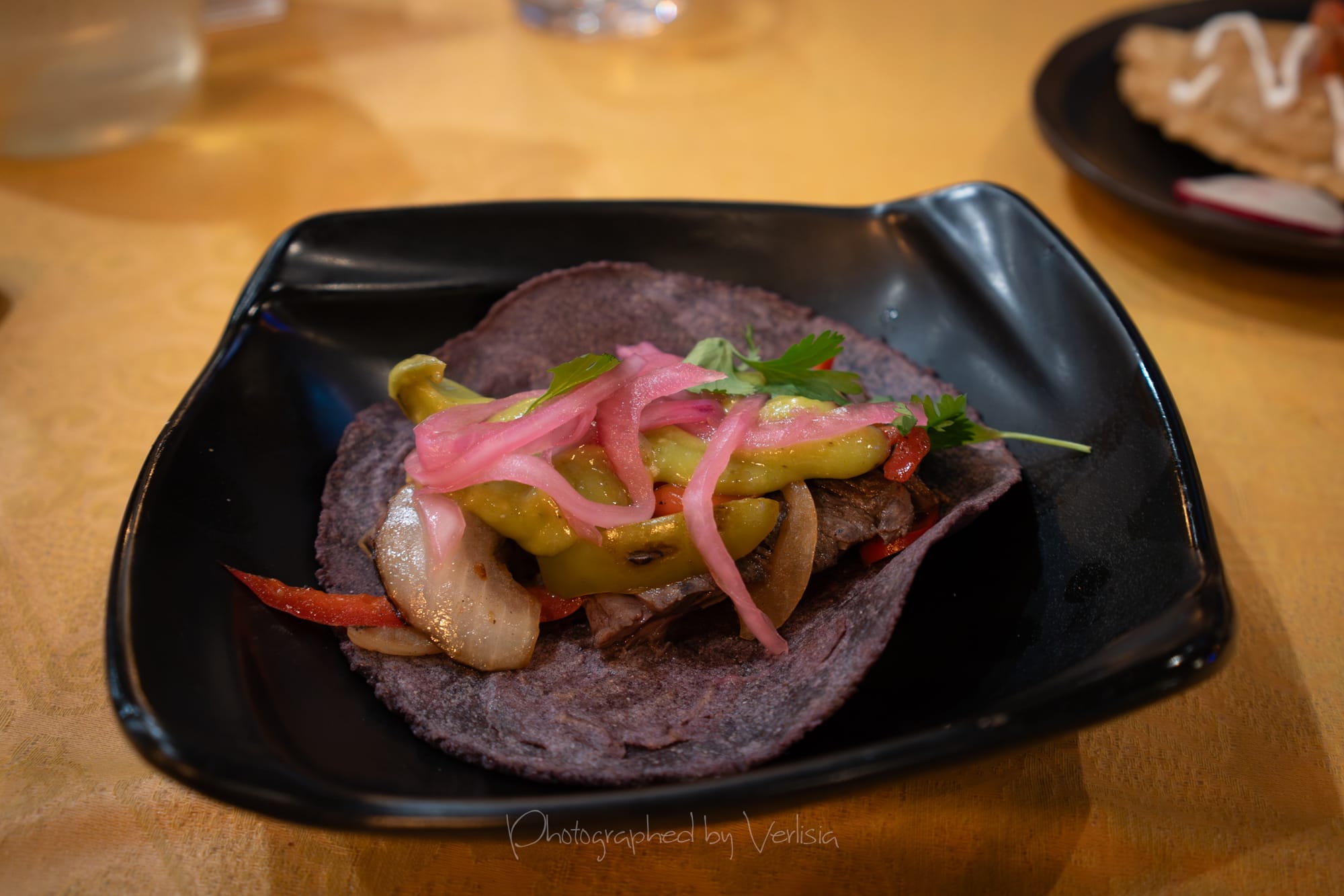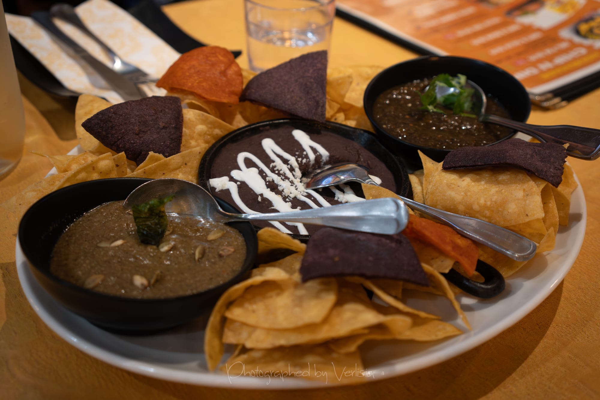 Chips and Salsa, Wagyu Beef Empanda, Churrasco Steak Blue Corn Taco (Steak, pickled onions, cilantro, creamy avocado)