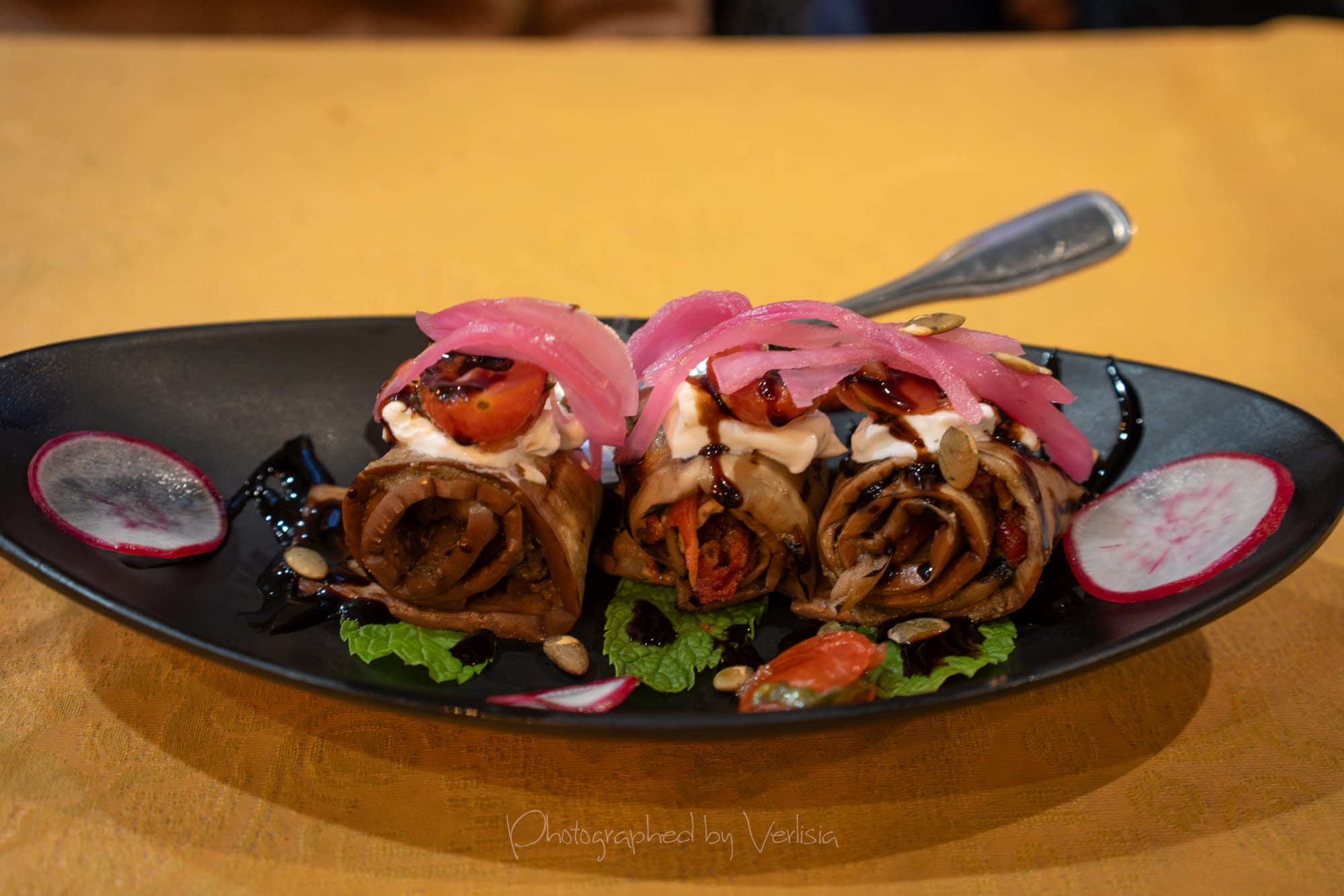 Elotes (corn ribs, sweet and sour crema, crispy onions, spices and cilantro leaves), Eggplant Rolls (charred eggplant, pumkin seed, xni pec, pickled onions)