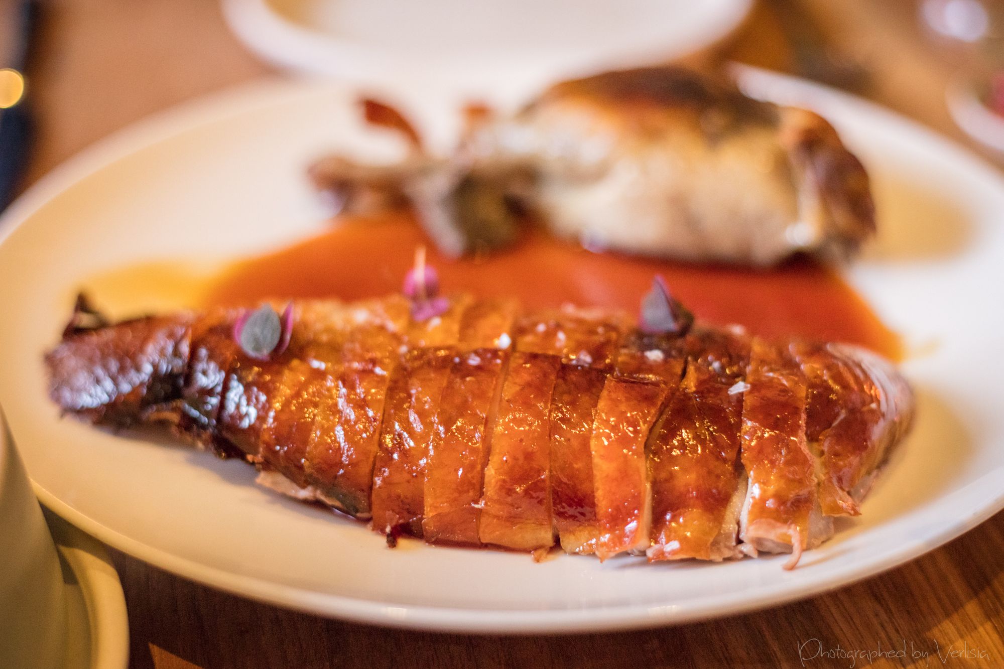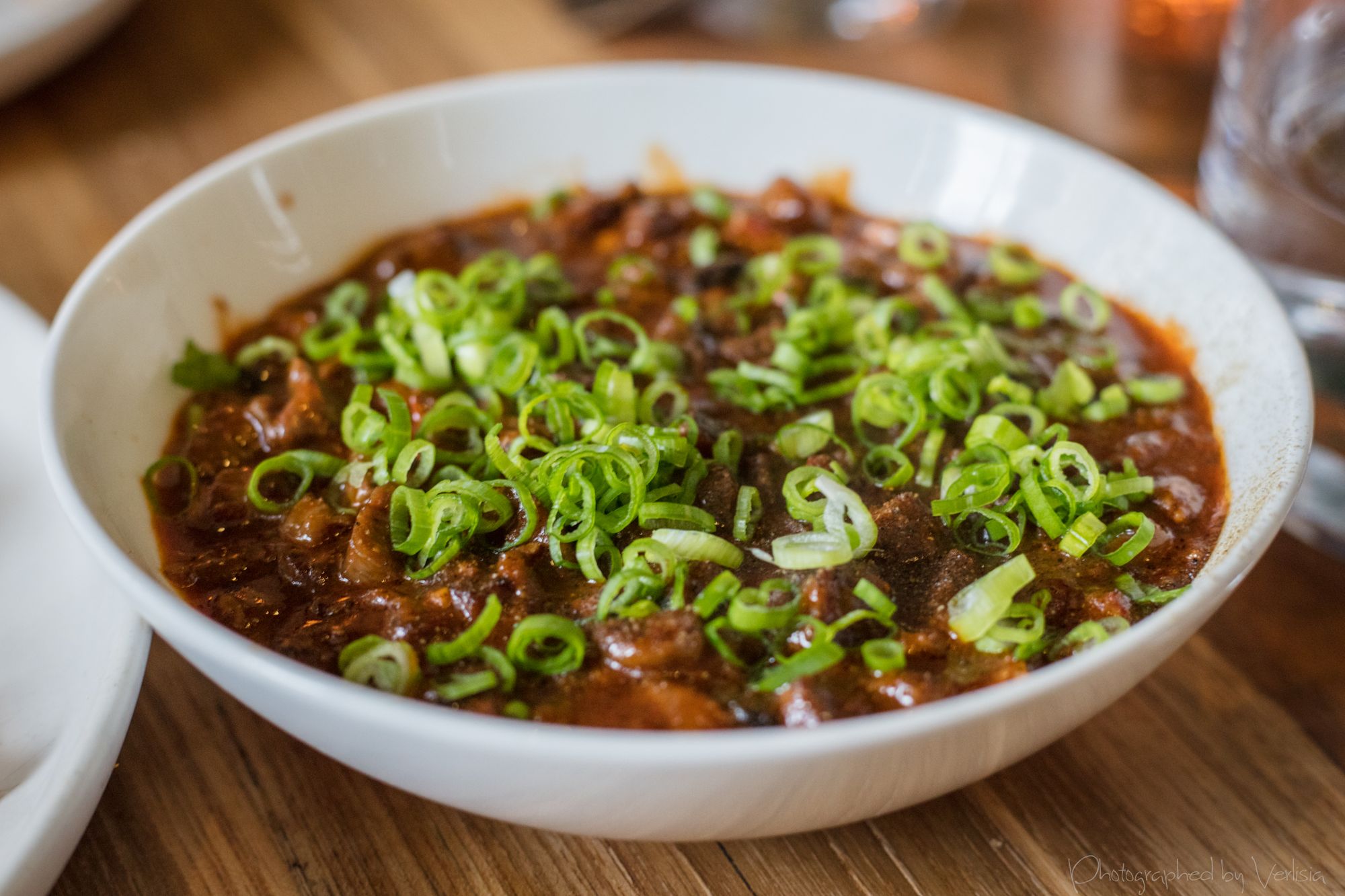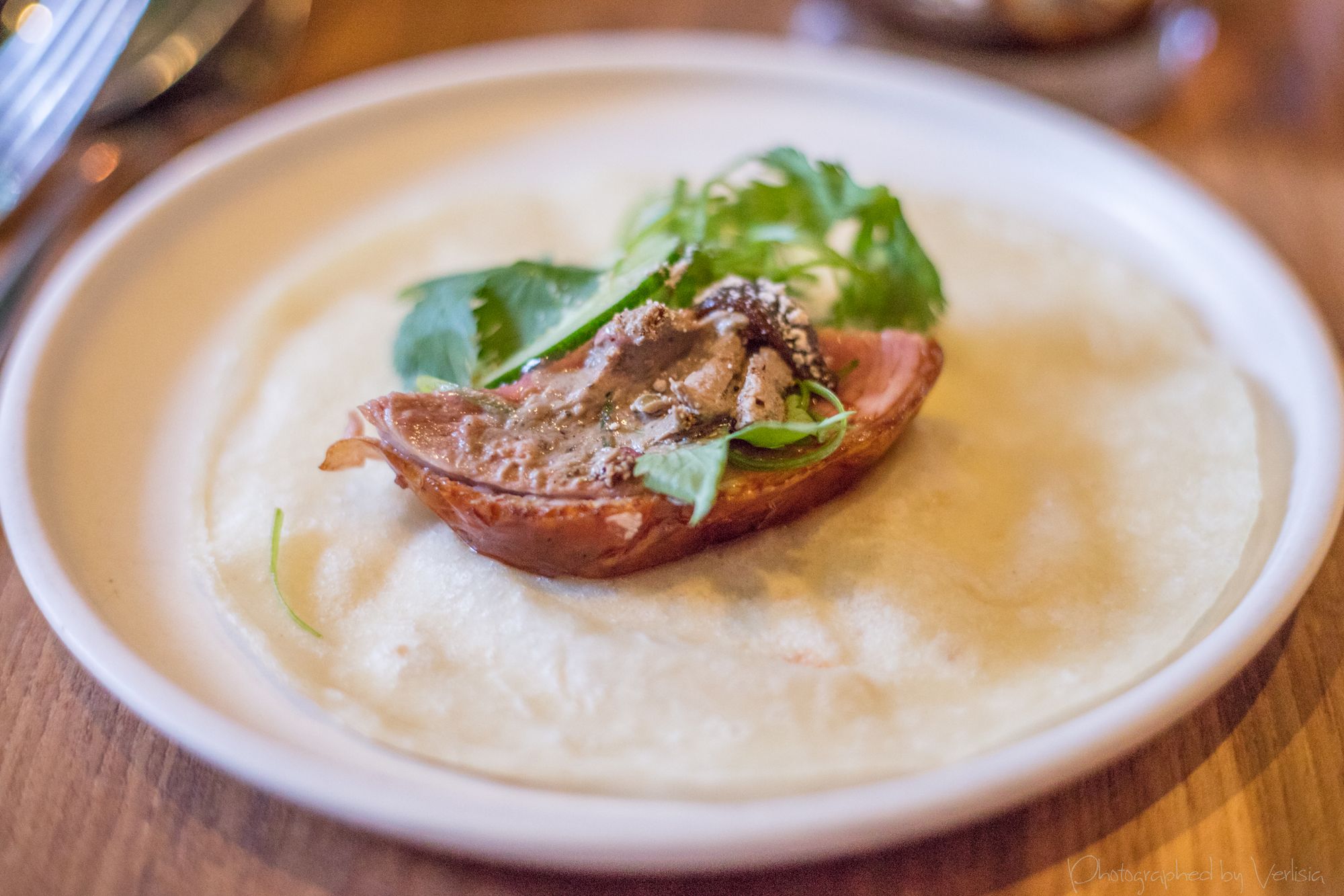 Charcuterie (Devil's Gulch Pig Headkolhrabi, tea egg, amaranth), Charcuterie (Gilled Beef Tendoncelery leaf, bell pepper)Wontons (pork, sichuan peppercorn, Monterey squid), Ribeye Cap Mapo Tofu, Sizzled Alaskan Halibut (oyster broth, bok choy, young ginger, celtuce), Liver MooseLiberty Farm Roasted DuckChocolate (beeswax sabayon, milk chocolate ginger, pollen)