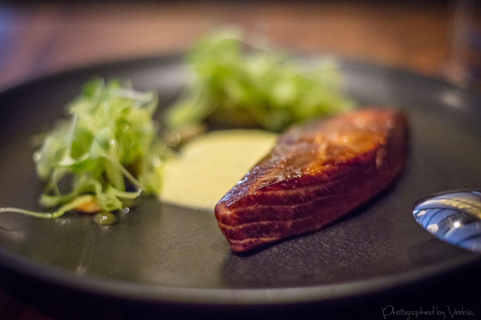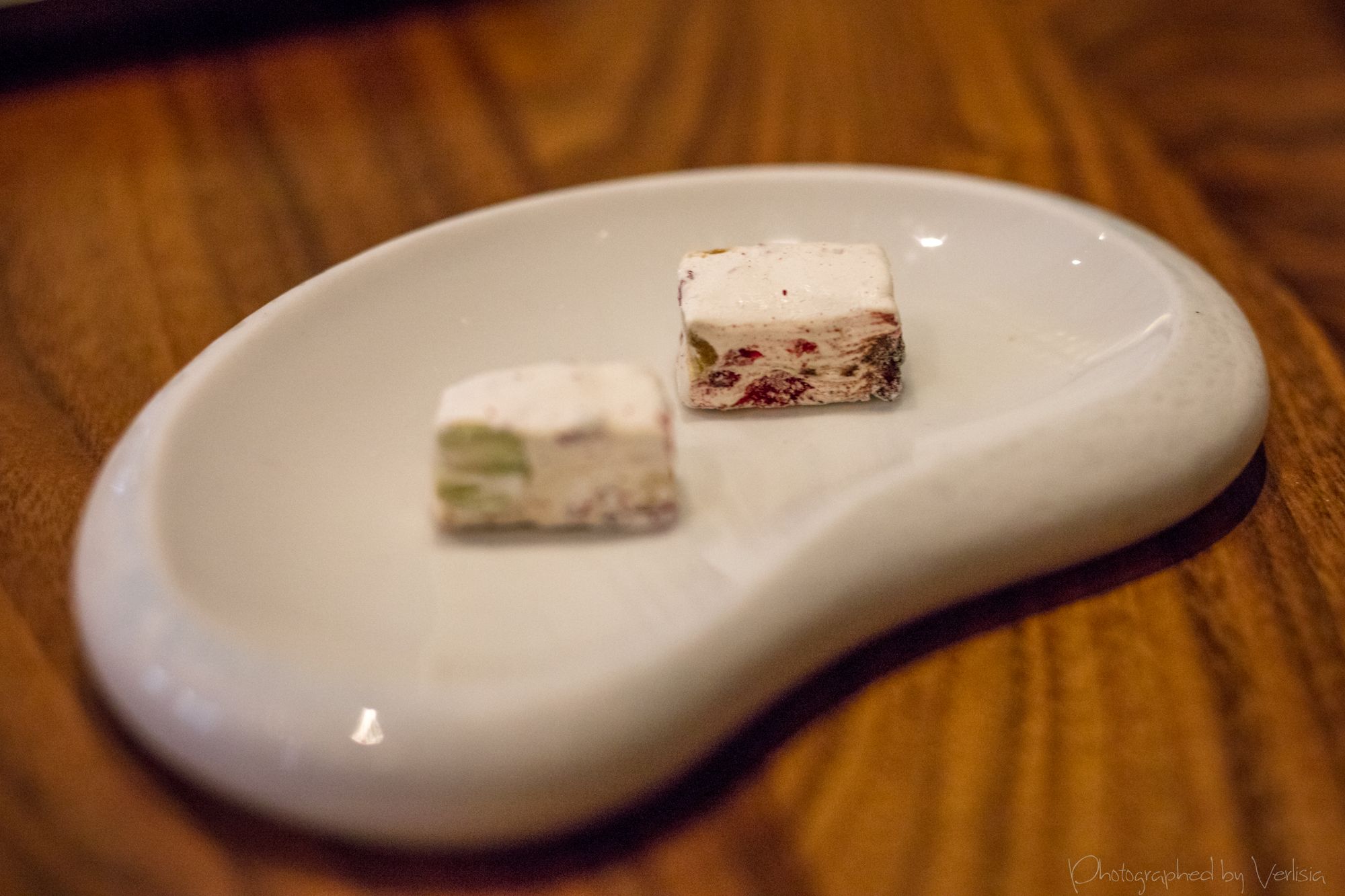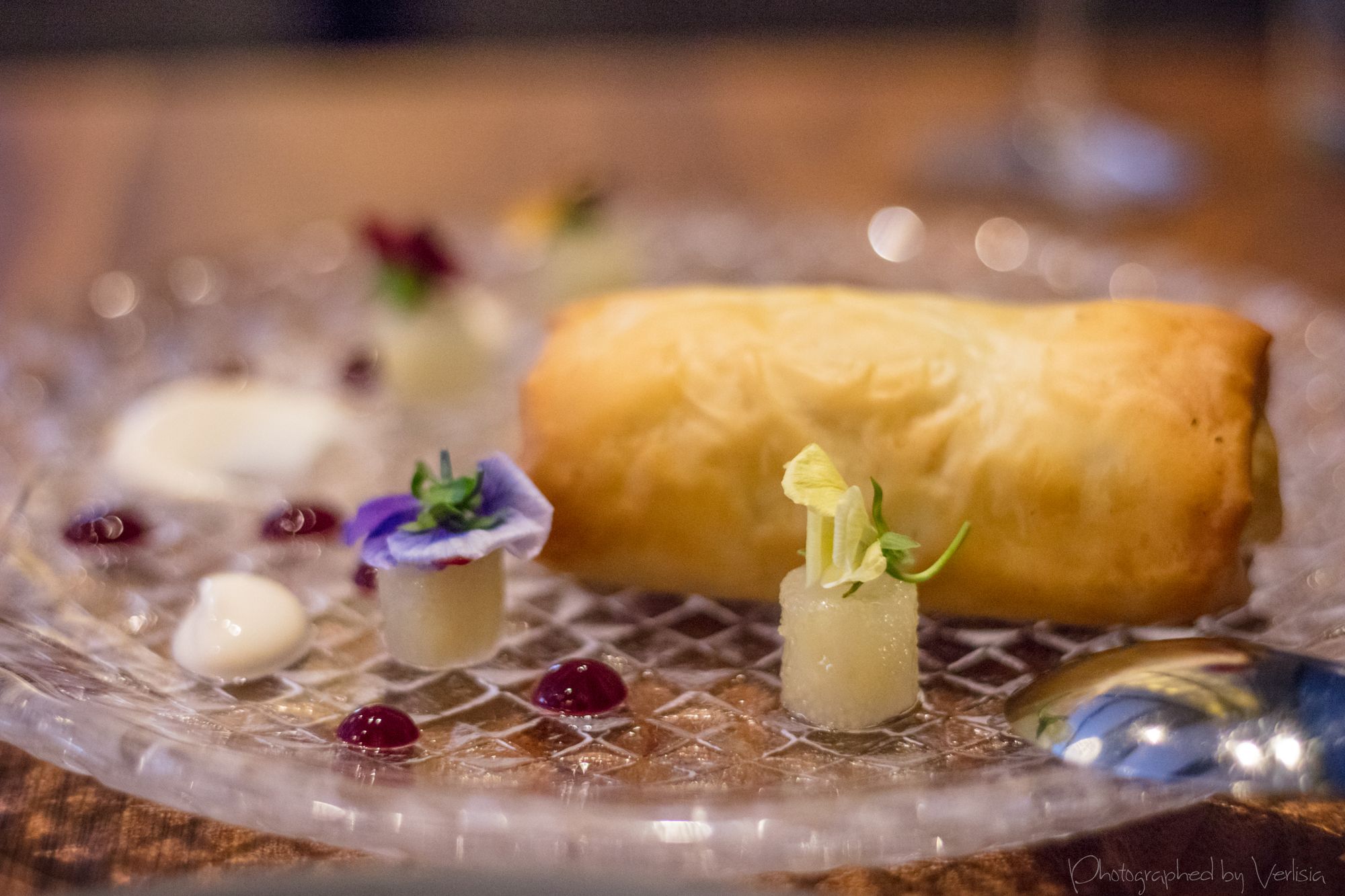 Strawberry + Cardamon (strawberry shrub . orange . green cardamom . soda), King Over Waters (grand marnier . laphroaig islay scotch . cranberry liqueur . lemon juice . moroccan spiced honey . aleppo cocoa nib bitters . lemon oil), Salmon (fennel . blood orange . olive . fresh z'hug)Basteeya (duck . asian pear . lemon verbena . crème fraîche . almond), Branzino (chanterelle . corn . summer squash . shrimp), Lamb (lentil . rutabaga . maitake . eucalyptus . black lime)Chocolate & Dukkah (hazelnut . sesame . shiso), Sugar Puffs (blueberry . preserved lemon . buckwheat), Sweets