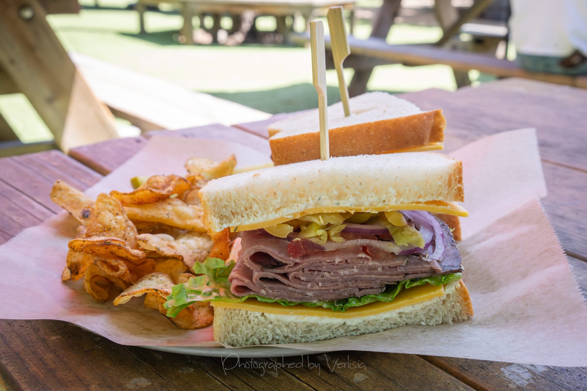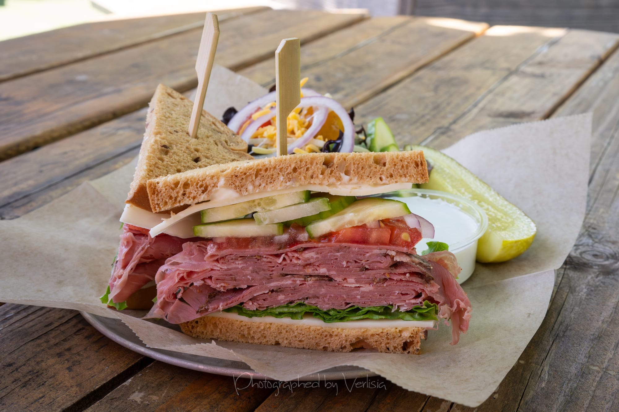 Mt. Reba on Gluten Free Bread (Pastrami, Provolone, Honey Mustard, Garlic Mayo, Cucumbers, Tomatoes, Red Onions & Lettuce); The Bear (Roast Beef, Cheddar, Bear Dip Spread, Tomatoes, Red Onions, Pepperoncisins & Lettuce on French)