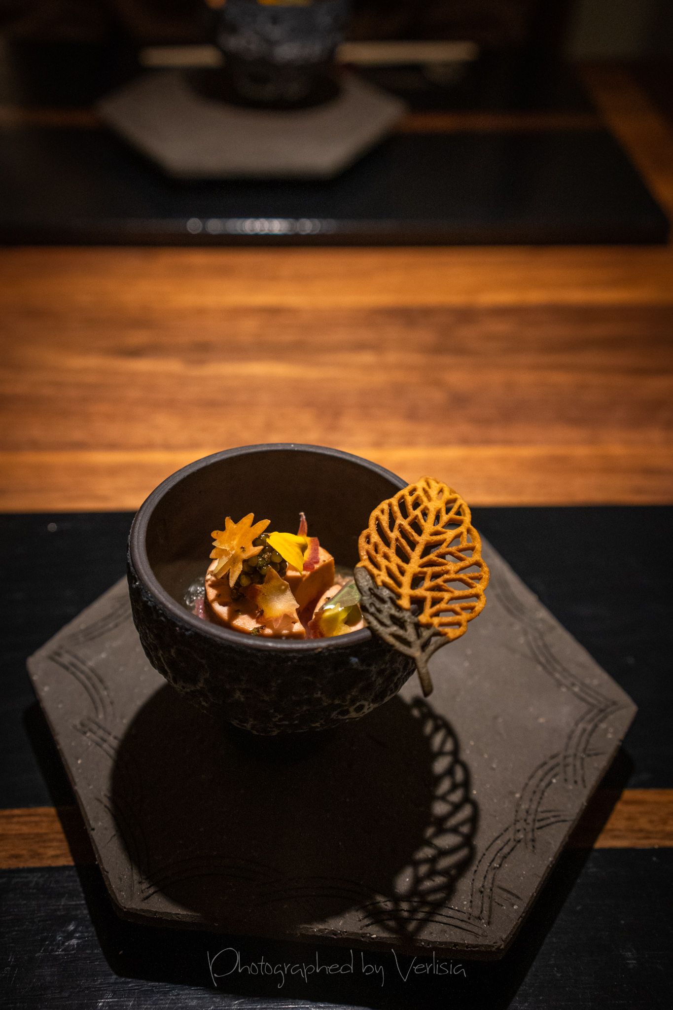 Tea, Sakizuke (Ankimo, Toro, Smoked Tuna Bacon, Tosazu, Caviar, Red Bell Pepper Tuille)