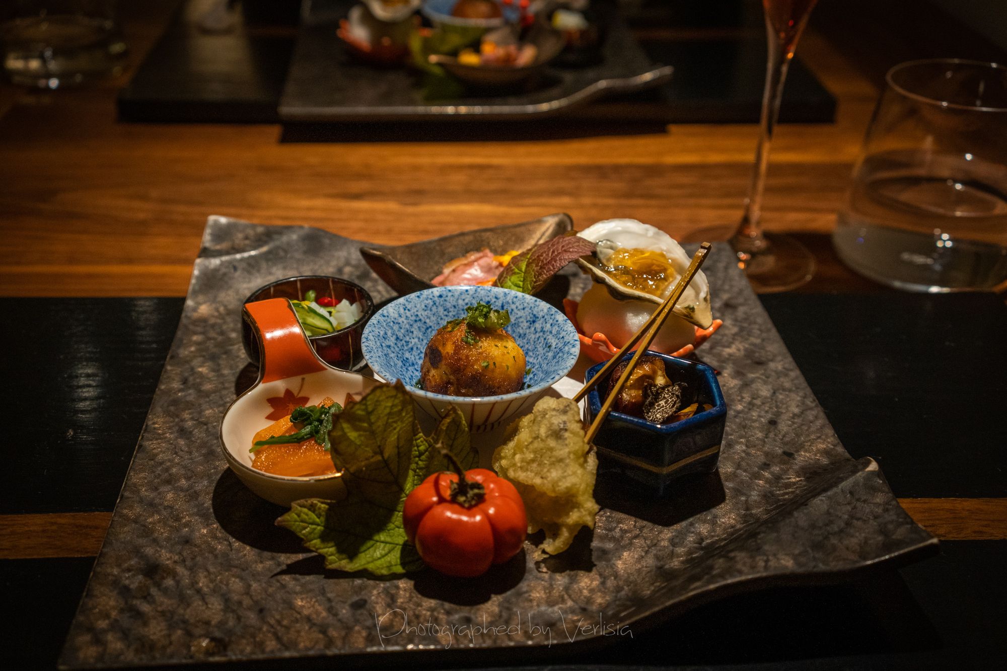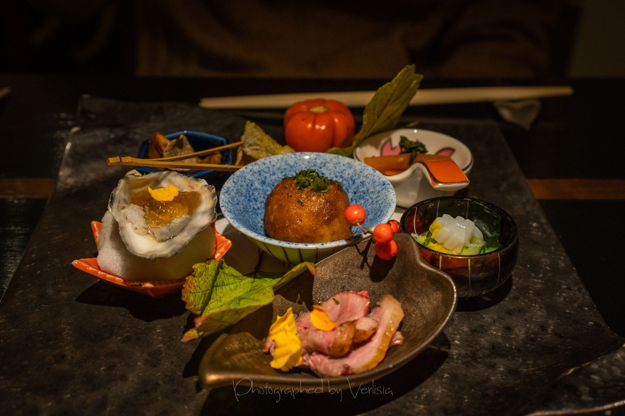 Zensai (Shiitake Tempura, Persimmon + Shungiku, Lobster "Tako Yako", Kushi Oyster + Tosazu, Ika Nuta + Chrysanthemum Salad, Peking Duck, Satsuma Imo + Soy Truffle Honey Glaze