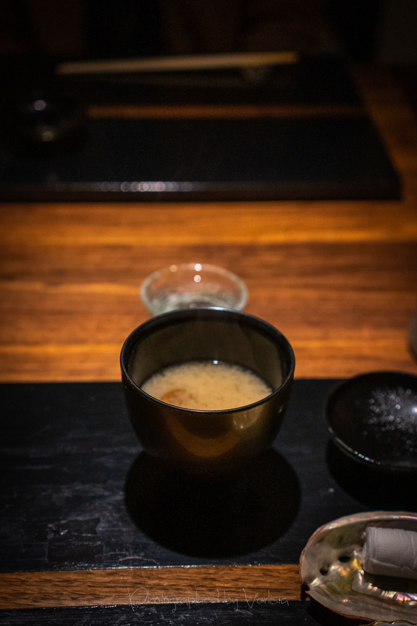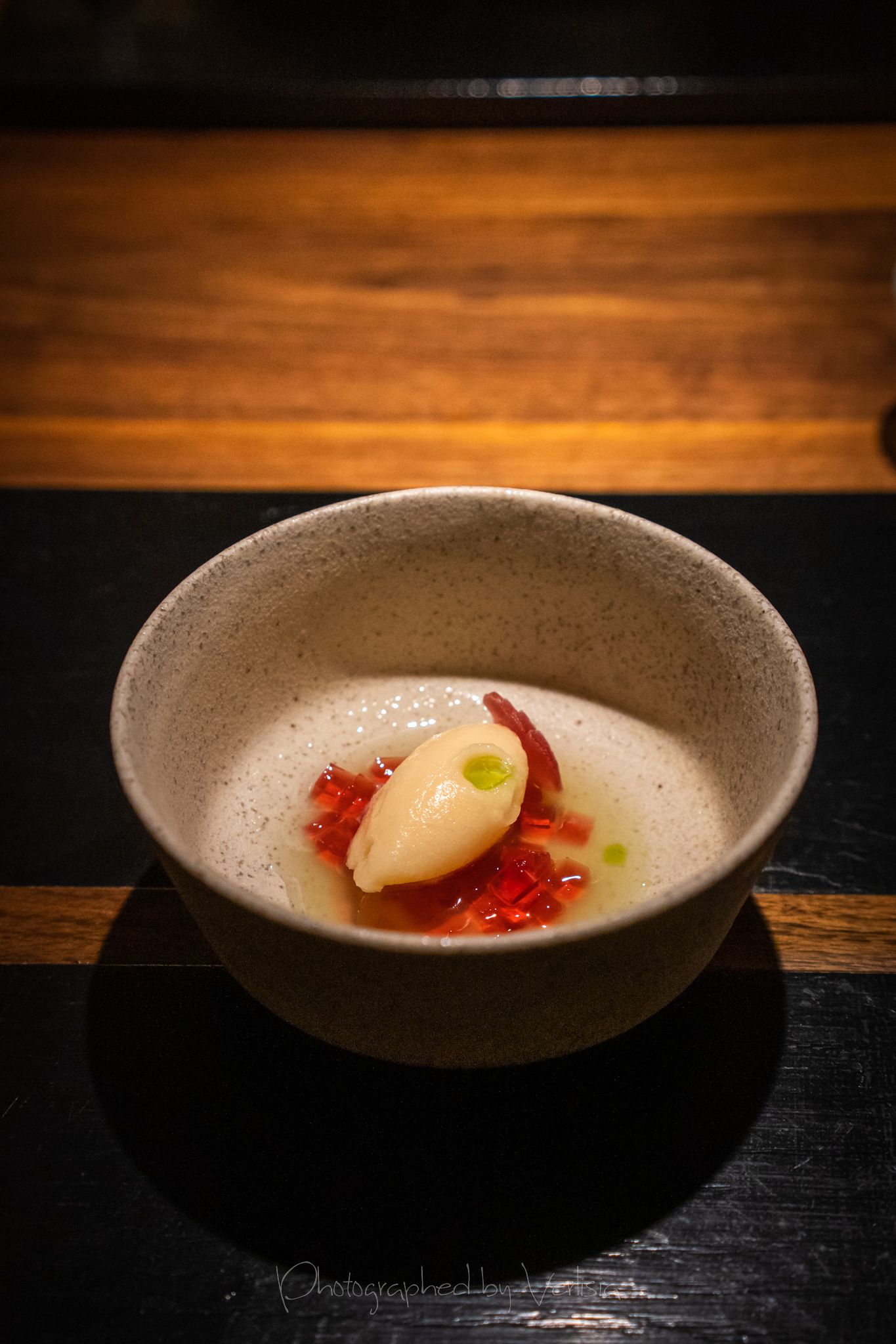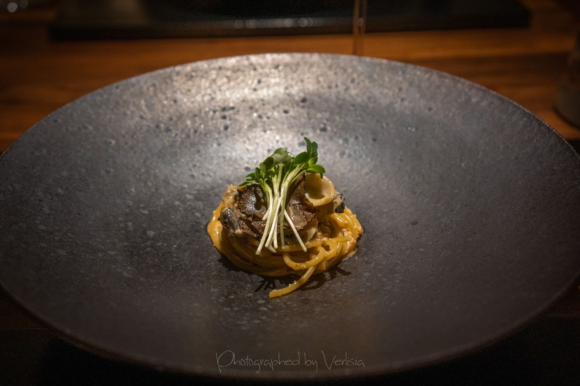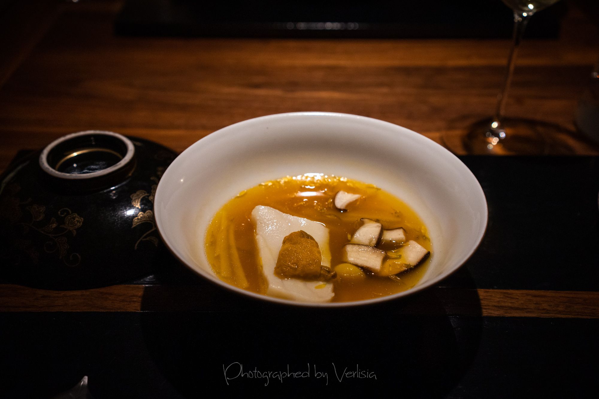 Yakimono (Adamai, Charred Leek, Shugiku, Dill, Ginger Lime, Negi Dare), Mushimono (Sea Bass, Uni, Kikunohanam, Shiitakem, Yama Imo, Kabocha, Chrysanthemum Broth), Shiizakana (Spaghetti, Abalone, Pickled Cod Roe, Truffle)