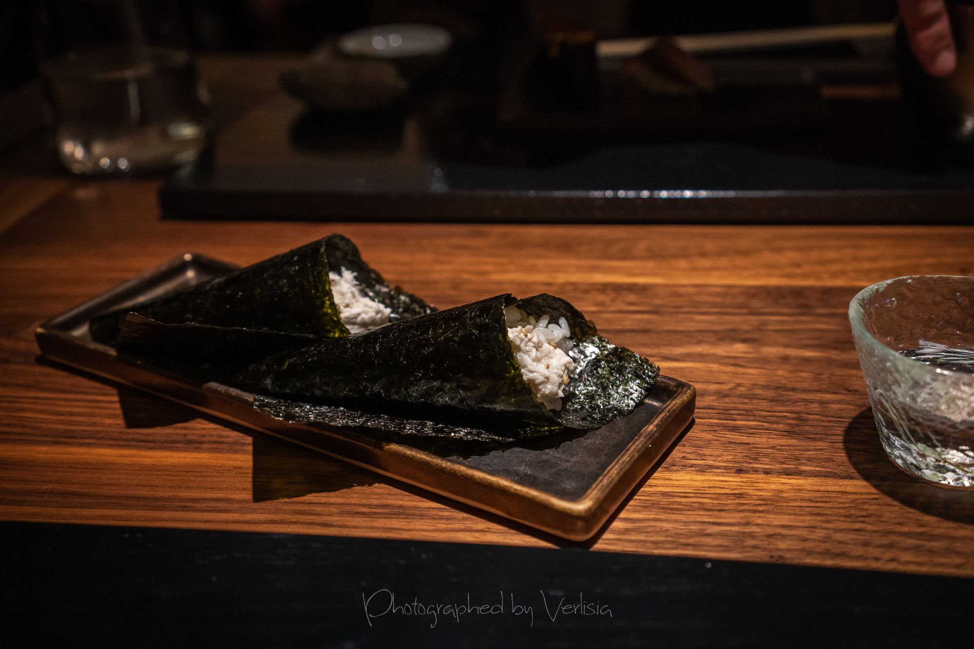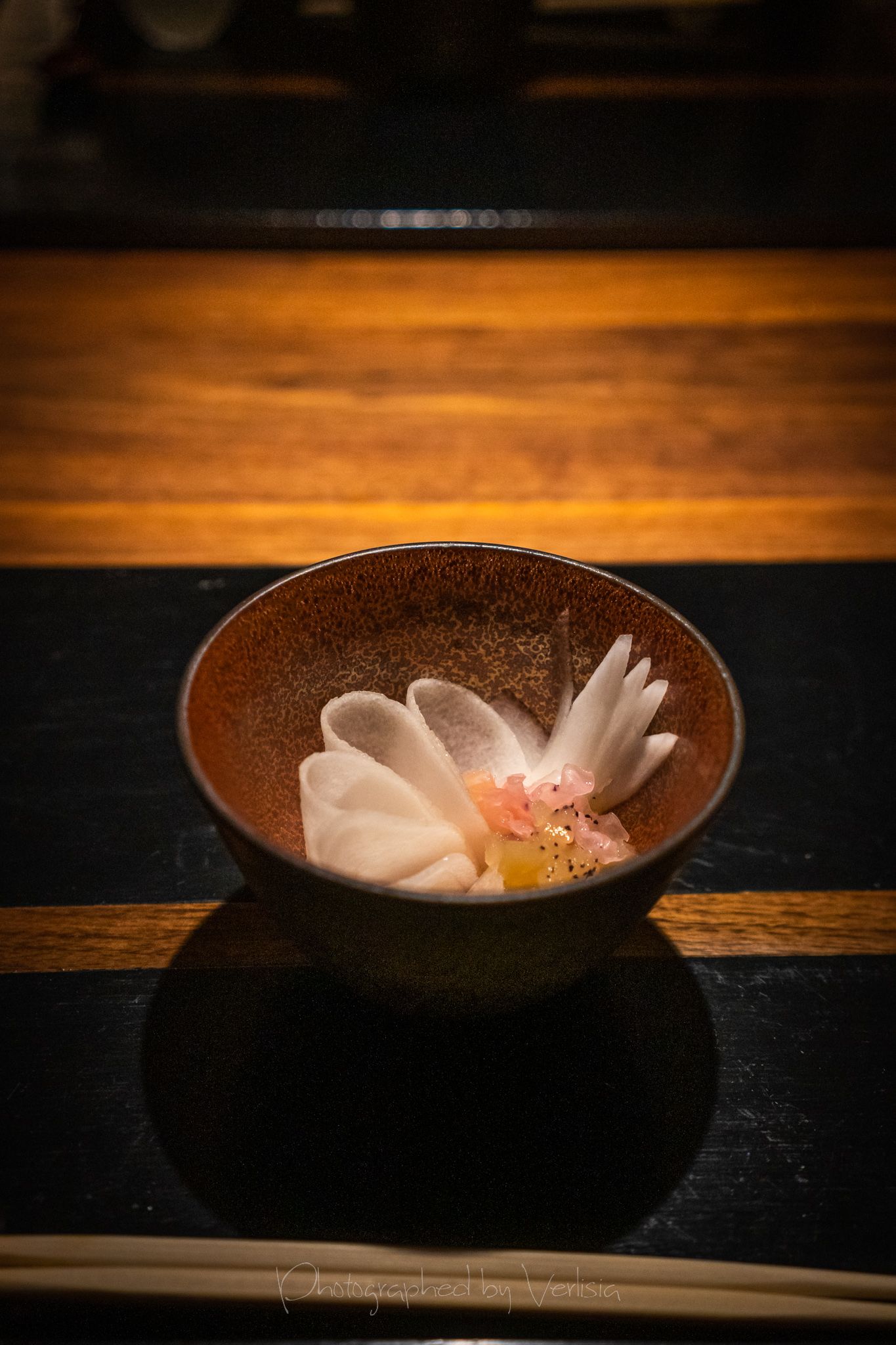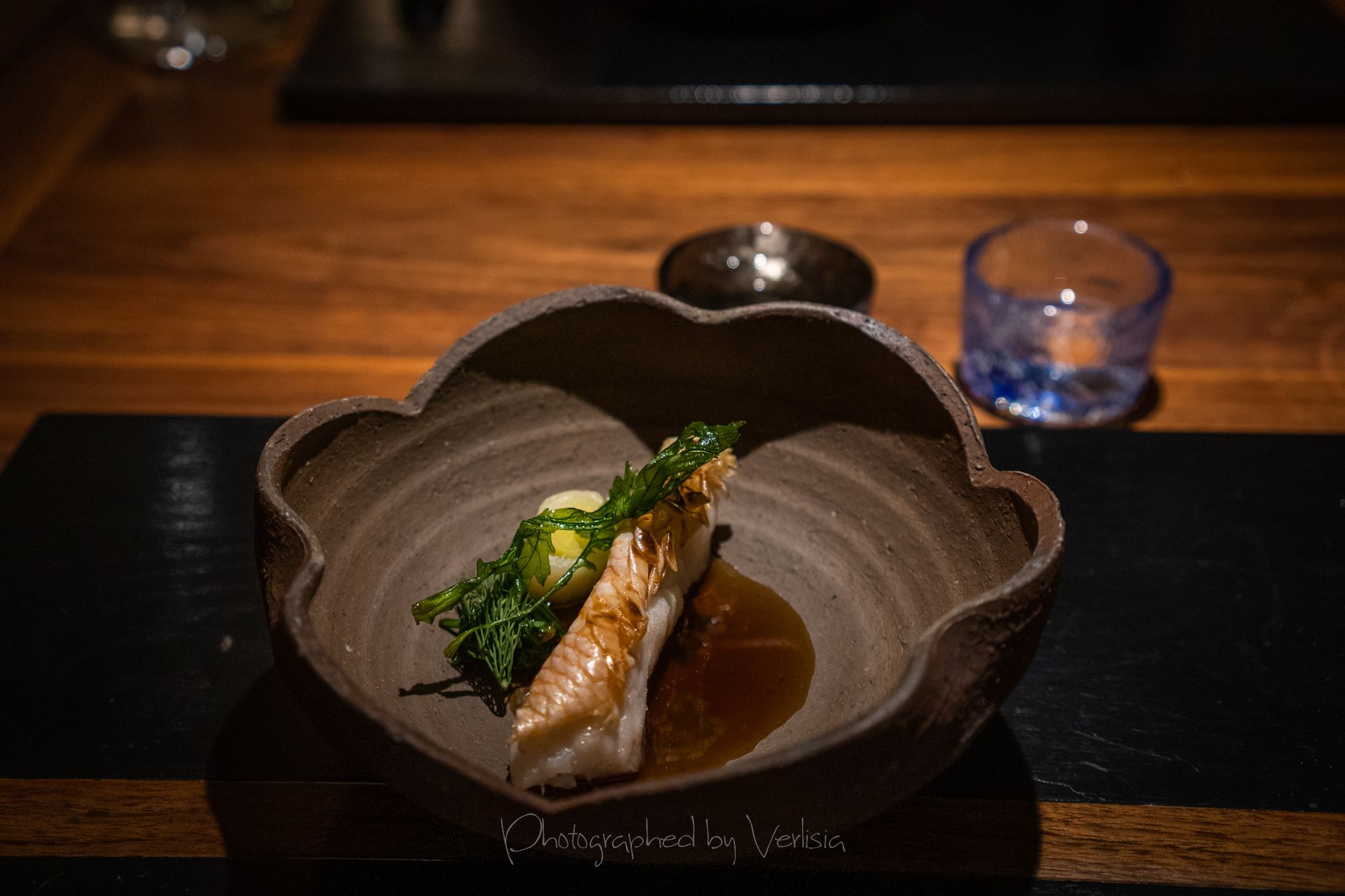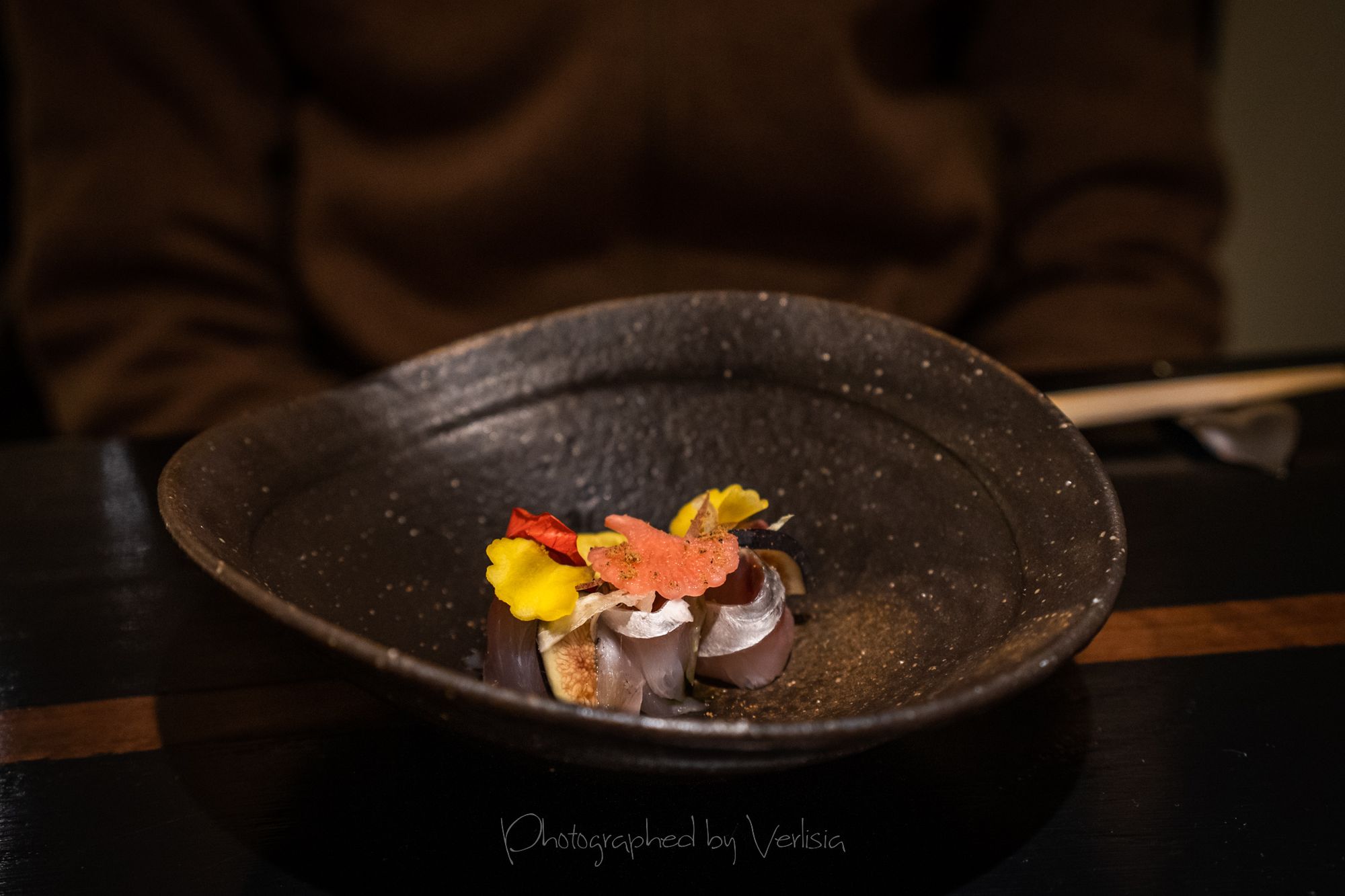 Yakimono (Adamai, Charred Leek, Shugiku, Dill, Ginger Lime, Negi Dare), Mushimono (Sea Bass, Uni, Kikunohanam, Shiitakem, Yama Imo, Kabocha, Chrysanthemum Broth), Shiizakana (Spaghetti, Abalone, Pickled Cod Roe, Truffle)