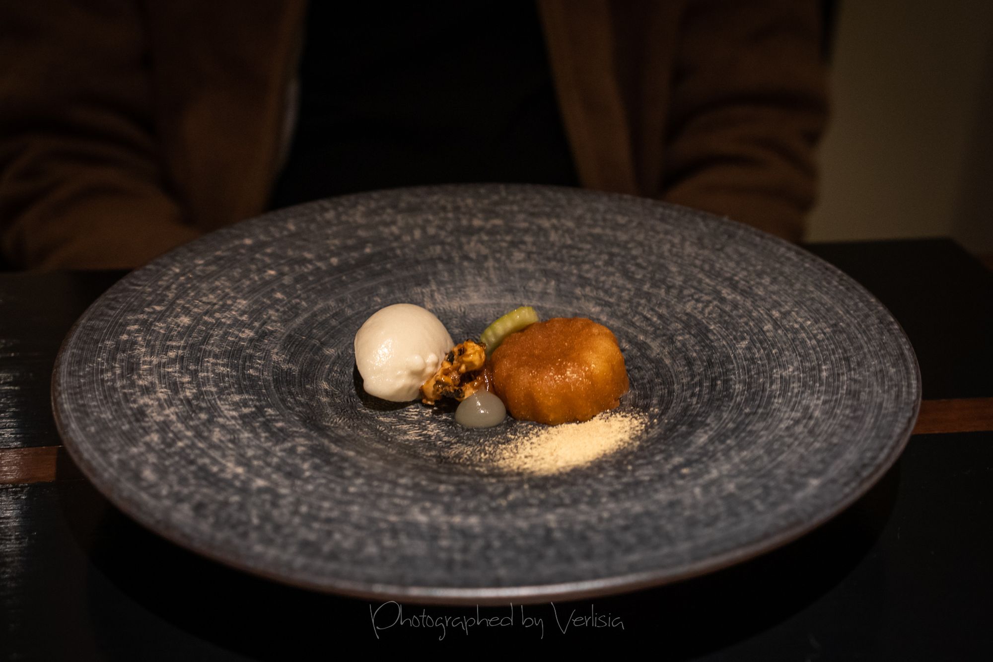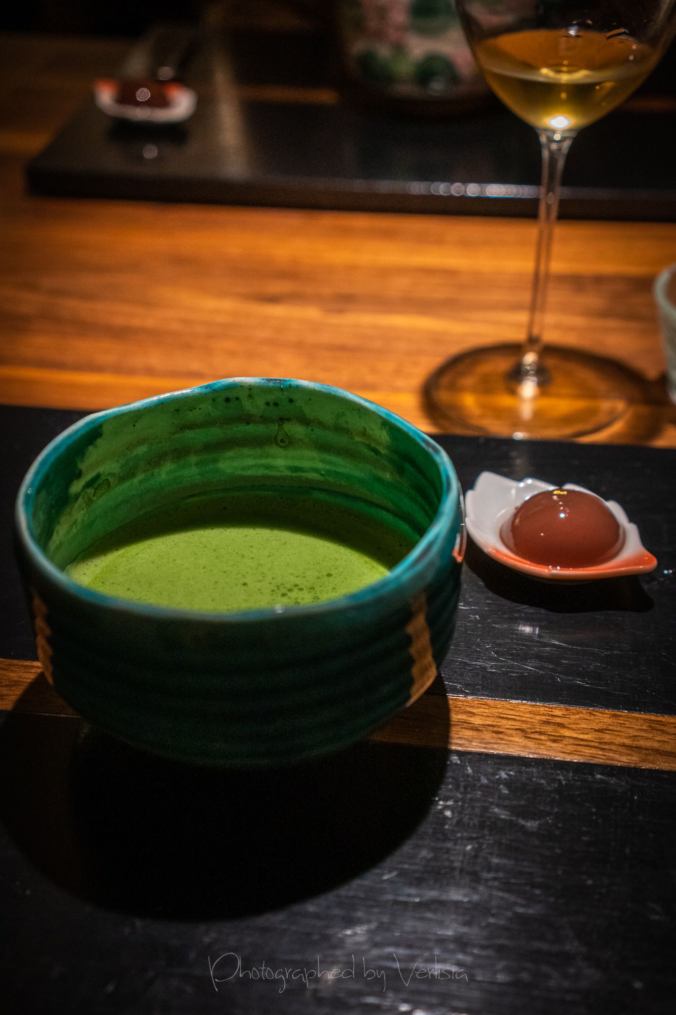 Mizumono (Sugar Kiss Melon Sorbet, Cranberry Ice & Gelee, Lemon Verbena Oil, Honeydew Juice), Mizumono (Rum Cake, Green Apple Amazake Ice Cream, Green Apple Mirin Gel, Caramel Hazelnut Praline, Kinako), Macha and Wagashi