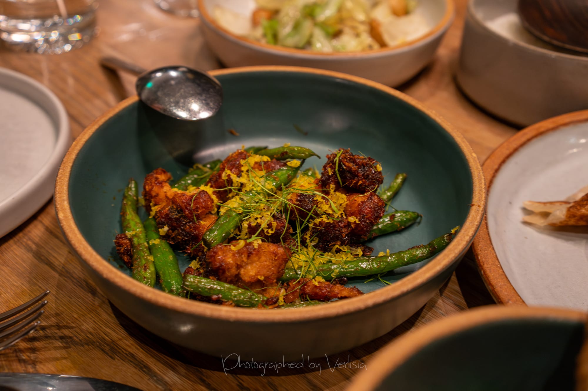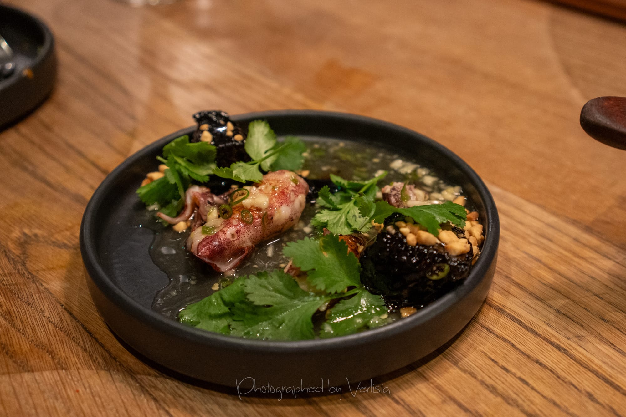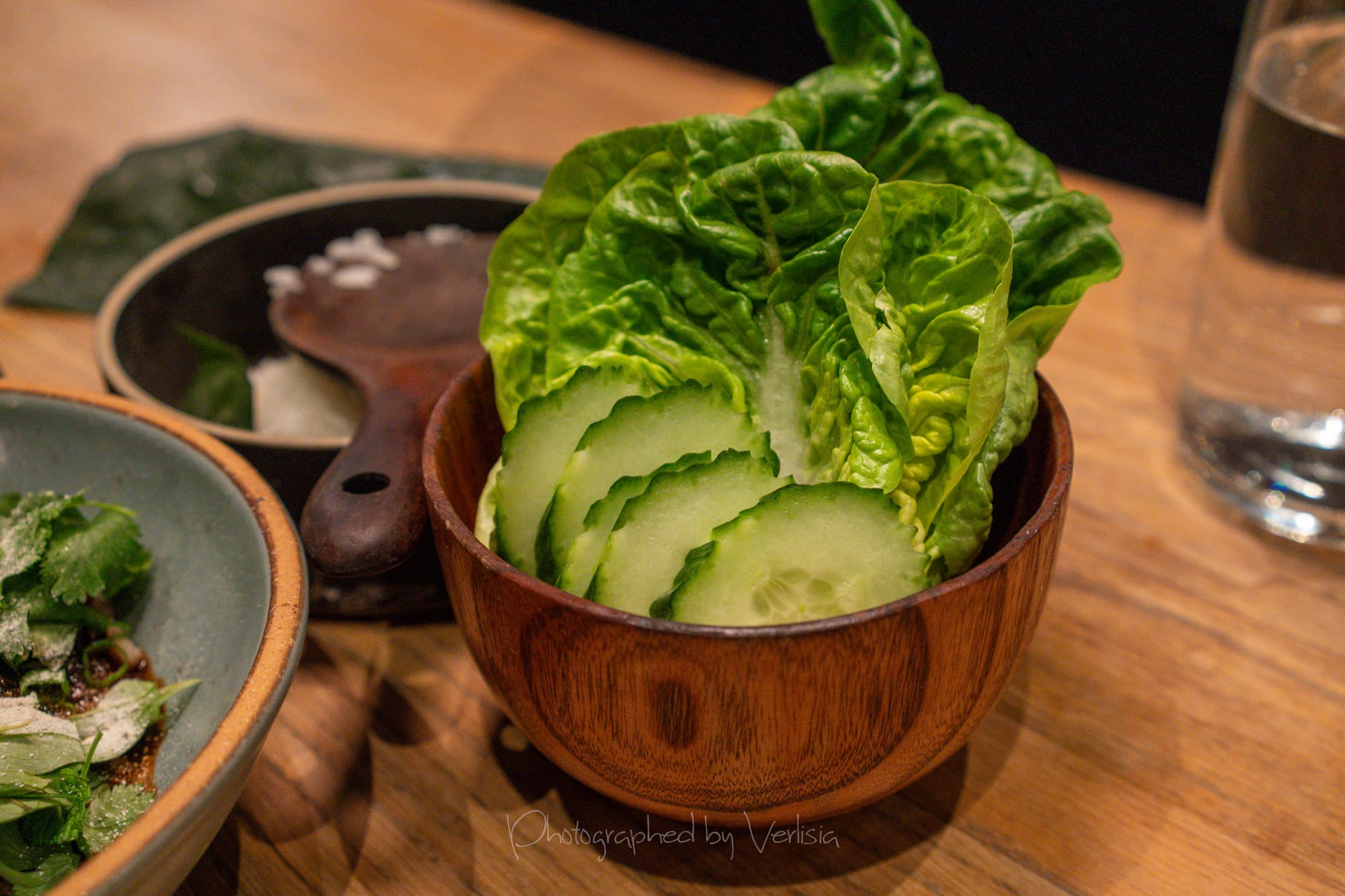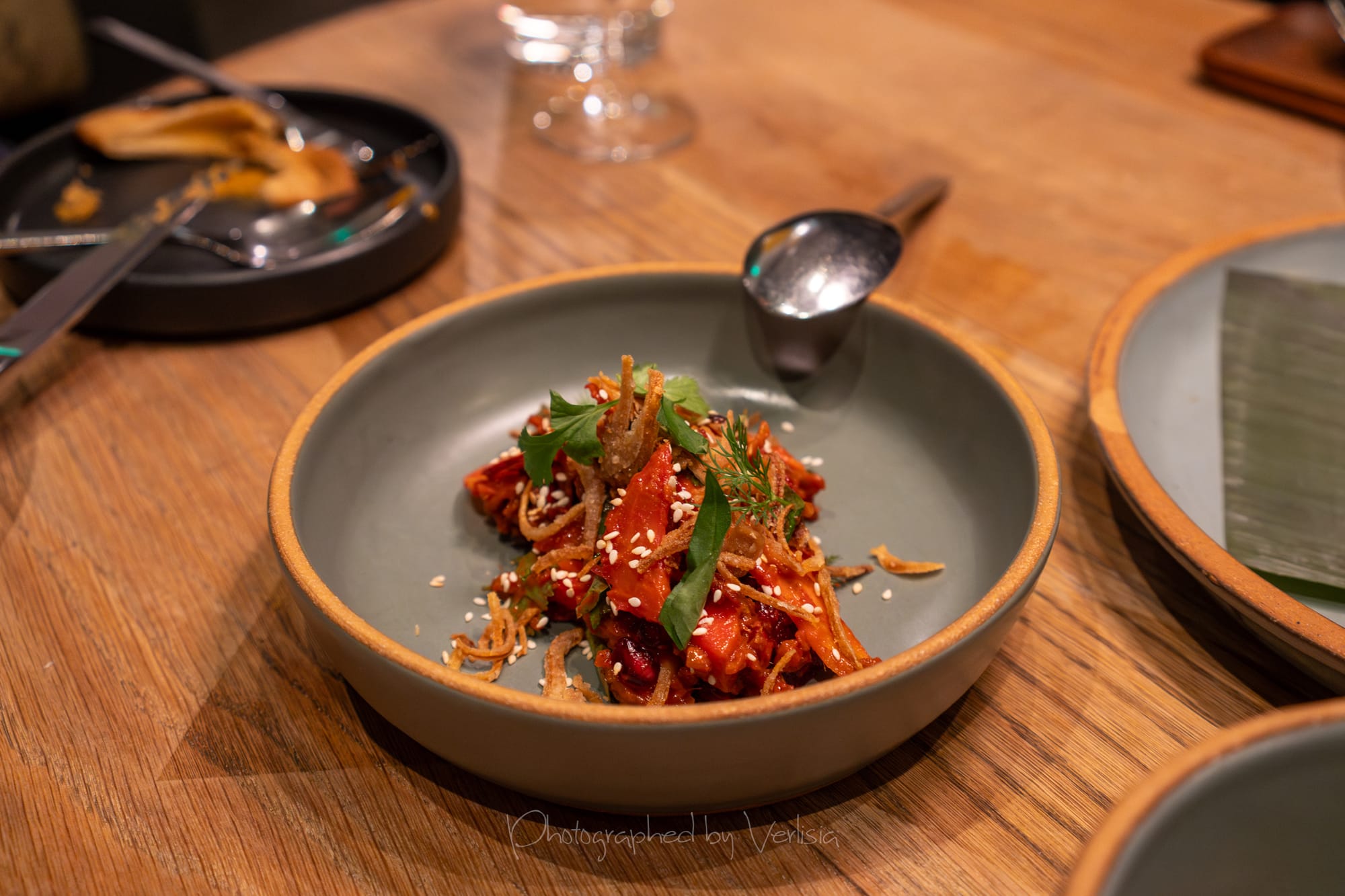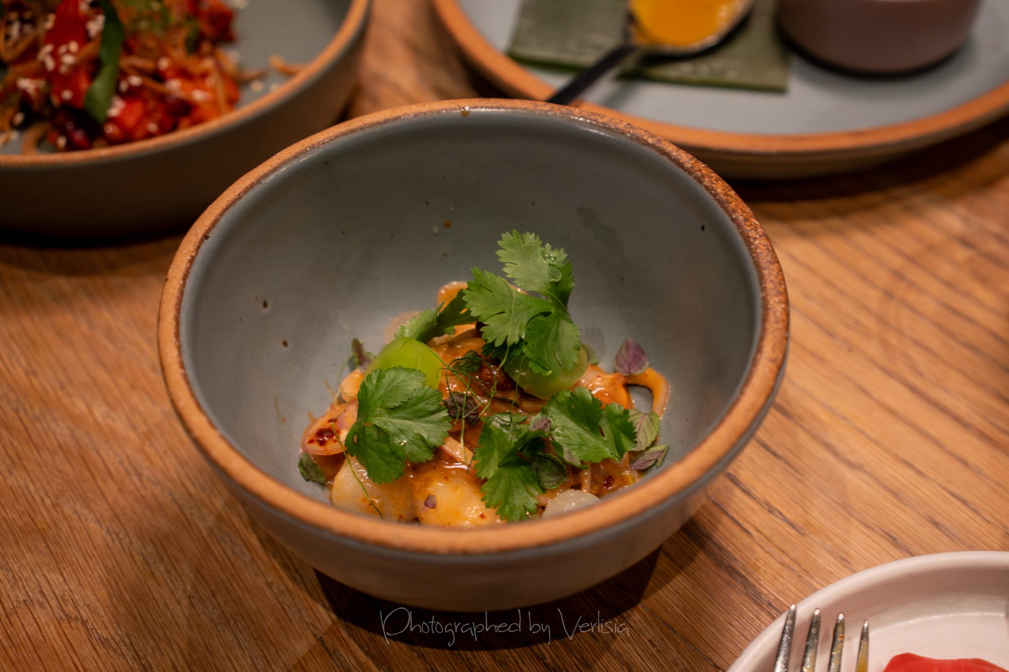 Yum Tawai (salad of root vegetables, tart fruits & herbs in a curried peanut dressing with sesame seeds), Scallop Yum Gati (lightly cured scallops & shinko pear dressed in coconut milk + chili jam with cashews, celtuce, chili & herb)