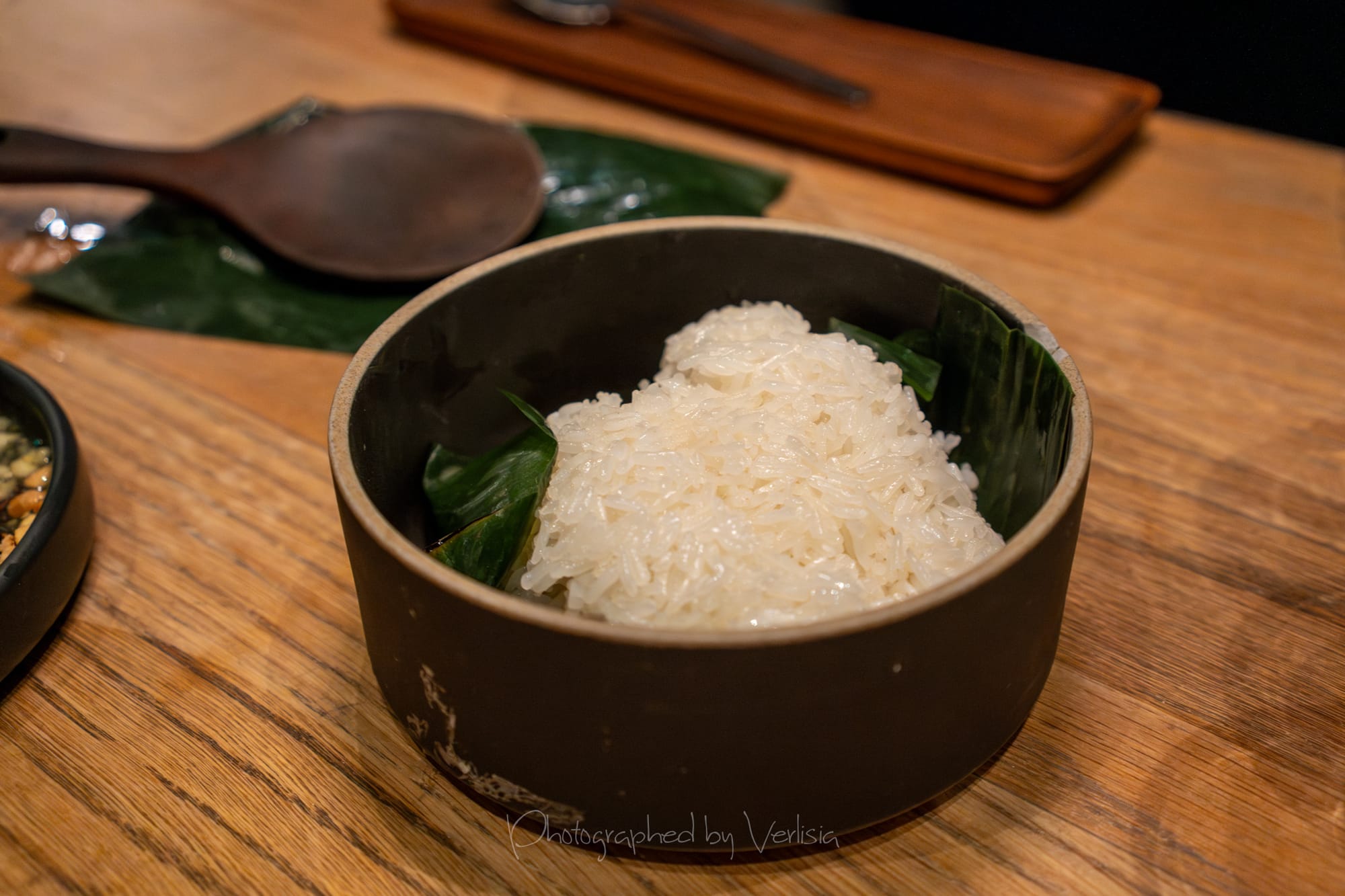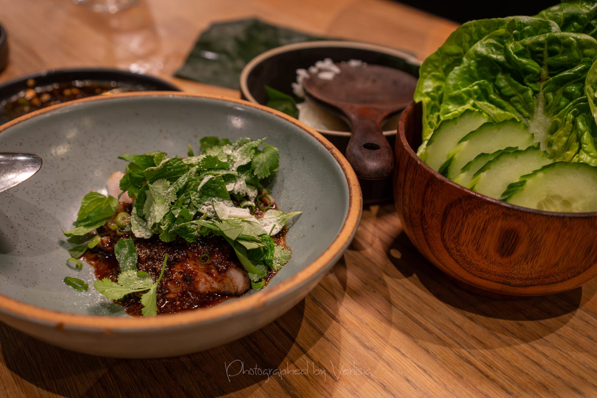 Namtok Moo (grilled pork chop, slathered in nam jim jaew sauce, topped with herbs & toasted rice powder. served with sticky rice & lettuce to wrap)