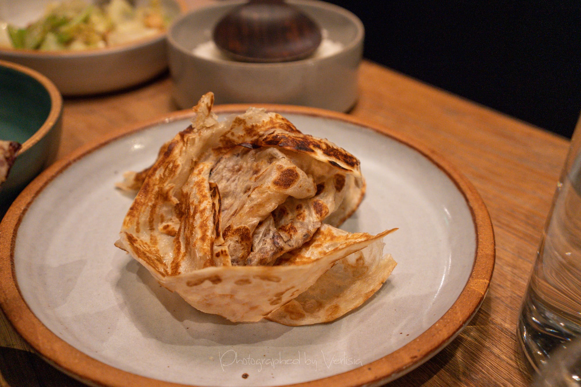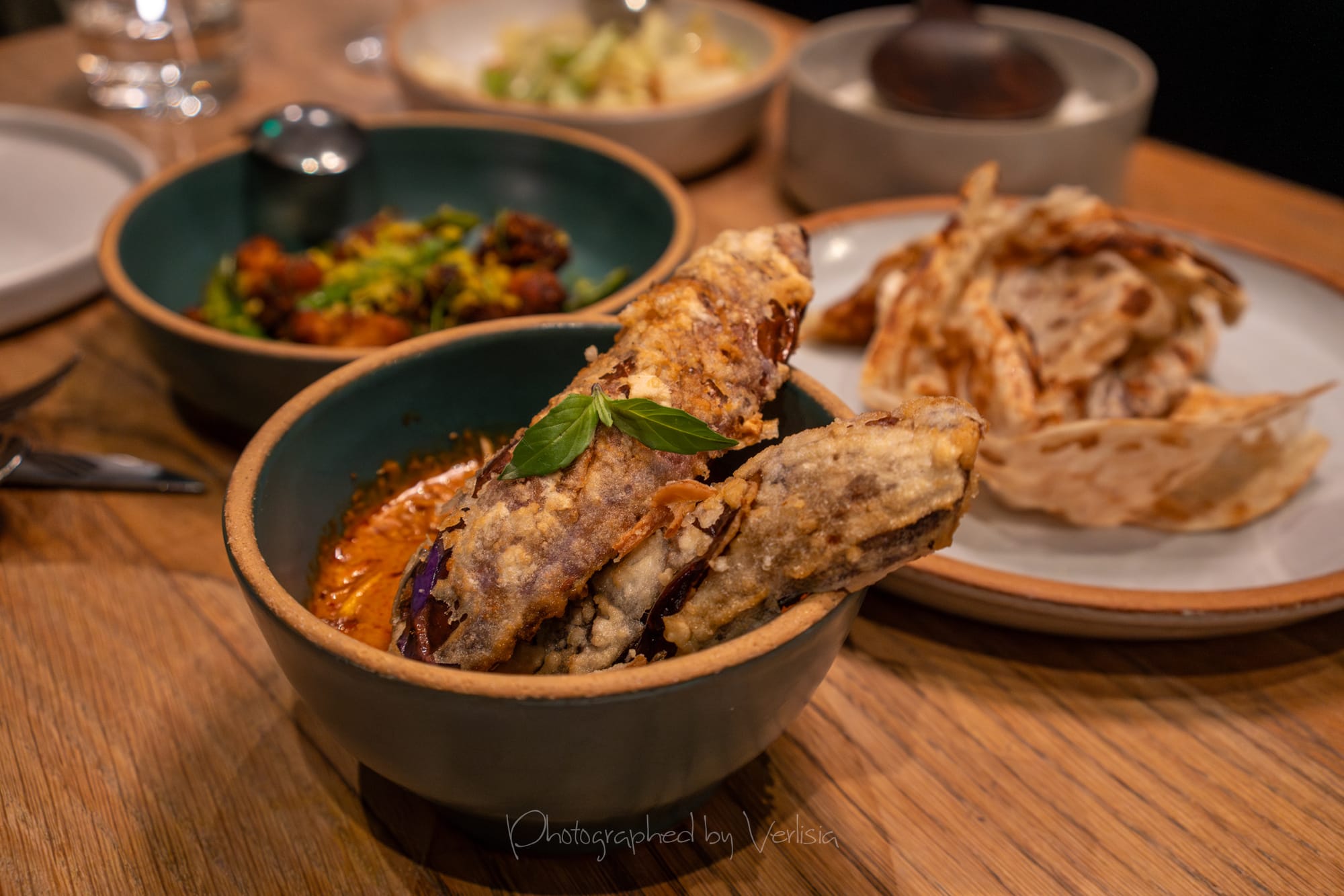 Gaeng Bumbai Aubergine (crispy eggplant in spicy bumbai curry with basil & crispy shallots), Roti