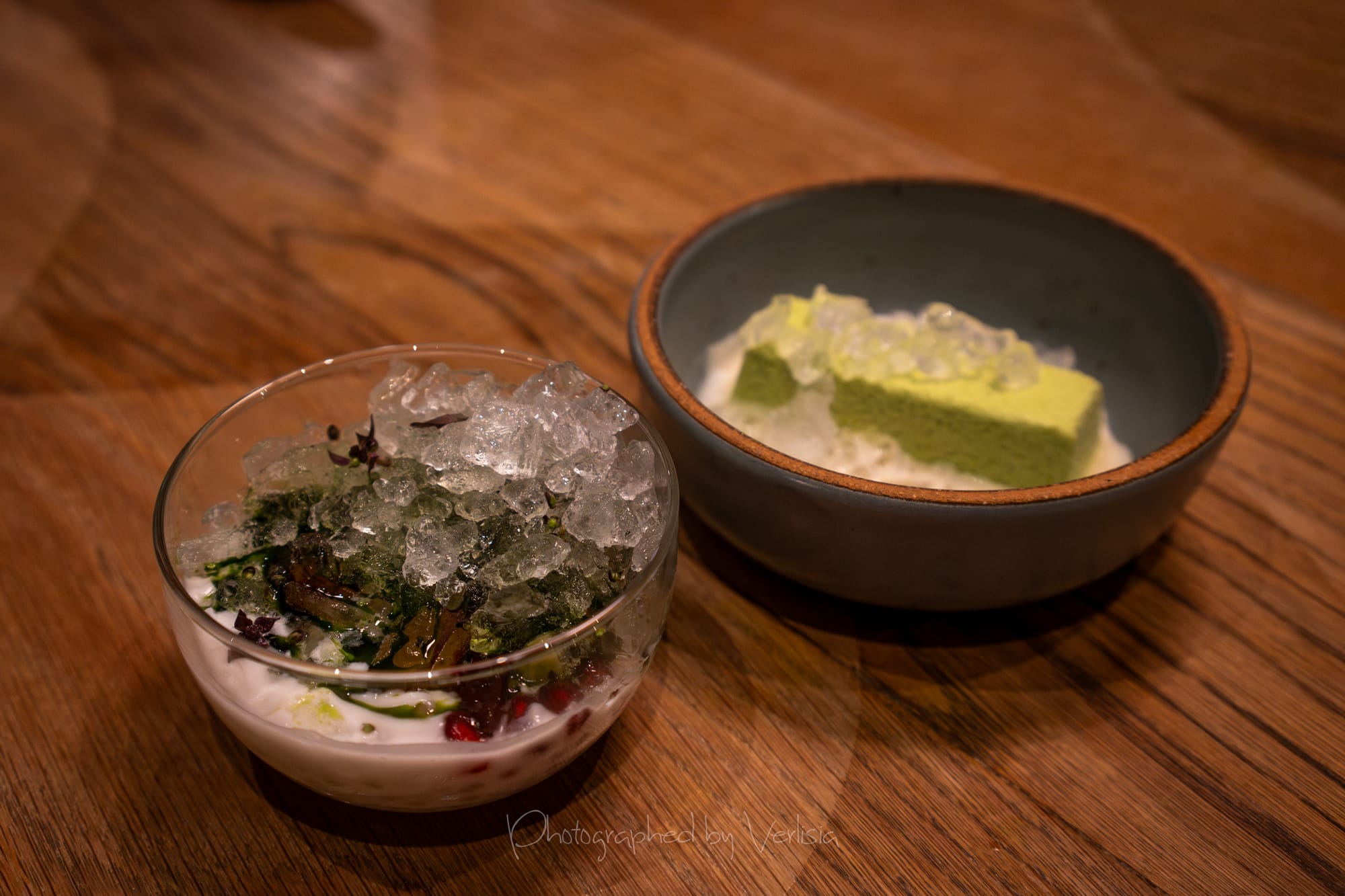 Wan Yen (strawberry & raspberry, tapioca pearls & jellies in salted coconut cream under crushed ice), Dreaming of Lod Chong (pandan parfait, salted coconut cream, scented salt, ice)