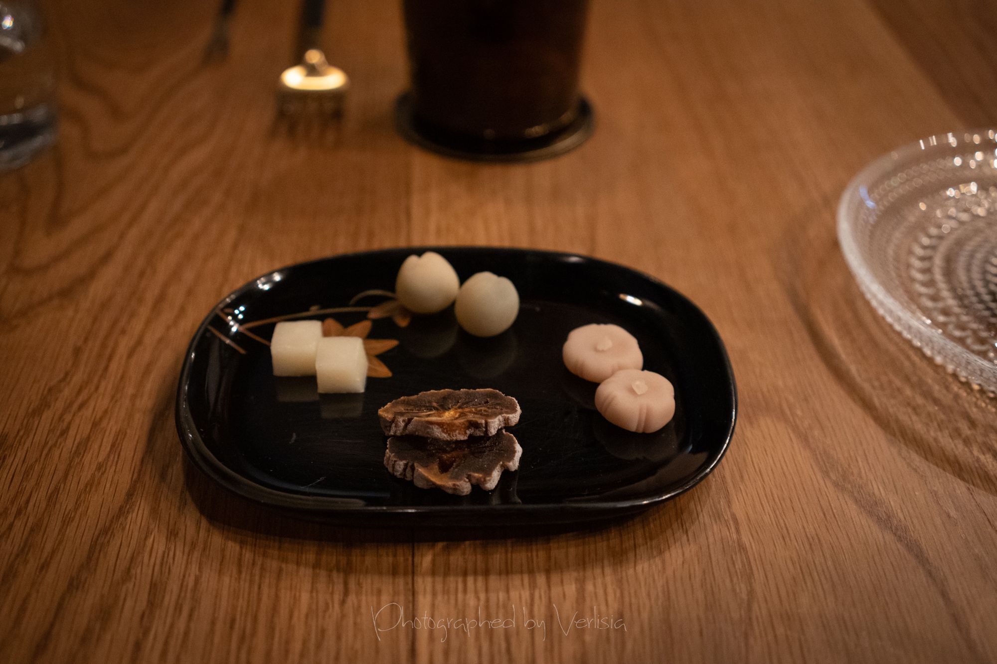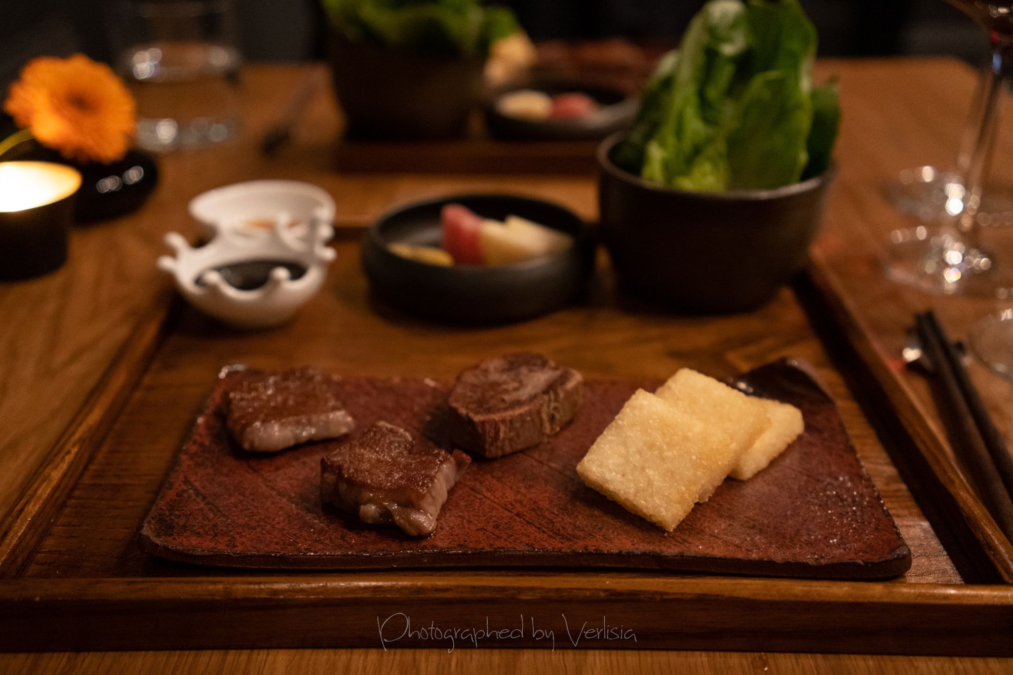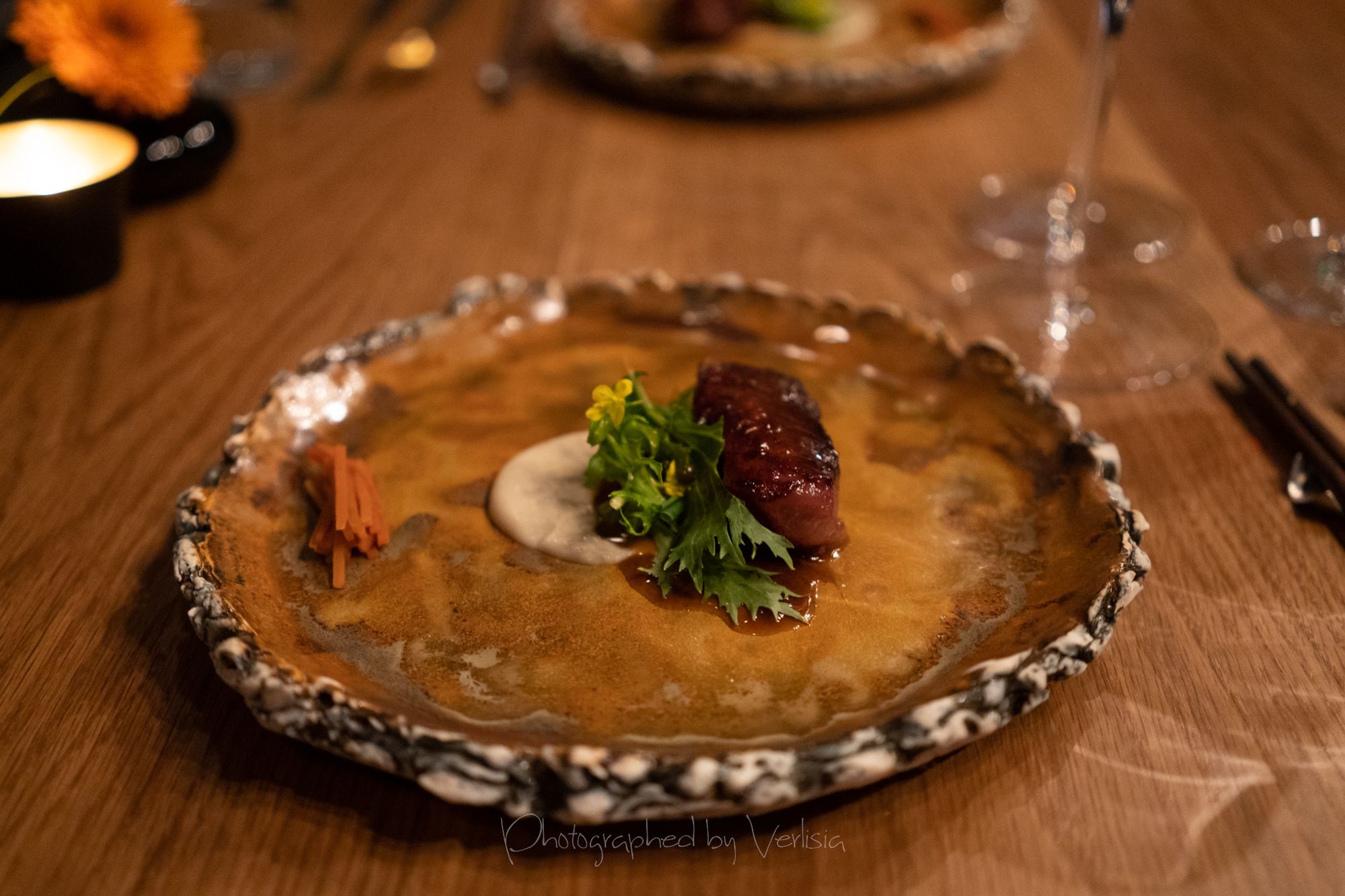 A5 Wagyu Supplemment - Tongue, Ribeye, Cap of RibeyeMandarin | yogurt | chamomile, Habucha (Sicklepod), Pineapple cake | bourbon ice cream | grilled pineappleAssorted wagashiWine Pairing